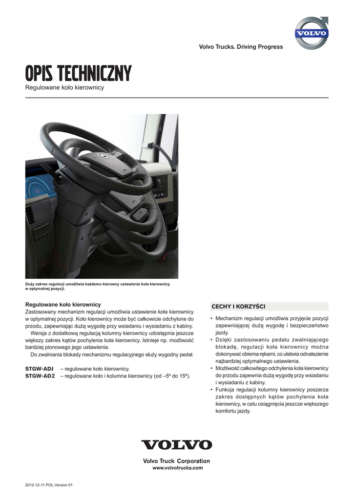 Volvo Trucks. Driving Progress OPIS TECHNICZNY Regulowane koło kierownicy Duży zakres regulacji umożliwia każdemu kierowcy ustawienie koła kierownicy w optymalnej pozycji. Regulowane koło kierownicy Zastosowany mechanizm regulacji umożliwia ustawienie koła kierownicy w optymalnej pozycji. Koło kierownicy może być całkowicie odchylone do przodu, zapewniając dużą wygodę przy wsiadaniu i wysiadaniu z kabiny. Wersja z dodatkową regulacją kolumny kierownicy udostępnia jeszcze większy zakres kątów pochylenia koła kierownicy. Istnieje np. możliwość bardziej pionowego jego ustawienia. Do zwalniania blokady mechanizmu regulacyjnego służy wygodny pedał. STGW-ADJ – regulowane koło kierownicy. STGW-AD2 – regulowane koło i kolumna kierownicy (od –5º do 15º). 2012-12-11 POL Version 01 Cechy i korzyści • Mechanizm regulacji umożliwia przyjęcie pozycji zapewniającej dużą wygodę i bezpieczeństwo jazdy. • Dzięki zastosowaniu pedału zwalniającego blokadę, regulacji koła kierownicy można dokonywać obiema rękami, co ułatwia odnalezienie najbardziej optymalnego ustawienia. • Możliwość całkowitego odchylenia koła kierownicy do przodu zapewnia dużą wygodę przy wsiadaniu i wysiadaniu z kabiny. • Funkcja regulacji kolumny kierownicy poszerza zakres dostępnych kątów pochylenia koła kierownicy, w celu osiągnięcia jeszcze większego komfortu jazdy.