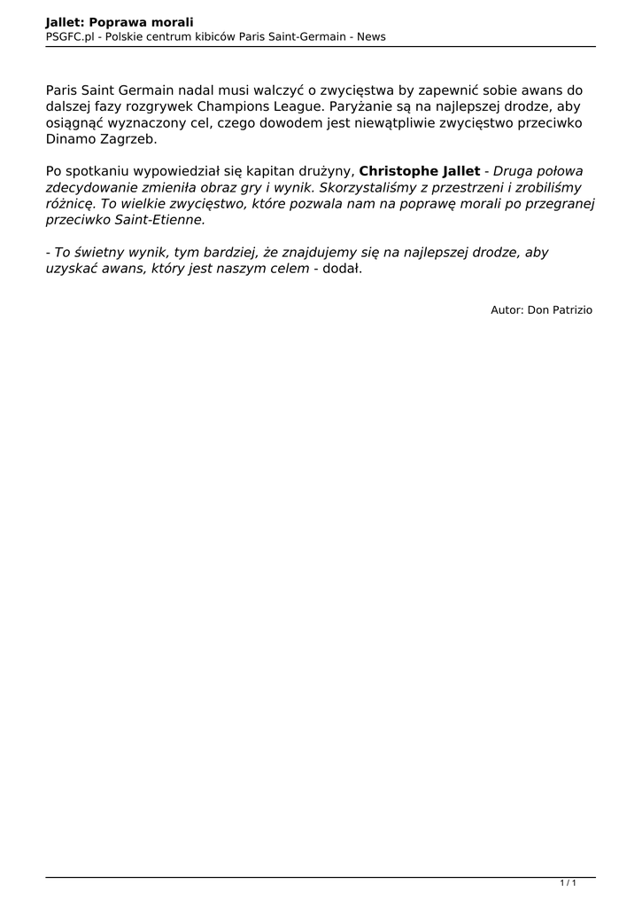 Jallet: Poprawa morali PSGFC.pl - Polskie centrum kibiców Paris Saint-Germain - News Paris Saint Germain nadal musi walczyć o zwycięstwa by zapewnić sobie awans do dalszej fazy rozgrywek Champions League. Paryżanie są na najlepszej drodze, aby osiągnąć wyznaczony cel, czego dowodem jest niewątpliwie zwycięstwo przeciwko Dinamo Zagrzeb. Po spotkaniu wypowiedział się kapitan drużyny, Christophe Jallet - Druga połowa zdecydowanie zmieniła obraz gry i wynik. Skorzystaliśmy z przestrzeni i zrobiliśmy różnicę. To wielkie zwycięstwo, które pozwala nam na poprawę morali po przegranej przeciwko Saint-Etienne. - To świetny wynik, tym bardziej, że znajdujemy się na najlepszej drodze, aby uzyskać awans, który jest naszym celem - dodał. Autor: Don Patrizio 1/1 Powered by TCPDF (www.tcpdf.org)