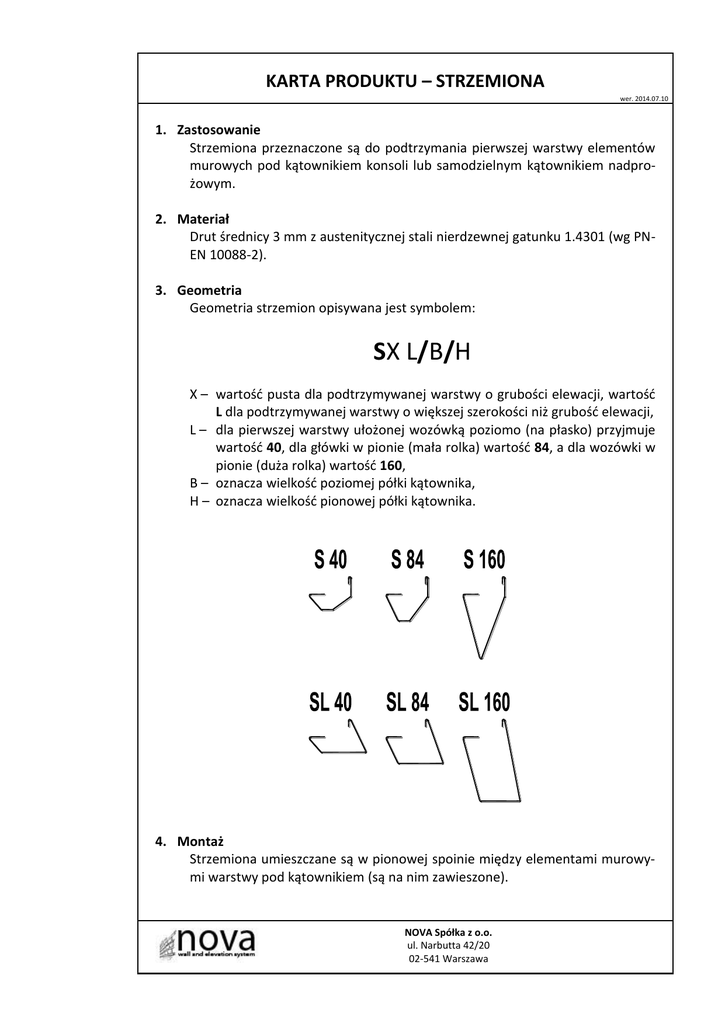 KARTA PRODUKTU – STRZEMIONA wer. 2014.07.10 1. Zastosowanie Strzemiona przeznaczone są do podtrzymania pierwszej warstwy elementów murowych pod kątownikiem konsoli lub samodzielnym kątownikiem nadprożowym. 2. Materiał Drut średnicy 3 mm z austenitycznej stali nierdzewnej gatunku 1.4301 (wg PNEN 10088-2). 3. Geometria Geometria strzemion opisywana jest symbolem: SX L/B/H X – wartość pusta dla podtrzymywanej warstwy o grubości elewacji, wartość L dla podtrzymywanej warstwy o większej szerokości niż grubość elewacji, L – dla pierwszej warstwy ułożonej wozówką poziomo (na płasko) przyjmuje wartość 40, dla główki w pionie (mała rolka) wartość 84, a dla wozówki w pionie (duża rolka) wartość 160, B – oznacza wielkość poziomej półki kątownika, H – oznacza wielkość pionowej półki kątownika. 4. Montaż Strzemiona umieszczane są w pionowej spoinie między elementami murowymi warstwy pod kątownikiem (są na nim zawieszone). NOVA Spółka z o.o. ul. Narbutta 42/20 02-541 Warszawa KARTA PRODUKTU – STRZEMIONA wer. 2014.07.10 W przypadku małej powierzchni styku (elementy murowe gładkie i ułożone „na płasko”) wraz ze strzemionami, należy stosować przetyczki zabezpieczające P 3/80 umieszczone w otworach bocznych płaszczyzn elementów murowych tuż nad linią strzemienia. W miejscach, gdzie dylatacja pionowa przecina nadproże (lub przebiega na krawędzi), należy zamiast strzemienia stosować klamrę K 3/100 wkładaną w otwór na bocznej płaszczyźnie elementu murowego i zahaczaną o kątownik/wieszak. 5. Dokumenty dopuszczenia do obrotu Deklaracja Producenta w odniesieniu do zatwierdzonej przez architekta obiektu Indywidualnej Dokumentacji Technicznej (Projektu Zamocowania Elewacji Murowanej) i w odniesieniu do dostarczonej partii elementów. NOVA Spółka z o.o. ul. Narbutta 42/20 02-541 Warszawa