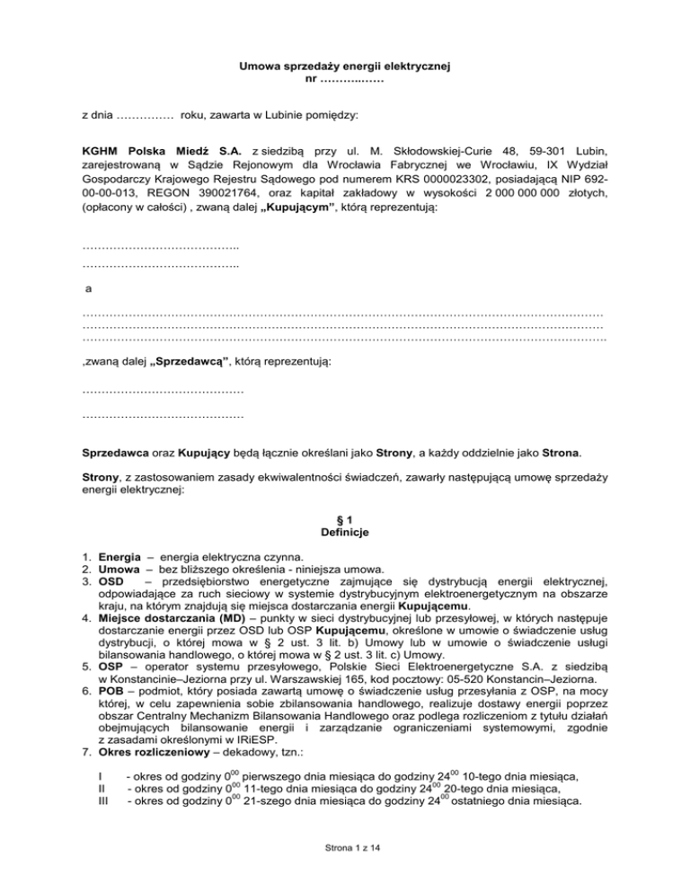 Umowa sprzedaży energii elektrycznej nr ………..…… z dnia …………… roku, zawarta w Lubinie pomiędzy: KGHM Polska Miedź S.A. z siedzibą przy ul. M. Skłodowskiej-Curie 48, 59-301 Lubin, zarejestrowaną w Sądzie Rejonowym dla Wrocławia Fabrycznej we Wrocławiu, IX Wydział Gospodarczy Krajowego Rejestru Sądowego pod numerem KRS 0000023302, posiadającą NIP 69200-00-013, REGON 390021764, oraz kapitał zakładowy w wysokości 2 000 000 000 złotych, (opłacony w całości) , zwaną dalej „Kupującym”, którą reprezentują: ………………………………….. ………………………………….. a ……………………………………………………………………………………………………………………… ……………………………………………………………………………………………………………………… ………………………………………………………………………………………………………………………. ,zwaną dalej „Sprzedawcą”, którą reprezentują: …………………………………… …………………………………… Sprzedawca oraz Kupujący będą łącznie określani jako Strony, a każdy oddzielnie jako Strona. Strony, z zastosowaniem zasady ekwiwalentności świadczeń, zawarły następującą umowę sprzedaży energii elektrycznej: §1 Definicje 1. Energia – energia elektryczna czynna. 2. Umowa – bez bliższego określenia - niniejsza umowa. 3. OSD – przedsiębiorstwo energetyczne zajmujące się dystrybucją energii elektrycznej, odpowiadające za ruch sieciowy w systemie dystrybucyjnym elektroenergetycznym na obszarze kraju, na którym znajdują się miejsca dostarczania energii Kupującemu. 4. Miejsce dostarczania (MD) – punkty w sieci dystrybucyjnej lub przesyłowej, w których następuje dostarczanie energii przez OSD lub OSP Kupującemu, określone w umowie o świadczenie usług dystrybucji, o której mowa w § 2 ust. 3 lit. b) Umowy lub w umowie o świadczenie usługi bilansowania handlowego, o której mowa w § 2 ust. 3 lit. c) Umowy. 5. OSP – operator systemu przesyłowego, Polskie Sieci Elektroenergetyczne S.A. z siedzibą w Konstancinie–Jeziorna przy ul. Warszawskiej 165, kod pocztowy: 05-520 Konstancin–Jeziorna. 6. POB – podmiot, który posiada zawartą umowę o świadczenie usług przesyłania z OSP, na mocy której, w celu zapewnienia sobie zbilansowania handlowego, realizuje dostawy energii poprzez obszar Centralny Mechanizm Bilansowania Handlowego oraz podlega rozliczeniom z tytułu działań obejmujących bilansowanie energii i zarządzanie ograniczeniami systemowymi, zgodnie z zasadami określonymi w IRiESP. 7. Okres rozliczeniowy – dekadowy, tzn.: I II III 00 00 - okres od godziny 0 pierwszego dnia miesiąca do godziny 24 10-tego dnia miesiąca, 00 00 - okres od godziny 0 11-tego dnia miesiąca do godziny 24 20-tego dnia miesiąca, 00 00 - okres od godziny 0 21-szego dnia miesiąca do godziny 24 ostatniego dnia miesiąca. Strona 1 z 14 8. Pasmo – stała ilość energii elektrycznej 40 MW w każdej godzinie doby w okresie realizacji Umowy; 9. Siła Wyższa – zdarzenie nagłe, nieprzewidywalne i niezależne od woli Stron, uniemożliwiające wykonanie Umowy w całości lub części, na stałe lub pewien czas, któremu nie można zapobiec ani przeciwdziałać przy zachowaniu należytej staranności Stron. Przejawami Siły Wyższej są w szczególności: a) klęski żywiołowe, w tym: pożar, powódź, susza, trzęsienie ziemi, huragan, b) wprowadzenie aktów władzy państwowej, w tym: stan wojenny, stan wyjątkowy, embarga, blokady itd., c) działania wojenne, akty sabotażu, d) strajki powszechne (za wyjątkiem strajków u Stron) lub inne niepokoje społeczne, w tym publiczne demonstracje. 10. Awaria w systemie – awaria w systemie elektroenergetycznym lub stan awaryjny w systemie elektroenergetycznym, uniemożliwiający dystrybucję energii z zachowaniem warunków przewidzianych Umową, w szczególności uniemożliwiający dostarczanie energii w sposób bezpieczny i nieprzerwany za którą Sprzedawca nie ponosi odpowiedzialności. 11. Obowiązek biały – obowiązek, o którym mowa w art. 10 ust. 1 ustawy z dnia 20 maja 2016 r. o efektywności energetycznej (Dz. U. 2016 poz. 831) Inne pojęcia użyte w Umowie, nie zdefiniowane powyżej posiadają znaczenie nadane im w ustawie oraz aktach wykonawczych, o których mowa w § 2 ust. 1 lit. a) Umowy. §2 Postanowienia ogólne 1. Podstawy do ustalenia warunków Umowy stanowią: a) ustawa z dnia 10 kwietnia 1997 r. Prawo energetyczne (Dz. U. z 2012 r. poz.1059 z późniejszymi zmianami) wraz z aktami wykonawczymi, które mają zastosowanie do Umowy; b) koncesja na obrót energią elektryczną udzielona Sprzedawcy przez Prezesa Urzędu Regulacji Energetyki (Prezesa URE); c) ustawa z dnia 6 grudnia 2008 roku o podatku akcyzowym (Dz. U. z 2014 r., poz. 752) d) ustawa z dnia 20 maja 2016 r. o efektywności energetycznej (Dz. U. 2016 poz. 831). e) ustawa z dnia 20 lutego 2015 r. o odnawialnych źródłach energii (Dz. U.2015 poz. 478) wraz z aktami wykonawczymi. 2. Sprzedawca oświadcza, że koncesja, o której mowa w ust. 1 lit. b) powyżej, jest ważna i umożliwia zawarcie Umowy. 3. Realizacja Umowy jest możliwa przy jednoczesnym obowiązywaniu: a) umowy o świadczenie usług przesyłania zawartej przez Sprzedawcę z OSP; b) umowy o świadczenie usługi dystrybucji zawartej przez Kupującego z OSD; c) umowy o świadczenie usługi bilansowania handlowego zawartej przez Kupującego z POB, umożliwiającej jego bilansowanie handlowe; d) umowy o świadczenie usług dystrybucji zawartej przez Sprzedawcę z OSD. 4. Kupujący oświadcza, że: a) w ramach Umowy zakupi energię elektryczną w ilościach wskazanych w planie sprzedaży Tabela nr 1 Tabela 1 – Plan sprzedaży energii elektrycznej na 2018 r. objętej Umową Lp. 1 2 3 4 5 6 7 8 9 10 11 Miesi