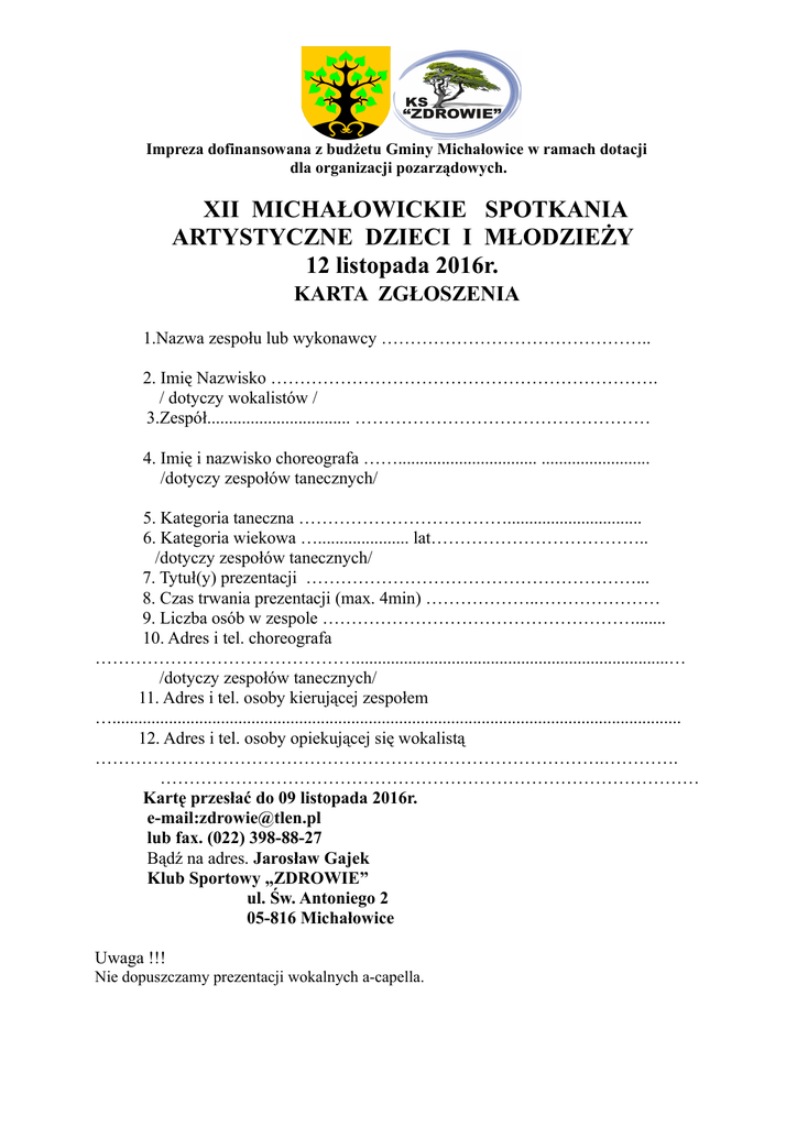 Impreza dofinansowana z budżetu Gminy Michałowice w ramach dotacji dla organizacji pozarządowych. XII MICHAŁOWICKIE SPOTKANIA ARTYSTYCZNE DZIECI I MŁODZIEŻY 12 listopada 2016r. KARTA ZGŁOSZENIA 1.Nazwa zespołu lub wykonawcy ……………………………………….. 2. Imię Nazwisko …………………………………………………………. / dotyczy wokalistów / 3.Zespół................................. …………………………………………… 4. Imię i nazwisko choreografa ……................................ ......................... /dotyczy zespołów tanecznych/ 5. Kategoria taneczna ………………………………............................... 6. Kategoria wiekowa …..................... lat……………………………….. /dotyczy zespołów tanecznych/ 7. Tytuł(y) prezentacji …………………………………………………... 8. Czas trwania prezentacji (max. 4min) ………………..………………… 9. Liczba osób w zespole ………………………………………………....... 10. Adres i tel. choreografa ………………………………………........................................................................… /dotyczy zespołów tanecznych/ 11. Adres i tel. osoby kierującej zespołem …................................................................................................................................... 12. Adres i tel. osoby opiekującej się wokalistą …………………………………………………………………………….…………. ………………………………………………………………………………… Kartę przesłać do 09 listopada 2016r. e-mail:[email protected] lub fax. (022) 398-88-27 Bądź na adres. Jarosław Gajek Klub Sportowy „ZDROWIE” ul. Św. Antoniego 2 05-816 Michałowice Uwaga !!! Nie dopuszczamy prezentacji wokalnych a-capella.