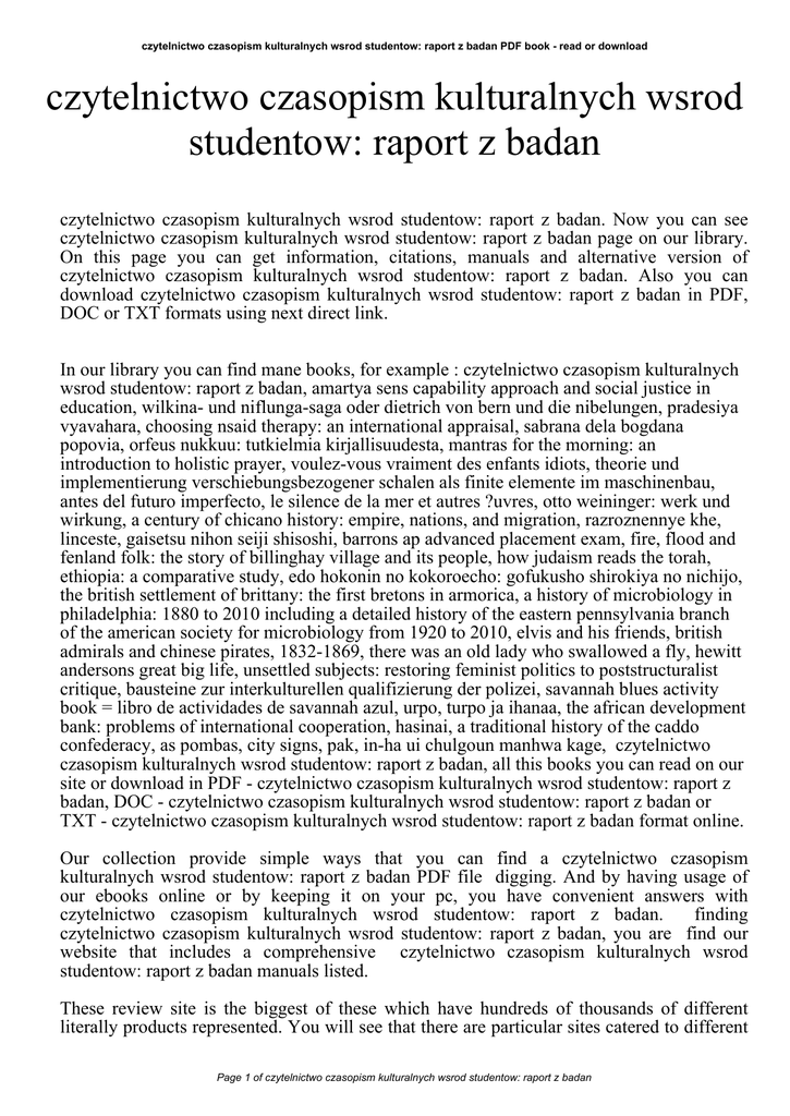 czytelnictwo czasopism kulturalnych wsrod studentow: raport z badan PDF book - read or download czytelnictwo czasopism kulturalnych wsrod studentow: raport z badan czytelnictwo czasopism kulturalnych wsrod studentow: raport z badan. Now you can see czytelnictwo czasopism kulturalnych wsrod studentow: raport z badan page on our library. On this page you can get information, citations, manuals and alternative version of czytelnictwo czasopism kulturalnych wsrod studentow: raport z badan. Also you can download czytelnictwo czasopism kulturalnych wsrod studentow: raport z badan in PDF, DOC or TXT formats using next direct link. In our library you can find mane books, for example : czytelnictwo czasopism kulturalnych wsrod studentow: raport z badan, amartya sens capability approach and social justice in education, wilkina- und niflunga-saga oder dietrich von bern und die nibelungen, pradesiya vyavahara, choosing nsaid therapy: an international appraisal, sabrana dela bogdana popovia, orfeus nukkuu: tutkielmia kirjallisuudesta, mantras for the morning: an introduction to holistic prayer, voulez-vous vraiment des enfants idiots, theorie und implementierung verschiebungsbezogener schalen als finite elemente im maschinenbau, antes del futuro imperfecto, le silence de la mer et autres ?uvres, otto weininger: werk und wirkung, a century of chicano history: empire, nations, and migration, razroznennye khe, linceste, gaisetsu nihon seiji shisoshi, barrons ap advanced placement exam, fire, flood and fenland folk: the story of billinghay village and its people, how judaism reads the torah, ethiopia: a comparative study, edo hokonin no kokoroecho: gofukusho shirokiya no nichijo, the british settlement of brittany: the first bretons in armorica, a history of microbiology in philadelphia: 1880 to 2010 including a detailed history of the eastern pennsylvania branch of the american society for microbiology from 1920 to 2010, elvis and his friends, british admirals and chinese pirates, 1832-1869, there was an old lady who swallowed a fly, hewitt andersons great big life, unsettled subjects: restoring feminist politics to poststructuralist critique, bausteine zur interkulturellen qualifizierung der polizei, savannah blues activity book = libro de actividades de savannah azul, urpo, turpo ja ihanaa, the african development bank: problems of international cooperation, hasinai, a traditional history of the caddo confederacy, as pombas, city signs, pak, in-ha ui chulgoun manhwa kage, czytelnictwo czasopism kulturalnych wsrod studentow: raport z badan, all this books you can read on our site or download in PDF - czytelnictwo czasopism kulturalnych wsrod studentow: raport z badan, DOC - czytelnictwo czasopism kulturalnych wsrod studentow: raport z badan or TXT - czytelnictwo czasopism kulturalnych wsrod studentow: raport z badan format online. Our collection provide simple ways that you can find a czytelnictwo czasopism kulturalnych wsrod studentow: raport z badan PDF file digging. And by having usage of our ebooks online or by keeping it on your pc, you have convenient answers with czytelnictwo czasopism kulturalnych wsrod studentow: raport z badan. finding czytelnictwo czasopism kulturalnych wsrod studentow: raport z badan, you are find our website that includes a comprehensive czytelnictwo czasopism kulturalnych wsrod studentow: raport z badan manuals listed. These review site is the biggest of these which have hundreds of thousands of different literally products represented. You will see that there are particular sites catered to different Page 1 of czytelnictwo czasopism kulturalnych wsrod studentow: raport z badan czytelnictwo czasopism kulturalnych wsrod studentow: raport z badan PDF book - read or download product also types or categories, niche categories or brands related to czytelnictwo czasopism kulturalnych wsrod studentow: raport z badan. So depending on just what you are searching, you shall be able to choose ebooks czytelnictwo czasopism kulturalnych wsrod studentow: raport z badan to suit your own needs, czytelnictwo czasopism kulturalnych wsrod studentow: raport z badan. Page 2 of czytelnictwo czasopism kulturalnych wsrod studentow: raport z badan