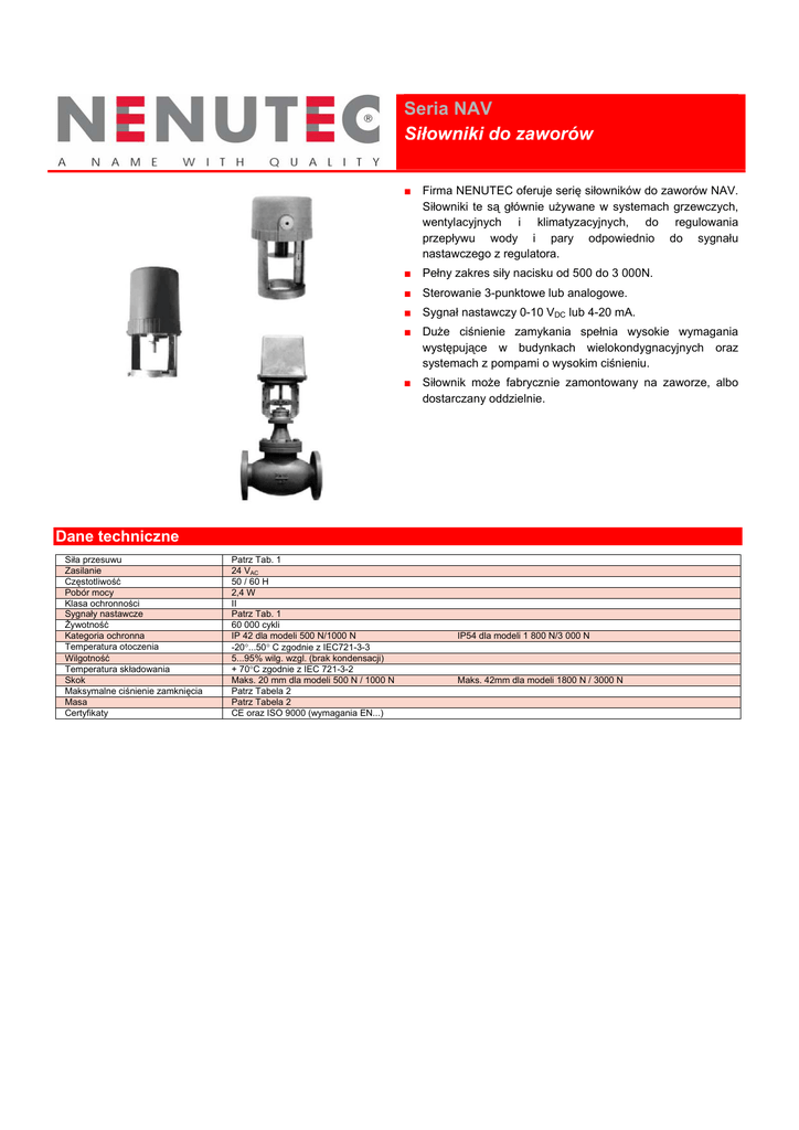 Seria NAV Siłowniki do zaworów ■ Firma NENUTEC oferuje serię siłowników do zaworów NAV. Siłowniki te są głównie używane w systemach grzewczych, wentylacyjnych i klimatyzacyjnych, do regulowania przepływu wody i pary odpowiednio do sygnału nastawczego z regulatora. ■ Pełny zakres siły nacisku od 500 do 3 000N. ■ Sterowanie 3-punktowe lub analogowe. ■ Sygnał nastawczy 0-10 VDC lub 4-20 mA. ■ Duże ciśnienie zamykania spełnia wysokie wymagania występujące w budynkach wielokondygnacyjnych oraz systemach z pompami o wysokim ciśnieniu. ■ Siłownik może fabrycznie zamontowany na zaworze, albo dostarczany oddzielnie. Dane techniczne Siła przesuwu Zasilanie Częstotliwość Pobór mocy Klasa ochronności Sygnały nastawcze Żywotność Kategoria ochronna Temperatura otoczenia Wilgotność Temperatura składowania Skok Maksymalne ciśnienie zamknięcia Masa Certyfikaty Patrz Tab. 1 24 VAC 50 / 60 H 2,4 W II Patrz Tab. 1 60 000 cykli IP 42 dla modeli 500 N/1000 N -20°...50° C zgodnie z IEC721-3-3 5...95% wilg. wzgl. (brak kondensacji) + 70°C zgodnie z IEC 721-3-2 Maks. 20 mm dla modeli 500 N / 1000 N Patrz Tabela 2 Patrz Tabela 2 CE oraz ISO 9000 (wymagania EN...) IP54 dla modeli 1 800 N/3 000 N Maks. 42mm dla modeli 1800 N / 3000 N 1 . S i ła prz esu wu M Łącz nik V Sy g na ł a n al og owy A Z as ila ni e N Sy g na ł n ast awczy Si ło w nik do z aw o ró w Seria NAV Siłowniki do zaworów 2 - 1 0 Kody zamówieniowe siłowników Siłownik do zaworów NAV NAV = Siłownik do zaworów NAV Sygnał nastawczy A = sterowanie 3-punktowe M = sterowanie analogowe Zasilanie 1 = 24 VAC Sygnał analogowy (tylko siłowniki ze sterowaniem analogowym) 2 = 0-10 VDC 4 = 4 - 20 mA Siła przesuwu 05 = 500 N 10 = 1000 N 18 = 1800 N 30 = 3000 N Tabela 1: Kody zamówieniowe siłowników Składanie zamówienia Prosimy podać kod zamówieniowy z tabeli. Części zamienne W przypadku uszkodzenia, siłowniki z serii NAV są wymieniane na nowe. Użytkownikowi nie wolno samodzielnie naprawiać urządzenia. Tabela 2: Maksymalne ciśnienie zamknięcia [kPa] oraz masa Ciśnienie zamknięcia [kPa] Model Siła [N] DN20 DN25 DN32 DN40 NAV...-05 500 1000 680 420 240 NAV....-10 1000 nie dot. nie dot. 550 400 Ciśnienie zamknięcia [kPa] Model Siła [N] DN65 DN80 DN100 DN125 NAV...-18 1800 340 150 90 nie dot. NAV....-30 3000 NA NA 270 150 DN50 NA 270 DN150 nie dot. 90 Masa kg 0,8 1,2 Masa kg 4,8 5,0 Seria NAV Siłowniki do zaworów Rysunek 3: Schemat połączeń siłownika Siłowniki NAV...-05 oraz NAV...-10 (500 N oraz 1000 N) Sterowanie 3-punktowe Analogowe 0-10 VDC lub 4-20 mA Napięcie Przewód 24 VAC zerowy zasilania Masa sygnału Sygnał nastawczy 0-10 VDC Siłowniki NAV...-18 oraz NAV...-30 (1800 N oraz 3000 N) Sterowanie 3-punktowe Napięcie 24 VAC A Napięcie 24 VAC B Analogowe 0-10 VDC lub 4-20 mA Sygnał (-) Sygnał (+) Edited by Foxit PDF Editor Copyright (c) by Foxit Software Company, 2004 For Evaluation Only. Seria NAV Siłowniki do zaworów Rysunek 4: Wymiary siłownika [mm] NAV... -05 (500 N) NAV...-10 (1000 N) Przegląd zastosowań Siłowniki z serii NAV są dostępne w wersjach o sile nacisku od 500 N do 3000 N. Są przeznaczone do przestawiania zaworów grzybkowych w celu regulowania przepływu wody lub pary. W celu skompletowania pełnego systemu regulacyjnego, siłownik można zamówić wraz z zaworem NENUTEC z serii NVCS lub NVCF oraz regulatorem NTC. NAV... -18 (1800 N) NAV... -30 (3000 N) Wszystkie stwierdzenia, dane techniczne oraz zalecenia zamieszczone w niniejszym dokumencie mają jedynie charakter ogólny. W celu uzyskania informacji o specyficznych wymaganiach oraz doborze materiałów, dotyczących zamierzonego zastosowania, prosimy skontaktować się z przedstawicielem firmy NENUTEC lub producentem. Dane techniczne oraz konstrukcja wyrobu mogą ulec zmianie bez uprzedzenia.