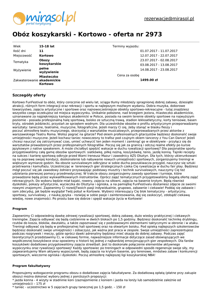 [email protected] Obóz koszykarski - Kortowo - oferta nr 2973 Wiek 15-18 lat Ilość dni 11 01.07.2017 - 11.07.2017 Miejscowość Kortowo 12.07.2017 - 22.07.2017 Tematyka Obozy koszykarskie 23.07.2017 - 02.08.2017 Wyżywienie pełne wyżywienie 14.08.2017 - 23.08.2017 Miasteczko Zakwaterowanie akademickie Kortowo Terminy wyjazdu: 03.08.2017 - 13.08.2017 Cena za osobę 1499.00 zł Szczegóły oferty Kortowo FunFestival to obóz, który corocznie od wielu lat, sciąga tłumy młodzieży spragnionej dobrej zabawy, dziesiątki atrakcji, różnych form integracji oraz rekreacji i sportu w najlepszym możlwym wydaniu. Dobra muzyka, doborowe towarzystwo, zajęcia artystyczne i sportowe oraz najnowocześniejsze obiekty sportowo-rekreacyjne - tutaj znajdziesz wszystko czego oczekujesz od miejsca wypoczynku. Unikalnie położone, nad brzegiem jeziora, miasteczko akademickie, uznanawane za najpiękniejszy kampus akademicki w Polsce, posiada na swoim terenie obiekty sportowe na najwyższym poziomie - posiada profesjonalną halę sportową, boisko ze sztuczną trawą, stadion lekkoatletyczny, korty tenisowe, basen kryty, ośrodek jeździecki, przystań ze sprzętem wodnym. Dla uczestników obozów o profilu artystycznym przeporwadzamy warsztaty: taneczne, teatralne, muzyczne, fotograficzne. Jeżeli marzy Ci się, żeby stanąć w blasku fleszy i poczuć atmosferę teatru muzycznego, skorzystaj z warsztatów musicalowych, przeprowadzanych przez aktorów z warszawskiego Teatru Roma. Wolisz pograć na gitarze? Pod okiem profesinoalnych gitarzystów będziesz doskonalić swoje umiejętności muzyczne. Jeżeli kochasz taniec nowoczesny to trafisz pod czujnym okiem tancerzy z You Can Dance! Jeżeli chcesz nauczyć się zatrzymywać czas, umieć uchwycić ten jeden moment i zamknąć go w obiektywie - przyłącz się do warsztatów prowadzonych przez profesjonalnych fotografów. Poczuj się jak za granicą i odczuj realne efekty po kursie językowym z native speakerem. A może chciałbyś spędzić wakacje w duchu rywalizacji sportowej? Dla pasjonatów sportu przygotowaliśmy całą gamę obozów sportowych: siatkówkę, piłkę nożną, koszykówkę, tenis, jazdę konną. Tajniki recepty na sukces i karierę sportową odkryje przed Wami Ireneusz Mazur i zawodnicy AZS Olsztyn. Dla tych, którzy ukierunkowani są na poprawę swojej kondycji, doskonalenie lub nabywanie nowych umiejętności sportowych, zorganizujemy treningi w większym wymiarze godzin. Na obozie survivalowym odkryjesz w sobie ducha poszukiwacza przygód, nauczysz się sztuki przetrwania i kamuflażu. Uczestnicząc w terenowych gier strategicznych czeka Cię rywalizacja w duchu fair play. Będziesz mógł poczuć się jak zawodowy żołnierz przyswajając podstawy musztry i technik survivalowych, nauczymy Cię też udzielania pierwszej pomocy przedmedycznej. W trakcie obozu zorganizujemy zawody sportowe i turnieje, które prowadzone będą przez wykwalifikowanych instruktorów. Oprócz zajęć tematycznych przygotowaliśmy bogatą ofertę zajęć rekreacyjnych. Do wyboru będzie miał kajaki, rowery, zajęcia na siłowni, zajęcia na basenie krytym. Będą również dyskoteki, pokazy artystyczne, wycieczka do Olsztyna i ogniska, a na pamiątkę FunFestivalu dostaniesz zdjęcie ze swoimi nowymi znajomymi. Zapewnimy Ci rozwójTwoich pasji indywidualnie, grupowo, zabawnie i ciekawie! Poddaj się zabawie i sam zdecyduj, jak będzie wyglądał Twój pobyt w Kortowie. Wybierz interesujący Cię blok tematyczny - artystyczny, sportowy, survivalowy , z nauką języka - rozwijaj w sobie pasje i zainteresowania, daj się zaskoczyć, zdobądź ciekawą wiedzę, nowe znajomości. Po prostu baw się dobrze i spędź wakacje życia w Kortowie! Program Zapewnimy Ci odpowiednią dawkę zdrowej rywalizacji sportowej, dobrą zabawę, dużo wiedzy praktycznej i ciekawych treningów. Zajęcia odbywać się będą codziennie w dwóch blokach po 1,5 godziny. Będziesz doskonalić technikę dryblingu, rzutów do kosza, bloków, dwutaktu, a także zapoznawać się z podstawowymi elementami taktycznymi w obronie i w ataku. Treningi odbywać się będą w profesjonalnej hali sportowej oraz na otwartym boisku. Pod opieką najlepszych szkoleniowców będziesz doskonalić swoje umiejętności i zobaczysz, jak ważna jest praca w zespole. Swoje umiejętności zaprezentujesz podczas rozgrywek i meczy, gdzie oprócz dawki adrenaliny będziesz mieć okazję do dobrej zabawy. Podczas zajęć teoretycznych przedstawimy Ci, w ciekawej formie, najważniejsze informacje dotyczące zasad obowiązujących we współczesnej koszykówce oraz opowiemy o historii tej jednej z najbardziej emocjonujących gier zespołowych. Dla fanów koszykówki dodatkowo przygotowaliśmy zajęcia streetball. Jest to doskonałe połączenie elementów aktywnego wypoczynku oraz rywalizacji sportowej! Każdy sportowiec po treningach w odpowiedni sposób regeneruje swoje siły, my zagwarantujemy Wam aktywny wypoczynek, będą zajęcia na krytym basenie, gry terenowe, mnóstwo zabaw i konkurencji sportowych, wieczorne ogniska i dyskoteki. Poczuj atmosferę najlepszej ligi koszykarskiej NBA! Program fakultatywny Proponujemy wzbogacenie programu obozu o dodatkowe zajęcia fakultatywne. Za dodatkową opłatą (płatne przy zakupie obozu) można dokonać wyboru jednej z poniższych propozycji: * jazda konna - 4 wizyty w stadninie koni (zaznajomienie z koniem i jazda na lonży lub samodzielnie zależnie od umiejętności) – 175 zł * taniec - uczestnictwo w 5 zajęciach grupy tanecznej po 1,5 godz. – 150 zł * tenis - 4 treningi po 1,5 godz. na korcie tenisowym z partnerem do gry oraz instruktorem – 150 zł * fotografia - uczestnictwo w 5 zajęciach grupy fotograficznej po 1,5 godz. – 150 zł * gotowanie - uczestnictwo w 4 zajęciach grupy Master Cook po 2 godz. – 150 zł Zakwaterowanie Dom studencki, pokoje 2 osobowe z łazienkami. W akademiku znajduje się świetlica, sala TV, całodobowa recepcja. 
