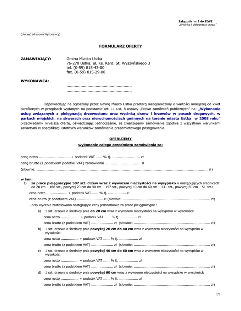 Załącznik nr 2 do SIWZ „Wycinka i pielęgnacja drzew ” ............................................... (pieczęć adresowa Wykonawcy) FORMULARZ OFERTY ZAMAWIAJĄCY: Gmina Miasto Ustka 76-270 Ustka, ul. Ks. Kard. St. Wyszyńskiego 3 tel. (0-59) 815-43-00 fax. (0-59) 815-29-00 WYKONAWCA: ........................................................ ........................................................ ........................................................ Odpowiadając na ogłoszony przez Gminę Miasto Ustka przetarg nieograniczony o wartości mniejszej od kwot określonych w przepisach wydanych na podstawie art. 11 ust. 8 ustawy „Prawo zamówień publicznych” na: „Wykonanie usług związanych z pielęgnacją drzewostanu oraz wycinką drzew i krzewów w pasach drogowych, w parkach miejskich, na skwerach oraz nieruchomościach gminnych na terenie miasta Ustka w 2008 roku” przedkładamy niniejszą ofertę, oświadczając jednocześnie, że zrealizujemy zamówienie zgodnie z wszystkimi warunkami zawartymi w specyfikacji istotnych warunków zamówienia przedmiotowego postępowania. OFERUJEMY wykonanie całego przedmiotu zamówienia za: cenę netto ............................ + podatek VAT …… % tj. ......................... zł cenę brutto (z podatkiem podatku VAT) zamówienia ................................ zł (słownie: ........................................................................................................................................................... zł) w tym: 1) za prace pielęgnacyjne 507 szt. drzew wraz z wywozem nieczystości na wysypisko o następujących średnicach: do 20 cm – 168 szt., powyżej 20 cm do 40 cm – 157 szt., powyżej 40 cm do 60 cm – 131 szt., powyżej 60 cm – 51 szt.: cena netto .................... + podatek VAT ...... % tj. ................. zł cena brutto (z podatkiem VAT) ......................... zł (słownie: .................................................................................... zł) - przy wycenie zastosowano następujące ceny jednostkowe za prace pielęgnacyjne : a) 1 szt. drzewa o średnicy pnia do 20 cm wraz z wywozem nieczystości na wysypisko w wysokości: cena netto .................. + podatek VAT ...... % tj. ................ zł cena brutto (z podatkiem VAT) ..................... zł (słownie: ......................................................................... zł) b) 1 szt. drzewa o średnicy pnia powyżej 20 cm do 40 cm wraz z wywozem nieczystości na wysypisko w wysokości: cena netto ................. + podatek VAT ...... % tj. .................. zł cena brutto (z podatkiem VAT) ..................... zł (słownie: ......................................................................... zł) c) 1 szt. drzewa o średnicy pnia powyżej 40 cm do 60 cm wraz z wywozem nieczystości na wysypisko w wysokości: cena netto ................. + podatek VAT ...... % tj. .................. zł cena brutto (z podatkiem VAT) ..................... zł (słownie: ......................................................................... zł) d) 1 szt. drzewa o średnicy pnia powyżej 60 cm wraz z wywozem nieczystości na wysypisko w wysokości: cena netto ................. + podatek VAT ...... % tj. .................. zł cena brutto (z podatkiem VAT) ..................... zł (słownie: ......................................................................... zł) 1/3 2) za wycinkę 2 szt. drzew wraz z wywozem nieczystości na wysypisko o średnicy powyżej 20 cm do 40 cm: cena netto .................... + podatek VAT ...... % tj. ................. zł cena brutto (z podatkiem VAT) ......................... zł (słownie: .................................................................................... zł) - przy wycenie zastosowano następujące ceny jednostkowe za prace pielęgnacyjne : a) 1 szt. drzewa o średnicy pnia powyżej 20 do 40 cm wraz z wywozem nieczystości na wysypisko w wysokości: cena netto ................ + podatek VAT ...... % tj. .................. zł cena brutto (z podatkiem VAT) .................... zł (słownie: .......................................................................... zł) 3) za prace interwencyjne w zakresie pielegnacji drzew w ilości szacunkowej 350 szt. wraz z wywozem nieczystości na wysypisko o następujących średnicach: do 20 cm – 150 szt., powyżej 20 cm do 40 cm – 100 szt., powyżej 40 cm do 60 cm – 50 szt., powyżej 60 cm – 50 szt.: cena netto .................... + podatek VAT ...... % tj. ................. zł cena brutto (z podatkiem VAT) ......................... zł (słownie: .................................................................................... zł) - przy wycenie zastosowano następujące ceny jednostkowe za prace pielęgnacyjne : a) 1 szt. drzewa o średnicy pnia do 20 cm wraz z wywozem nieczystości na wysypisko w wysokości: cena netto .................. + podatek VAT ...... % tj. ................ zł cena brutto (z podatkiem VAT) ..................... zł (słownie: ......................................................................... zł) b) 1 szt. drzewa o średnicy pnia powyżej 20 cm do 40 cm wraz z wywozem nieczystości na wysypisko w wysokości: cena netto ................. + podatek VAT ...... % tj. .................. zł cena brutto (z podatkiem VAT) ..................... zł (słownie: ......................................................................... zł) c) 1 szt. drzewa o średnicy pnia powyżej 40 cm do 60 cm wraz z wywozem nieczystości na wysypisko w wysokości: cena netto ................. + podatek VAT ...... % tj. .................. zł cena brutto (z podatkiem VAT) ..................... zł (słownie: ......................................................................... zł) d) 1 szt. drzewa o średnicy pnia powyżej 60 cm wraz z wywozem nieczystości na wysypisko w wysokości: cena netto ................. + podatek VAT ...... % tj. .................. zł cena b