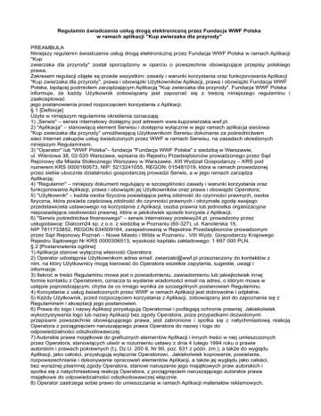 Regulamin świadczenia usług drogą elektroniczną przez Fundacja WWF Polska w ramach aplikacji "Kup zwierzaka dla przyrody" PREAMBUŁA Niniejszy regulamin świadczenia usług drogą elektroniczną przez Fundacja WWF Polska w ramach Aplikacji "Kup zwierzaka dla przyrody" został sporządzony w oparciu o powszechnie obowiązujące przepisy polskiego prawa. Zakresem regulacji objęte są przede wszystkim: zasady i warunki korzystania oraz funkcjonowania Aplikacji "Kup zwierzaka dla przyrody", prawa i obowiązki Użytkowników Aplikacji, prawa i obowiązki Fundacja WWF Polska, będącej podmiotem zarządzającym Aplikacją "Kup zwierzaka dla przyrody". Fundacja WWF Polska informuje, że każdy Użytkownik zobowiązany jest zapoznać się z treścią niniejszego regulaminu i zaakceptować jego postanowienia przed rozpoczęciem korzystania z Aplikacji. § 1 [Definicje] Użyte w niniejszym regulaminie określenia oznaczają: 1) „Serwis" – serwis internetowy dostępny pod adresem www.kupzwierzaka.wwf.pl. 2) "Aplikacja" – stanowiącą element Serwisu i dostępna wyłącznie w jego ramach aplikacja sieciowa "Kup zwierzaka dla przyrody" umożliwiającą Użytkownikom Serwisu dokonanie za pośrednictwem sieci Internet zakupów usług świadczonych przez WWF w ramach Serwisu, na zasadach określonych niniejszym Regulaminem. 3) "Operator" lub "WWF Polska"– fundacja "Fundacja WWF Polska" z siedzibą w Warszawie, ul. Wiśniowa 38, 02-520 Warszawa, wpisana do Rejestru Przedsiębiorców prowadzonego przez Sąd Rejonowy dla Miasta Stołecznego Warszawy w Warszawie, XIII Wydział Gospodarczy – KRS pod numerem KRS 0000160673, NIP: 5213241055, REGON: 015481019, która w ramach prowadzonej przez siebie ubocznie działalności gospodarczej prowadzi Serwis, a w jego ramach zarządza Aplikacją; 4) "Regulamin" – niniejszy dokument regulujący w szczególności zasady i warunki korzystania oraz funkcjonowania Aplikacji, prawa i obowiązki jej Użytkowników oraz prawa i obowiązki Operatora; 5) "Użytkownik" – każda osoba fizyczna posiadająca pełną zdolność do czynności prawnych, osoba fizyczna, która posiada częściową zdolność do czynności prawnych i otrzymała zgodę swojego przedstawiciela ustawowego na korzystanie z Aplikacji, osoba prawna lub jednostka organizacyjna nieposiadająca osobowości prawnej, która w jakikolwiek sposób korzysta z Aplikacji; 6) "Serwis pośrednictwa finansowego" – serwis internetowy przelewy24.pl, prowadzony przez usługodawcę: Dialcom24 sp. z o.o. z siedzibą w Poznaniu (60-327), ul. Kanclerska 15, NIP 7811733852, REGON 634509164, zarejestrowaną w Rejestrze Przedsiębiorców prowadzonym przez Sąd Rejonowy Poznań – Nowe Miasto i Wilda w Poznaniu , VIII Wydz. Gospodarczy Krajowego Rejestru Sądowego Nr KRS 0000306513, wysokość kapitału zakładowego: 1 697 000 PLN. § 2 [Postanowienia ogólne] 1) Aplikacja stanowi wyłączną własność Operatora. 2) Operator udostępnia Użytkownikom adres email: [email protected] przeznaczony do kontaktów z nim, na który Użytkownicy mogą kierować do Operatora wszelkie zapytania, sugestie, uwagi i informacje. 3) Ilekroć w treści Regulaminu mowa jest o powiadomieniu, zawiadomieniu lub jakiejkolwiek innej formie kontaktu z Operatorem, oznacza to wysłanie wiadomości email na adres, o którym mowa w ustępie poprzedzającym, chyba że co innego wynika ze szczególnych postanowień Regulaminu. 4) Korzystanie z usług świadczonych przez WWF w ramach Aplikacji jest dobrowolne i odpłatne. 5) Każdy Użytkownik, przed rozpoczęciem korzystania z Aplikacji, zobowiązany jest do zapoznania się z Regulaminem i akceptacji jego postanowień. 6) Prawa do logo i nazwy Aplikacji przysługują Operatorowi i podlegają ochronie prawnej. Jakiekolwiek wykorzystywania logo lub nazwy Aplikacji bez zgody Operatora, poza przypadkami dozwolonymi przepisami powszechnie obowiązującego prawa, jest zabronione i spotka się z natychmiastową reakcją Operatora z pociągnięciem naruszającego prawa Operatora do nazwy i logo do odpowiedzialności odszkodowawczej. 7) Autorskie prawa majątkowe do graficznych elementów Aplikacji i innych treści w niej umieszczonych przez Operatora, stanowiących utwór w rozumieniu ustawy z dnia 4 lutego 1994 roku o prawie autorskim i prawach pokrewnych (t.j. Dz.U. 200 6, Nr 90, poz. 631 z późn. zm.), a także do wyglądu Aplikacji, jako całości, przysługują wyłącznie Operatorowi,. Jakiekolwiek kopiowanie, powielanie, rozpowszechnianie i dokonywanie opracowań elementów Aplikacji, a także jej wyglądu jako całości, bez wyraźnej pisemnej zgody Operatora, stanowi naruszenie jego majątkowych praw autorskich i spotka się z natychmiastową reakcją Operatora, z pociągnięciem naruszającego autorskie prawa majątkowe do odpowiedzialności odszkodowawczej włącznie. 8) Operator zastrzega sobie prawo do umieszczania w ramach Aplikacji materiałów reklamowych, promocyjnych lub marketingowych pochodzących od Operatora. 9) Użytkownik zamieszczający w ramach Aplikacji jakiekolwiek materiały wyraża zgodę na wgląd w te materiały przez innych Użytkowników oraz Operatora. W przypadku umieszczenia treści mających charakter utworu w rozumieniu ustawy z dnia 4 lutego 1994 r. o prawie autorskim i prawach pokrewnych (t.j. Dz.U. 2006, Nr 90, poz. 631 z późn. zm.), Użytkownik udziela Operatorowi nieodpłatnej, niewyłącznej licencji do wykorzystania udostępnionych utworów dla potrzeb świadczenia usług za pomocą Aplikacji. § 3 [Warunki techniczne korzystania z Aplikacji; zakaz dostarczania treści o charakterze bezprawnym, treści niedozwolone ] 1) W celu prawidłowego korzystania przez Użytkowników z usług dostępnych w ramach Aplikacji, niezbędne jest łącznie: a. połączenie z siecią Internet; b. posiadanie urządzeń pozwalających na korzystanie z zasobów sieci Internet; c. korzystanie z przeglądarki internetowej umożliwiającej wyświetlanie na ekranie urządz