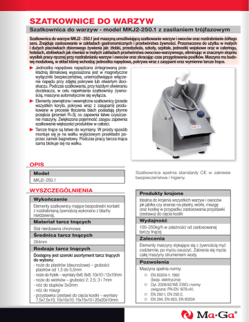 SZATKOWNICE DO WARZYW Szatkownica do warzyw - model MKJ2-250.1 z zasilaniem trójfazowym Szatkownica do warzyw MKJ2 - 250.1 jest maszyną umożliwiającą szatkowanie warzyw i owoców oraz rozdrabnianie żółtego sera. Znajduje zastosowanie w zakładach gastronomicznych i przetwórstwa żywności. Przeznaczona do użytku w małych i dużych placówkach zbiorowego żywienia jak: żłobki, przedszkola, szkoły, szpitale, jednostki wojskowe oraz w cateringu, hotelach, stołówkach jak również w małych zakładach przetwórstwa owocowo-warzywnego, eliminując w znacznym stopniu wysiłek pracy ręcznej przy rozdrabnianiu warzyw i owoców oraz skracając czas przygotowania posiłków. Maszyna ma budowę modułową, w skład której wchodzą: jednostka napędowa, pokrywa wraz z zasypami oraz wymienne tarcze tnące. > Jednostka napędowa napędzana zintegrowaną przekładnią ślimakową wyposażona jest w magnetyczne wyłączniki bezpieczeństwa, uniemożliwiające włączenie napędu przy zdjętej pokrywie lub otwartym dociskaczu. Podczas szatkowania, przy każdym otwieraniu dociskacza, w celu napełniania szatkownicy żywnością, maszyna automatycznie się wyłącza. > Elementy zewnętrzne i wewnętrzne szatkownicy (przede wszystkim koryto, pokrywa wraz z zasypami) produkowane w procesie tłoczenia blach posiadają płynne przejścia (promień R=3), co zapewnia łatwe czyszczenie maszyny. Zwiększona pojemność zasypu zapewnia szatkowanie większości produktów w całości. > Tarcze tnące są łatwe do wymiany. W prosty sposób montuje się je na wałku wyjściowym przekładni poprzez zamek bagnetowy. Podczas pracy tarcza tnąca sama blokuje się na wałku. OPIS Model MKJ2–250.1 WYSZCZEGÓLNIENIA Wykończenie Elementy szatkownicy mające bezpośredni kontakt z rozdrabnianą żywnością wykonano z blachy nierdzewnej. Materiał tarcz tnących Stal nierdzewna chromowa Średnica tarcz tnących 264mm Rodzaje tarcz tnących Dostępny jest szeroki asortyment tarcz tnących do wyboru: - noże do plastrów (dwunożowe) – grubości plastrów od 1,5 do 5,5mm - noże do frytek – wymiary 6x6; 8x8; 10x10 i 12x10mm - noże do wiórków – grubości 2; 2,5; 3 i 7mm - nóż do słupków 3x3mm - nóż do miazgi - przystawka (zestaw) do cięcia kostki – wymiary 7,5x7,5x10; 10x10x10; 15x15x10 i 20x20x10mm Szatkownica spełnia standardy CE w zakresie bezpieczeństwa i higieny. Produkty krojone Idealna do krojenia wszystkich warzyw i owoców jak jabłka czy ananas na plastry, wiórki, miazgę oraz kostkę w przypadku zastosowania przystawki (zestawu) do cięcia kostki Wydajność 100–250kg/h w zależności od zastosowanej tarczy tnącej Zalecenia Elementy maszyny stykające się z żywnością myć codziennie, po myciu osuszyć. Zabrania się mycia całej maszyny strumieniem wody. Pozwolenia Maszyna spełnia normy: A EN 60204-1; 1992 (bezp. elektryczne) A Dyr. 2006/42/WE EWG i normy związane: PN-EN 1678+A1, A EN 292-1, EN 292-2, A EN 294, EN 953, EN 60204 SZATKOWNICE DO WARZYW Szatkownice do warzyw - model MKJ2-250 TABLICA WYMIAROWA WYMIARY Szatkownica: MKJ2-250.1 A B C D E F 463mm 360mm 355mm 269mm 50mm 365mm G H I J K Kąt 311mm 225mm 648mm 626mm 68mm 140O DANE TECHNICZNE (specyfikacja) Wymiary gabarytowe Rozstaw nóżek Średnica tarczy tnącej Obroty tarczy tnącej Zasilanie Moc Waga (ciężar netto) Szatkownica: MKJ2-250.1 365(F) x 463(A) x 648(I)mm 225(H) x 269(D)mm 264mm ok. 280 obr./min. zgodnie z kierunkiem strzałki na puszce zasypowej 400V 50Hz 3 fazy 550W 28kg maszyna bez tarcz SPECYFIKACJE WYSYŁKOWE Wymiary kartonu Szatkownica MKJ2-250.1 Długość 610mm Szerokość 470mm Wysokość 650mm Ciężar brutto 30kg