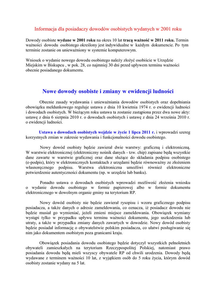 Informacja dla posiadaczy dowodów osobistych wydanych w 2001 roku Dowody osobiste wydane w 2001 roku na okres 10 lat tracą waŜność w 2011 roku. Termin waŜności dowodu osobistego określony jest indywidualne w kaŜdym dokumencie. Po tym terminie zostanie on uniewaŜniony w systemie komputerowym. Wniosek o wydanie nowego dowodu osobistego naleŜy złoŜyć osobiście w Urzędzie Miejskim w Biskupcu , w pok. 28, co najmniej 30 dni przed upływem terminu waŜności obecnie posiadanego dokumentu. Nowe dowody osobiste i zmiany w ewidencji ludności Obecnie zasady wydawania i uniewaŜniania dowodów osobistych oraz dopełniania obowiązku meldunkowego reguluje ustawa z dnia 10 kwietnia 1974 r. o ewidencji ludności i dowodach osobistych. W bieŜącym roku ustawa ta zostanie zastąpiona przez dwa nowe akty: ustawę z dnia 6 sierpnia 2010 r. o dowodach osobistych i ustawę z dnia 24 września 2010 r. o ewidencji ludności. Ustawa o dowodach osobistych wejdzie w Ŝycie 1 lipca 2011 r. i wprowadzi szereg korzystnych zmian w zakresie wydawania i funkcjonalności dowodu osobistego. Nowy dowód osobisty będzie zawierał dwie warstwy: graficzną i elektroniczną. W warstwie elektronicznej (elektroniczny nośnik danych - tzw. chip) zapisane będą wszystkie dane zawarte w warstwie graficznej oraz dane słuŜące do składania podpisu osobistego (e-podpis), który w elektronicznych kontaktach z urzędami będzie równowaŜny ze złoŜeniem własnoręcznego podpisu. Warstwa elektroniczna umoŜliwi równieŜ elektroniczne potwierdzenie autentyczności dokumentu (np. w urzędzie lub banku). Ponadto ustawa o dowodach osobistych wprowadzi moŜliwość złoŜenia wniosku o wydanie dowodu osobistego w formie papierowej albo w formie dokumentu elektronicznego w dowolnym organie gminy na terytorium RP. Nowy dowód osobisty nie będzie zawierał rysopisu i wzoru graficznego podpisu posiadacza, a takŜe danych o adresie zameldowania, co oznacza, iŜ posiadacz dowodu nie będzie musiał go wymieniać, jeŜeli zmieni miejsce zameldowania. Obowiązek wymiany wystąpi tylko w przypadku upływu terminu waŜności dokumentu, jego uszkodzenia lub utraty, a takŜe w przypadku zmiany danych zawartych w dowodzie. Nowy dowód osobisty będzie posiadał informację o obywatelstwie polskim posiadacza, co ułatwi posługiwanie się nim jako dokumentem osobistym poza granicami kraju. Obowiązek posiadania dowodu osobistego będzie dotyczył wszystkich pełnoletnich obywateli zamieszkałych na terytorium Rzeczypospolitej Polskiej, natomiast prawo posiadania dowodu będą mieli wszyscy obywatele RP od chwili urodzenia. Dowody będą wydawane z terminem waŜności 10 lat, z wyjątkiem osób do 5 roku Ŝycia, którym dowód osobisty zostanie wydany na 5 lat. Wejście w Ŝycie nowej ustawy o dowodach osobistych nie będzie skutkowało koniecznością wymiany dowodów osobistych wydanych przed 1 lipca 2011 r., bowiem dokumenty te zachowają waŜność do upływu terminów waŜności w nich określonych. Z kolei 1 sierpnia 2011 r. wejdzie w Ŝycie ustawa o ewidencji ludności, która zmieni zasady realizacji obowiązku meldunkowego. Nowe regulacje przewidują m.in.: ➢ moŜliwość dopełnienia obowiązku meldunkowego przez pełnomocnika, legitymującego się pełnomocnictwem udzielonym na piśmie, ➢ obowiązek zameldowania się obywateli polskich i cudzoziemców-obywateli państw Unii Europejskiej w miejscu pobytu stałego lub czasowego najpóźniej w 30 dniu, licząc od dnia przybycia do tego miejsca, ➢ moŜliwość wymeldowania z miejsca pobytu stałego lub czasowego poprzez dokonanie zameldowania w nowym miejscu pobytu, ➢ moŜliwość wymeldowania oraz zgłoszenia wyjazdu poza granice RP w formie dokumentu elektronicznego, ➢ obowiązek obywateli polskich zgłoszenia wyjazdu za granicę na okres dłuŜszy niŜ miesięcy, 6 ➢ mniejszy niŜ obecnie zakres danych osobowych zgłaszanych przy dopełnianiu obowiązku zameldowania lub wymeldowania, ➢ moŜliwość wydania decyzji administracyjnej o wymeldowaniu z urzędu albo na wniosek właściciela lub innego podmiotu dysponującego tytułem prawnym do lokalu, ➢ zniesienie kar za niedopełnienie obowiązku meldunkowego przez obywateli polskich i cudzoziemców-obywateli państw UE (uchylenie art. 147 Kodeksu wykroczeń), ➢ zniesienie obowiązku meldunkowego z dniem 1 stycznia 2014 r.