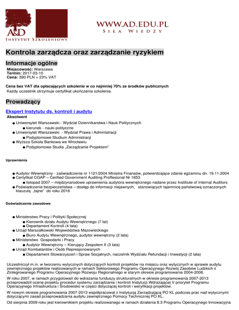 Kontrola zarządcza oraz zarządzanie ryzykiem Informacje ogólne Miejscowość: Warszawa Termin: 2017-03-10 Cena: 390 PLN + 23% VAT Cena bez VAT dla opłacających szkolenie w co najmniej 70% ze środków publicznych Każdy uczestnik otrzymuje certyfikat ukończenia szkolenia. Prowadzący Ekspert Instytutu ds. kontroli i audytu Absolwent Uniwersytet Warszawski - Wydział Dziennikarstwa i Nauk Politycznych ● kierunek - nauki polityczne ● Uniwersytet Warszawski - Wydział Prawa i Administracji ● Podyplomowe Studium Administracji ● Wyższa Szkoła Bankowa we Wrocławiu ● Podyplomowe Studia „Zarządzanie Projektem” ● Uprawnienia Audytor Wewnętrzny - zaświadczenie nr 1121/2004 Ministra Finansów, potwierdzające zdanie egzaminu dn. 19.11.2004 Certyfikat CGAP – Cerified Government Auditing Proffesional Nr 1653 ● listopad 2007 – międzynarodowe uprawnienia audytora wewnętrznego nadane przez Institiute of Internal Auditors ● Poświadczenie bezpieczeństwa – dostęp do informacji niejawnych, stanowiących tajemnicę państwową oznaczonych klauzulą „tajne” do roku 2016 ● ● Doświadczenie zawodowe Ministerstwo Pracy i Polityki Społecznej ● Kierownik działu Audytu Wewnętrznego (7 lat) ● Departament Kontroli (4 lata) ● Urząd Marszałkowski Województwa Mazowieckiego ● Biuro Audytu Wewnętrznego, audytor wewnętrzny (2 lata) ● Ministerstwo Gospodarki i Pracy ● Audytor Wewnętrzny – Kierujący Zespołem II (3 lata) ● Urząd Kombatantów i Osób Represjonowanych ● Departament Stowarzyszeń i Spraw Socjalnych, naczelnik Wydziału Refundacji i Inwestycji (2 lata) ● Uczestniczył m.in. w tworzeniu wytycznych dotyczących kontroli projektów na miejscu oraz wytycznych w sprawie audytu zewnętrznego projektów realizowanych w ramach Sektorowego Programu Operacyjnego Rozwój Zasobów Ludzkich ii Zintegrowanego Programu Operacyjnego Rozwoju Regionalnego w starym okresie programowania 2004-2006. W roku 2007, w ramach przygotowań do wdrażania funduszy strukturalnych w okresie programowania 2007-2013 przeprowadził ocenę projektu procedur systemu zarządzania i kontroli Instytucji Wdrażającej V priorytet Programu Operacyjnego Infrastruktura i Środowisko w części dotyczącej kontroli i weryfikacji projektów. W nowym okresie programowania 2007-2013 współpracował z Instytucją Zarządzającą PO KL podczas prac nad wytycznymi dotyczącymi zasad przeprowadzania audytu zewnętrznego Pomocy Technicznej PO KL. Od sierpnia 2009 roku jest kierownikiem projektu realizowanego w ramach działania 8.3 Programu Operacyjnego Innowacyjna Gospodarka. Od lutego 2010 roku jest także niezależnym członkiem Komitetu Audytu w Ministerstwie Nauki i Szkolnictwa Wyższego. Prowadzi także audyty zewnętrzne projektów finansowanych w ramach Europejskiego Funduszu Społecznego, Europejskiego Funduszu Rozwoju Regionalnego oraz Funduszu Spójności. Dotychczas przeprowadził około 40 audytów (zewnętrznych i wewnętrznych) związanych z funduszami strukturalnymi i Funduszem Spójności. Program 1. Pojęcie kontroli zarządczej 2. Różnice między kontrolą zarządczą a audytem, między kontrolą finansową a kontrolą zarządczą 3. Odpowiedzialność za funkcjonowanie kontroli zarządczej na różnych szczeblach administracji publicznej 4. Cele kontroli zarządczej ● w jakim celu wprowadzamy mechanizmy kontrolne wskazane w standardach kontroli zarządczej 5. Standardy kontroli zarządczej w jednostkach sektora finansów publicznych – omówienie obowiązków wynikających z ich treści dla jednostki administracji publicznej ● ● ● ● ● środowisko wewnętrzne cele i zarządzanie ryzykiem mechanizmy kontroli informacja i komunikacja monitorowanie i ocena 6. Podział obowiązków w zakresie kontroli zarządczej w jednostkach 7. Planowanie celów i zadań oraz zarządzania ryzykiem w jednostce 8. Raportowanie osiągania celów i realizacji zadań 9. Zarządzanie ryzykiem ● ● ● ● ● ● ● ● wyjaśnienie podstawowych definicji: ryzyko; czynniki ryzyka, waga ryzyka, zarządzanie ryzykiem cele i zasady zarządzania ryzykiem zarządzanie ryzykiem jako obligatoryjny element kontroli zarządczej omówienie krok po kroku przykładowej procedury zarządzania ryzykiem kreślenie misji jednostki oraz podstawowych celów na poziomie komórek organizacyjnych przeprowadzenie identyfikacji, analizy i oceny ryzyka dotyczących celów i zadań realizowanych w jednostce przedstawienie i omówienie przykładowego podsumowania procesu analizy ryzyka przedstawienie nieskutecznych metod wdrożenia i stosowania procedury zarządzania ryzykiem – dlaczego wdrożone procedury nie przynoszą spodziewanych korzyści? 10. Samoocena systemu kontroli zarządczej ● ● korzyści i ograniczenia etapy postępowania 11. Składanie oświadczenia o stanie kontroli zarządczej w jednostce ● ● źródła zapewnienia konsekwencje złożenia oświadczenia 12. Przykładowy zestaw procedur kontroli zarządczej w jednostce 13. Kontrola zarządcza a dyscyplina finansów publicznych Harmonogram 09.45 - 10.00 - rejestracja uczestników, czas na poranną kawę i ciasteczka 10.00 - 11.30 - szkolenie 11.30 - 11.45 - przerwa kawowa 11.45 - 13.15 - szkolenie 13.15 - 14.00 - obiad 14.00 - 15.30 - szkolenie Miejsce szkolenia podajemy w potwierdzeniach udziału w szkoleniu, które wysyłamy do Państwa faksem lub e-mailem. Zawsze jest to centrum miasta (za wyjątkiem szkoleń wyjazdowych). Warunki uczestnictwa Podstawą wzięcia udziału w szkoleniu jest przesłanie wypełnionej karty zgłoszenia oraz dokonanie opłaty na konto po otrzymaniu potwierdzenia uczestnictwa. Karta zgłoszenia ma formę umowy zawartej pomiędzy firmą zgłaszającą a Instytut Szkoleniowy A&D Sp. z o.o. W przypadku nie otrzymania potwierdzenia uczestnictwa 3 dni robocze przed szkoleniem, prosimy o kontakt telefoniczny. Opłata za uczestnictwo obejmuje koszty: szkolenia, materiałów, przerw kawowych oraz obia