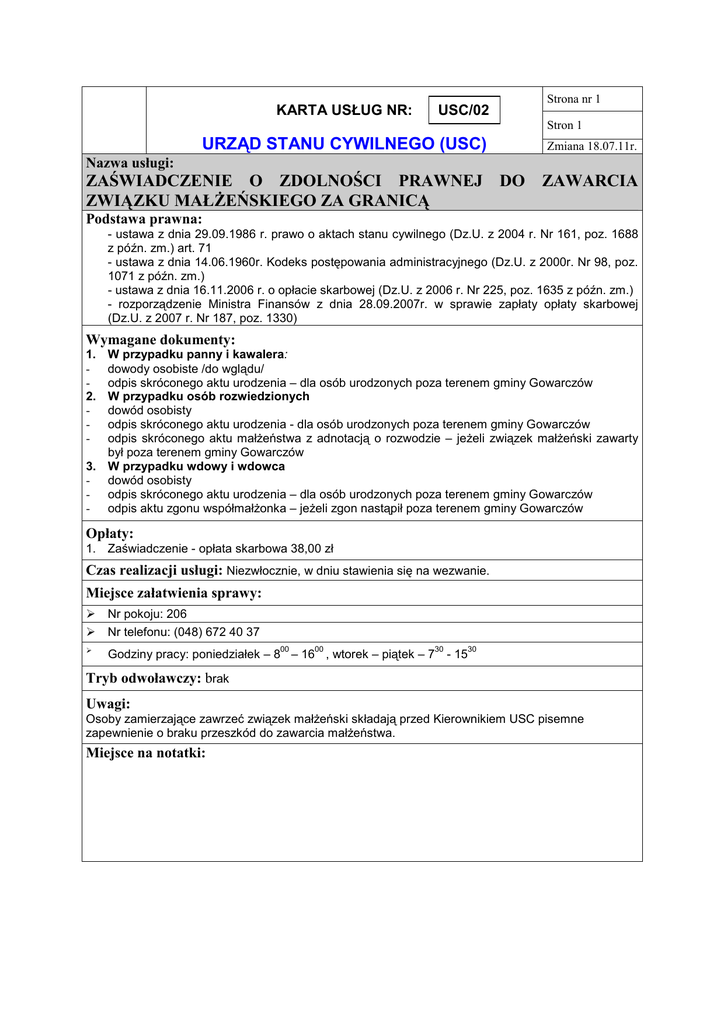 KARTA USŁUG NR: USC/02 Strona nr 1 Stron 1 URZĄD STANU CYWILNEGO (USC) Zmiana 18.07.11r. Nazwa usługi: ZAŚWIADCZENIE O ZDOLNOŚCI PRAWNEJ DO ZAWARCIA ZWIĄZKU MAŁŻEŃSKIEGO ZA GRANICĄ Podstawa prawna: - ustawa z dnia 29.09.1986 r. prawo o aktach stanu cywilnego (Dz.U. z 2004 r. Nr 161, poz. 1688 z późn. zm.) art. 71 - ustawa z dnia 14.06.1960r. Kodeks postępowania administracyjnego (Dz.U. z 2000r. Nr 98, poz. 1071 z późn. zm.) - ustawa z dnia 16.11.2006 r. o opłacie skarbowej (Dz.U. z 2006 r. Nr 225, poz. 1635 z późn. zm.) - rozporządzenie Ministra Finansów z dnia 28.09.2007r. w sprawie zapłaty opłaty skarbowej (Dz.U. z 2007 r. Nr 187, poz. 1330) Wymagane dokumenty: 1. 2. - W przypadku panny i kawalera: dowody osobiste /do wglądu/ odpis skróconego aktu urodzenia – dla osób urodzonych poza terenem gminy Gowarczów W przypadku osób rozwiedzionych dowód osobisty odpis skróconego aktu urodzenia - dla osób urodzonych poza terenem gminy Gowarczów odpis skróconego aktu małżeństwa z adnotacją o rozwodzie – jeżeli związek małżeński zawarty był poza terenem gminy Gowarczów 3. W przypadku wdowy i wdowca - dowód osobisty - odpis skróconego aktu urodzenia – dla osób urodzonych poza terenem gminy Gowarczów - odpis aktu zgonu współmałżonka – jeżeli zgon nastąpił poza terenem gminy Gowarczów Opłaty: 1. Zaświadczenie - opłata skarbowa 38,00 zł Czas realizacji usługi: Niezwłocznie, w dniu stawienia się na wezwanie. Miejsce załatwienia sprawy: Nr pokoju: 206 Nr telefonu: (048) 672 40 37 Godziny pracy: poniedziałek – 8 – 16 , wtorek – piątek – 7 - 15 00 00 30 30 Tryb odwoławczy: brak Uwagi: Osoby zamierzające zawrzeć związek małżeński składają przed Kierownikiem USC pisemne zapewnienie o braku przeszkód do zawarcia małżeństwa. Miejsce na notatki: