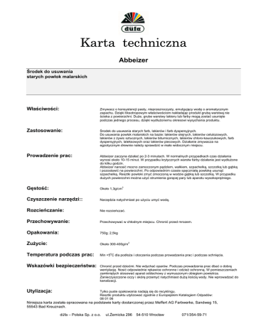 Karta techniczna Abbeizer Środek do usuwania starych powłok malarskich Właściwości: Zmywacz o konsystencji pasty, nieprzezroczysty, emulgujący wodę o aromatycznym zapachu. Dzięki tiksotropowym właściwościom nakładając produkt grubą warstwą nie ścieka z powierzchni. Duże, grube warstwy lakieru lub farby mogą zostać usunięte podczas jednego procesu, dzięki wydłużonemu okresowi wysychania produktu. Zastosowanie: Środek do usuwania starych farb, lakierów i farb dyspersyjnych. Do usuwania powłok malarskich na bazie: lakierów olejnych, lakierów celulozowych, lakierów z żywic sztucznych, lakierów bitumicznych, lakierów chloro-kauczukowych, farb dyspersyjnych, lateksowych oraz lakierów piecowych. Działanie zmywacza na egzotycznym drewnie należy sprawdzić w mało widocznym miejscu. Prowadzenie prac: Abbeizer zaczyna działać po 2-3 minutach. W normalnych przypadkach czas działania wynosi około 10-15 minut. W przypadku krytycznych warstw farby działanie jest wydłużone do kilku godzin. Abbeizer nanosić mocno zamoczonym pędzlem, wałkiem, szpachelką, szczotką lub gąbką i pozostawić na powierzchni. Po odpowiednim czasie spęczniałą powłokę usunąć szpachelką. Resztki powłoki zmyć zmoczoną w wodzie gąbką lub szczotką. W przypadku dużych powierzchni można użyć strumienia gorącej pary lub aparatu wysokoprężnego. Gęstość: Około 1,3g/cm Czyszczenie narzędzi:: Narzędzia natychmiast po użyciu umyć wodą. Rozcieńczanie: Nie rozcieńczać. Przechowywanie: Przechowywać w chłodnym miejscu. Chronić przed mrozem. Opakowania: 750g; 2,5kg Zużycie: Około 300-400g/m Temperatura podczas prac: Min +5 C dla podłoża i otoczenia podczas prowadzenia prac i podczas schnięcia. Wskazówki bezpieczeństwa: Chronić przed dziećmi. Nie wdychać oparów. Podczas prowadzenia prac dbać o dobrą wentylację. Nosić odpowiednie rękawice ochronne i odzież ochronną. W pomieszczeniach zamkniętych stosować aparat oddechowy z wymuszonym obiegiem powietrza. Zanieczyszczone oczy i skórę przemyć natychmiast dużą ilością wody. Nie wprowadzać do kanalizacji. Utylizacja: Tylko puste opakowania nadają się do recyklingu. Resztki produktu utylizować zgodnie z Europejskim Katalogiem Odpadów: 08 01 06 3 2 0 Niniejsza karta została opracowana na podstawie karty dostarczonej przez Meffert AG Farbwerke, Sandweg 15, 55543 Bad Kreuznach. düfa – Polska Sp. z o.o. ul.Żernicka 296 54-510 Wrocław 071/354-59-71