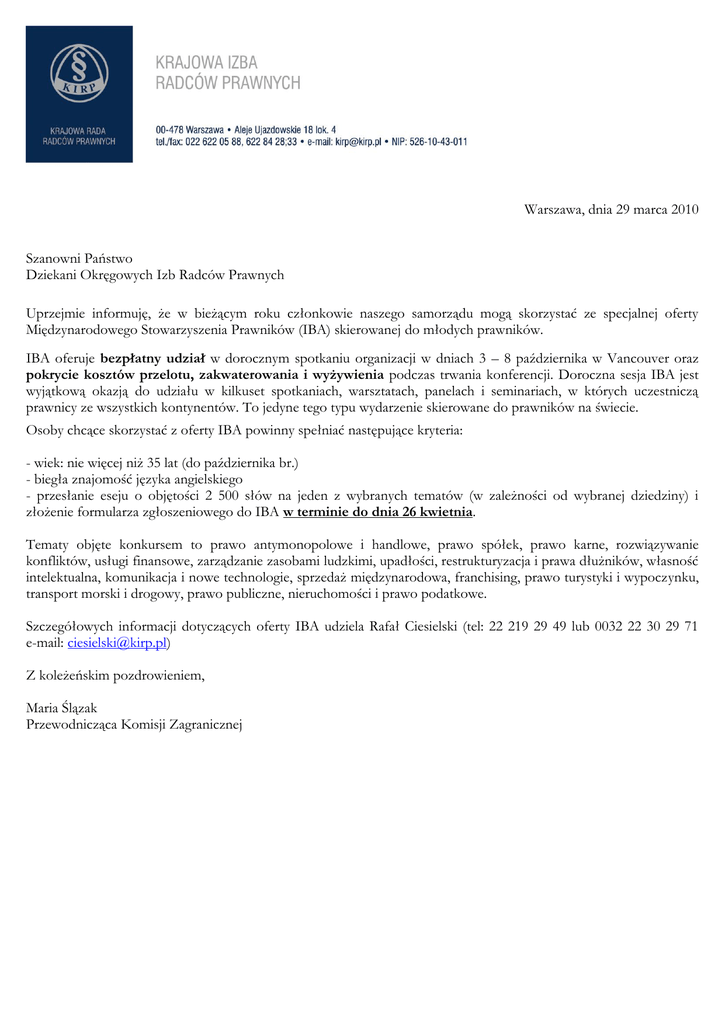 Warszawa, dnia 29 marca 2010 Szanowni Państwo Dziekani Okręgowych Izb Radców Prawnych Uprzejmie informuję, że w bieżącym roku członkowie naszego samorządu mogą skorzystać ze specjalnej oferty Międzynarodowego Stowarzyszenia Prawników (IBA) skierowanej do młodych prawników. IBA oferuje bezpłatny udział w dorocznym spotkaniu organizacji w dniach 3 – 8 października w Vancouver oraz pokrycie kosztów przelotu, zakwaterowania i wyżywienia podczas trwania konferencji. Doroczna sesja IBA jest wyjątkową okazją do udziału w kilkuset spotkaniach, warsztatach, panelach i seminariach, w których uczestniczą prawnicy ze wszystkich kontynentów. To jedyne tego typu wydarzenie skierowane do prawników na świecie. Osoby chcące skorzystać z oferty IBA powinny spełniać następujące kryteria: - wiek: nie więcej niż 35 lat (do października br.) - biegła znajomość języka angielskiego - przesłanie eseju o objętości 2 500 słów na jeden z wybranych tematów (w zależności od wybranej dziedziny) i złożenie formularza zgłoszeniowego do IBA w terminie do dnia 26 kwietnia. Tematy objęte konkursem to prawo antymonopolowe i handlowe, prawo spółek, prawo karne, rozwiązywanie konfliktów, usługi finansowe, zarządzanie zasobami ludzkimi, upadłości, restrukturyzacja i prawa dłużników, własność intelektualna, komunikacja i nowe technologie, sprzedaż międzynarodowa, franchising, prawo turystyki i wypoczynku, transport morski i drogowy, prawo publiczne, nieruchomości i prawo podatkowe. Szczegółowych informacji dotyczących oferty IBA udziela Rafał Ciesielski (tel: 22 219 29 49 lub 0032 22 30 29 71 e-mail: [email protected]) Z koleżeńskim pozdrowieniem, Maria Ślązak Przewodnicząca Komisji Zagranicznej