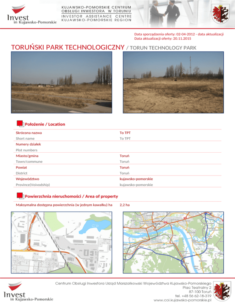 Data sporządzenia oferty: 02-04-2012 - data aktualizacji Data aktualizacji oferty: 20.11.2015 TORUŃSKI PARK TECHNOLOGICZNY / TORUN TECHNOLOGY PARK Położenie / Location Skrócona nazwa To TPT Short name To TPT Numery działek Plot numbers Miasto/gmina Toruń Town/commune Toruń Powiat Toruń District Toruń Województwo kujawsko-pomorskie Province(Voivodship) kujawsko-pomorskie Powierzchnia nieruchomości / Area of property Maksymalna dostępna powierzchnia (w jednym kawałku) ha 2,2 ha TORUŃSKI PARK TECHNOLOGICZNY / TORUN TECHNOLOGY PARK Powierzchnia nieruchomości / Area of property Max. area available (as one piece) ha 2,2 ha Kształt działki ZBLIŻONY DO PROSTOKĄTA Shape of the site APPROXIMATED TO RECTANGLE Możliwości powiększenia terenu N Possibility for expansion N Informacje dotyczące nieruchomości / Property information Właściciel/własciciele Owners Aktualny plan zagospodarowania przestrzennego (T/N) T Valid zoning plan (Y/N) Y Przeznaczenie w miejscowym planie zagospodarowania przestrzennego 1.18-U/P2: TERENY USŁUGOWO- PRODUKCYJNE (uchwała nr 131/07 Rady Miasta Torunia z dnia 2 sierpnia 2007r.) Zoning 1.18-U/P2: SERVICE AREA – PRODUCTION (Resolution no 131/07 of Torun City Council on 2nd August 2007) Charakterystyka działki / Land specification Klasyfikacja gruntów wraz z powierzchnią [ha] ODROLNIONY / ODLESIONY R V: 0,5855 ha R VI: 1,6239 ha Soil class with area [ha] STATUS CHANGED FROM AGRICULTURAL AND FORESTRY R V: 0,5855 ha R VI: 1,6239 ha Różnica poziomów terenu [m] 0,5 Differences in land level[m] 0,5 Ograniczenie wysokosci budynków [m] Building height limit [m] Procent dopuszczalnej zabudowy [%] Building coverage [%] Obecne użytkowanie NIEUŻYTEK Present usage WASTELAND Zanieczyszczenia wód powierzchniowych i gruntowych (T/N) N Soil and underground water pollution (Y/N) N Poziom wód gruntowych [m] PONIŻEJ 7m Underground water level [m] BELOW 7m Czy były prowadzone badania geologiczne terenu (T/N) N Were geological research done (Y/N) N Ryzyko wystąpienia zalań lub obsunięć terenu (T/N) N Risk of flooding or land slide (Y/N) N Przeszkody podziemne (T/N) N TORUŃSKI PARK TECHNOLOGICZNY / TORUN TECHNOLOGY PARK Charakterystyka działki / Land specification Underground obstacles(Y/N) N Przeszkody występujące na powierzchni terenu (T/N) N Ground and overhead obstacles (Y/N) N Istniejące ograniczenia ekologiczne (T/N) N Ecological restrictions(Y/N) N Budynki i zabudowania na terenie (T/N) N Buildings and obstacles N Połączenia transportowe / Transport links Droga dojazdowa do terenu (rodzaj drogi i jej szerokość) ASFALT, 7m Access road to the plot (type and width of access road) ASPHALT, 7m Autostrada / droga krajowa [km] AUTOSTRADA NR A1: 2 km DROGA KRAJOWA NR 91: 100 m Nearest motorway / national road [km] MOTORWAY no A1: 2 km NATIONAL ROAD no 91: 100 m Porty rzeczne i morskie w odległości do 200 km PORT RZECZNY – TORUŃ (7 km), TCZEW (140 km) PORT MORSKI – GDAŃSK (170 km), GDYNIA (195 km), ELBLĄG (185 km) Sea and river ports located up to 200 km RIVER PORT – TORUN (7 km), TCZEW (140 km), GDANSK (170 km) SEA PORT- GDAŃSK (170 km), GDYNIA (195 km), ELBLAG (185 km) Kolej [km] TORUŃ, 3km Railway line [km] TORUŃ, 3km Bocznica kolejowa [km] TORUŃ, 3km Railway siding (Y/N) TORUŃ, 3km Najbliższe lotnisko międzynarodowe [km] BYDGOSZCZ, 50 km Nearest international airport [km] BYDGOSZCZ, 50 km Najbliższe miasto wojewódzkie [km] BYDGOSZCZ, 50 km Nearest province capital [km] BYDGOSZCZ, 50 km Istniejąca infrastruktura / Existing infrastructure Elektryczność na terenie (T/N) T Electricity (Y/N) Y Gaz na terenie (T/N) T Gas (Y/N) Y Woda na terenie (T/N) TAK (DO CELÓW PRZEMYSŁOWYCH I SOCJALNO-BYTOWYCH) Water supply (Y/N) YES (INDUSTRIAL AND SOCIAL PURPOSES) Kanalizacja sanitarna na terenie (T/N) T Sewage discharge (Y/N) Y Odległość przyłącza kanalizacji od granicy terenu [m] TORUŃSKI PARK TECHNOLOGICZNY / TORUN TECHNOLOGY PARK Istniejąca infrastruktura / Existing infrastructure Connection point (distance from boundary) [m] Dostępna objętość (kanalizacja) Available capacity Oczyszczalnia ścieków na terenie bądź w bezpośrednim sąsiedztwie (T/N) N Treatment plant (Y/N) N Telefony (T/N) T Telephone (Y/N) Y Odległość przyłącza telefonicznego od granicy terenu [m] Connection point (distance from boundary) [m] Uwagi / Comments Uwagi Comments