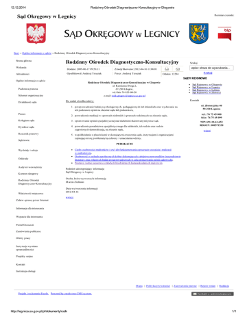 12.12.2014 Rodzinny Ośrodek Diagnostyczno-Konsultacyjny w Głogowie Sąd Okręgowy w Legnicy Rozmiar czcionki: Start -› Ogólne informacje o sądzie -› Rodzinny Ośrodek Diagnostyczno-Konsultacyjny Strona główna Wokanda Aktualności Rodzinny Ośrodek Diagnostyczno-Konsultacyjny Dodano: 2009-06-17 09:56:11 Zmodyfikowano: 2012-04-16 11:06:01 Opublikował: Andrzej Trzeciak Przez: Andrzej Trzeciak wpisz słowa do wyszukania... S zukaj Odsłon: 12294 SĄDY REJONOWE Ogólne informacje o sądzie Rodzinny Ośrodek Diagnostyczno-Konsultacyjny w Głogowie ul. Kamienna Droga 2, 67-200 Głogów, tel./faks 76 835-00-20 e-mail: [email protected] Podstawa prawna Schemat organizacyjny Działalność sądu Szukaj 1. przeprowadzanie badań psychologicznych, pedagogicznych lub lekarskich oraz wydawanie na ich podstawie opinii na zlecenie sądu lub prokuratora, ul. Złotoryjska 40 59-220 Legnica 2. prowadzenie mediacji w sprawach nieletnich i sprawach rodzinnych na zlecenie sądu, tel.: 76 75 45 000 faks: 76 75 45 099 Kolegium sądu 3. sprawowanie opieki specjalistycznej nad nieletnimi skierowanymi przez sąd, Dyrektor sądu 4. prowadzenie poradnictwa specjalistycznego dla nieletnich, ich rodzin oraz rodzin zagrożonych demoralizacją, na zlecenie sądu, Rzecznik prasowy 5. współdziałanie z placówkami wykonującymi orzeczenia sądu, instytucjami i organizacjami zajmującymi się problematyką ochrony i umacniania rodziny. Sędziowie w Głogowie w Legnicy w Lubinie w Złotoryi Kontakt Do zadań ośrodka należy: Prezes Sąd Rejonowy Sąd Rejonowy Sąd Rejonowy Sąd Rejonowy NIP: 691-10-61-653 REGON: 000571530 więcej PUBLIKACJE Cechy osobowości małżonków i styl ich funkcjonowania a poczucie szczęścia i realizacji w małżeństwie, Osobowość o cechach aspołecznych kobiet dokonujących zabójstwa noworodków (na podstawie literatury oraz własnych badań przeprowadzonych w celu opracowania opinii sądowych), Postawy wobec ojcostwa u młodych bezdzietnych homoseksulanych mężczyzn. Wydziały i sekcje Oddziały Audytor wewnętrzny Kurator okręgowy Rodzinny Ośrodek Diagnostyczno-Konsultacyjny Właściwość miejscowa Podmiot udostępniający informację Sąd Okręgowy w Legnicy Osoba, która wytworzyła informację M arcin Zieliński Data wytworzenia informacji 2012-04-16 wstecz Załatw sprawę przez Internet Informacje dla interesanta Wsparcie dla interesanta Portal Orzeczeń Zamówienia publiczne Oferty pracy Instytucje wymiaru sprawiedliwości Projekty unijne Kontakt Instrukcja obsługi M apa | Polityka prywatności | Zastrzeżenia prawne | Rejestr zmian | Redakcja Projekt i wykonanie Excelo. Powered by excelo true CM S system. http://legnica.so.gov.pl/pl/dokumenty/rodk 1/1