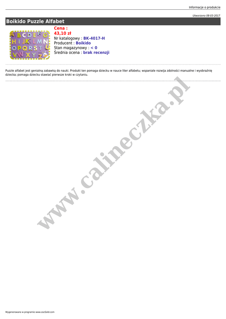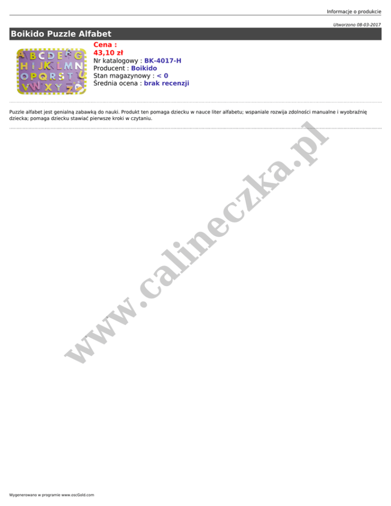 Informacje o produkcie Utworzono 08-03-2017 Boikido Puzzle Alfabet Cena : 43,10 zł Nr katalogowy : BK-4017-H Producent : Boikido Stan magazynowy : < 0 Średnia ocena : brak recenzji w w w .c al in ec zk a. pl Puzzle alfabet jest genialną zabawką do nauki. Produkt ten pomaga dziecku w nauce liter alfabetu; wspaniale rozwija zdolności manualne i wyobraźnię dziecka; pomaga dziecku stawiać pierwsze kroki w czytaniu. Wygenerowano w programie www.oscGold.com