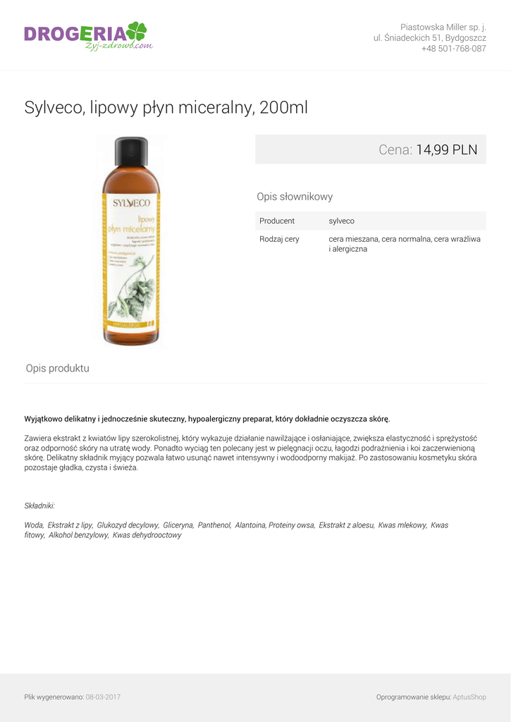 Piastowska Miller sp. j. ul. Śniadeckich 51, Bydgoszcz +48 501-768-087 Sylveco, lipowy płyn miceralny, 200ml Cena: 14,99 PLN Opis słownikowy Producent sylveco Rodzaj cery cera mieszana, cera normalna, cera wrażliwa i alergiczna Opis produktu Wyjątkowo delikatny i jednocześnie skuteczny, hypoalergiczny preparat, który dokładnie oczyszcza skórę. Zawiera ekstrakt z kwiatów lipy szerokolistnej, który wykazuje działanie nawilżające i osłaniające, zwiększa elastyczność i sprężystość oraz odporność skóry na utratę wody. Ponadto wyciąg ten polecany jest w pielęgnacji oczu, łagodzi podrażnienia i koi zaczerwienioną skórę. Delikatny składnik myjący pozwala łatwo usunąć nawet intensywny i wodoodporny makijaż. Po zastosowaniu kosmetyku skóra pozostaje gładka, czysta i świeża. Składniki: Woda, Ekstrakt z lipy, Glukozyd decylowy, Gliceryna, Panthenol, Alantoina, Proteiny owsa, Ekstrakt z aloesu, Kwas mlekowy, Kwas fitowy, Alkohol benzylowy, Kwas dehydrooctowy Plik wygenerowano: 08-03-2017 Oprogramowanie sklepu: AptusShop Piastowska Miller sp. j. ul. Śniadeckich 51, Bydgoszcz +48 501-768-087 Galeria Plik wygenerowano: 08-03-2017 Powered by TCPDF (www.tcpdf.org) Oprogramowanie sklepu: AptusShop