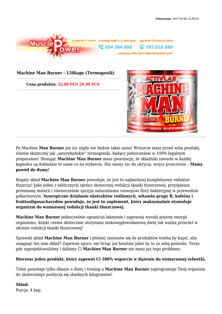 Utworzono: 2017-03-08 12:09:03 Machine Man Burner - 120kaps (Termogenik) Cena produktu: 52,00 PLN 29,90 PLN Po Machine Man Burner już nic nigdy nie będzie takie samo! Wreszcie masz przed sobą produkt, równie skuteczny jak „amerykańskie” termogeniki, będący jednocześnie w 100% legalnym preparatem! Stosując Machine Man Burner masz gwarancję, że składniki zawarte w każdej kapsułce są dokładnie te same co na etykiecie. Nie mamy nic do ukrycia, wręcz przeciwnie – Mamy powód do dumy! Bogaty skład Machine Man Burner powoduje, że jest to najbardziej kompleksowy reduktor tłuszczu! Jako jeden z nielicznych oprócz skutecznej redukcji tkanki tłuszczowej, przyśpiesza przemianę materii i równocześnie sprzyja naturalnemu rozwojowi flory bakteryjnej w przewodzie pokarmowym. Synergiczne działanie ekstraktów roślinnych, witamin grupy B, kofeiny i fruktooligosacharydów powoduje, że jest to suplement, który maksymalnie stymuluje organizm do wzmożonej redukcji tkanki tłuszczowej. Machine Man Burner jednocześnie ogranicza łaknienie i zapewnia wysoki poziom energii organizmu, dzięki czemu skutecznie utrzymasz niskowęglowodanową dietę tak ważną przecież w okresie redukcji tkanki tłuszczowej! Sprawdź skład Machine Man Burner i później zastanów się ile produktów trzeba by kupić, aby osiągnąć ten sam skład? Zapewne sporo, nie licząc już kosztów jakie by to za sobą poniosło. Teraz gdy zaprojektowaliśmy i daliśmy Ci Machine Man Burner nie masz już tego problemu. Bierzesz jeden produkt, który zapewni Ci 100% wsparcie w dążeniu do wymarzonej sylwetki. Tobie pozostaje tylko dbanie o dietę i trening a Machine Man Burner zaprogramuje Twój organizm do skutecznego pozbycia się zbędnych kilogramów! Skład: Porcja: 4 kap. Porcji w opakowaniu: 30 Opakowanie: 120 kap. Wartość odżywcza w Porcji 4 kapsułki L-karnityna 500 mg Tauryna 500 mg FOS 200 mg Kofeina 156 mg L-tryptofan 150 mg L-tyrozyna 200 mg L-fenyloalanina 100 mg Inulina 200 mg Kwas alfa-liponowy 100 mg Inozytol 50 mg Ekstrakt z gorzkiej pomarańczy 335 mg Ekstrakt z zielonej herbaty 223 mg Ekstrakt z Garcinia cambogia 167 mg Ekstrakt z guarany 200 mg Ekstrakt z mniszka lekarskiego 150 mg Ekstraktt ze skrzypu polnego 150 mg Ekstrakt z morszczynu pęcherzykowatego 150 mg Ekstrakt z pieprzu czarnego 5.3 mg Pieprz Cayenne 100 mg Witamina B1 1.1 mg Witamina B2 1.4 mg Niacyna 16 mg Kwas pantotenowy 6 mg Witamina B6 1.4 mg Biotyna 50 µg Kwas foliowy 200 mg Witamina B12 2.5 mcg Chrom 200 mg Dawkowanie: Rekomendowane dawkowanie odżywki to 2 kapsułki 2 razy dziennie. Adres: http://www.muscle.trustnet.pl/ Telefon: 34 36 43 000, 782 010 880 Email: [email protected]