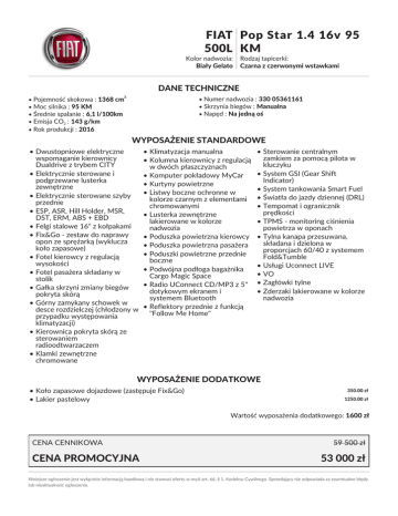 FIAT Pop Star 1.4 16v 95 500L KM Kolor nadwozia: Biały Gelato Rodzaj tapicerki: Czarna z czerwonymi wstawkami DANE TECHNICZNE 3 • Numer nadwozia : 330 05361161 • Skrzynia biegów : Manualna • Napęd : Na jedną oś • Pojemność skokowa : 1368 cm • Moc silnika : 95 KM • Średnie spalanie : 6,1 l/100km • Emisja CO2 : 143 g/km • Rok produkcji : 2016 WYPOSAŻENIE STANDARDOWE • Dwustopniowe elektryczne wspomaganie kierownicy Dualdrive z trybem CITY • Elektrycznie sterowane i podgrzewane lusterka zewnętrzne • Elektrycznie sterowane szyby przednie • ESP, ASR, Hill Holder, MSR, DST, ERM, ABS + EBD • Felgi stalowe 16" z kołpakami • Fix&Go - zestaw do naprawy opon ze sprężarką (wyklucza koło zapasowe) • Fotel kierowcy z regulacją wysokości • Fotel pasażera składany w stolik • Gałka skrzyni zmiany biegów pokryta skórą • Górny zamykany schowek w desce rozdzielczej (chłodzony w przypadku występowania klimatyzacji) • Kierownica pokryta skórą ze sterowaniem radioodtwarzaczem • Klamki zewnętrzne chromowane • Klimatyzacja manualna • Kolumna kierownicy z regulacją w dwóch płaszczyznach • Komputer pokładowy MyCar • Kurtyny powietrzne • Listwy boczne ochronne w kolorze czarnym z elementami chromowanymi • Lusterka zewnętrzne lakierowane w kolorze nadwozia • Poduszka powietrzna kierowcy • Poduszka powietrzna pasażera • Poduszki powietrzne przednie boczne • Podwójna podłoga bagażnika Cargo Magic Space • Radio UConnect CD/MP3 z 5" dotykowym ekranem i systemem Bluetooth • Reflektory przednie z funkcją "Follow Me Home" • Sterowanie centralnym zamkiem za pomocą pilota w kluczyku • System GSI (Gear Shift Indicator) • System tankowania Smart Fuel • Światła do jazdy dziennej (DRL) • Tempomat i ogranicznik prędkości • TPMS - monitoring ciśnienia powietrza w oponach • Tylna kanapa przesuwana, składana i dzielona w proporcjach 60/40 z systemem Fold&Tumble • Usługi Uconnect LIVE • VO • Zagłówki tylne • Zderzaki lakierowane w kolorze nadwozia WYPOSAŻENIE DODATKOWE • Koło zapasowe dojazdowe (zastępuje Fix&Go) • Lakier pastelowy 350.00 zł 1250.00 zł Wartość wyposażenia dodatkowego: 1600 zł CENA CENNIKOWA CENA PROMOCYJNA 59 500 zł 53 000 zł Niniejsze ogłoszenie jest wyłącznie informacją handlową i nie stanowi oferty w myśl art. 66, § 1. Kodeksu Cywilnego. Sprzedający nie odpowiada za ewentualne błędy lub nieaktualność ogłoszenia.