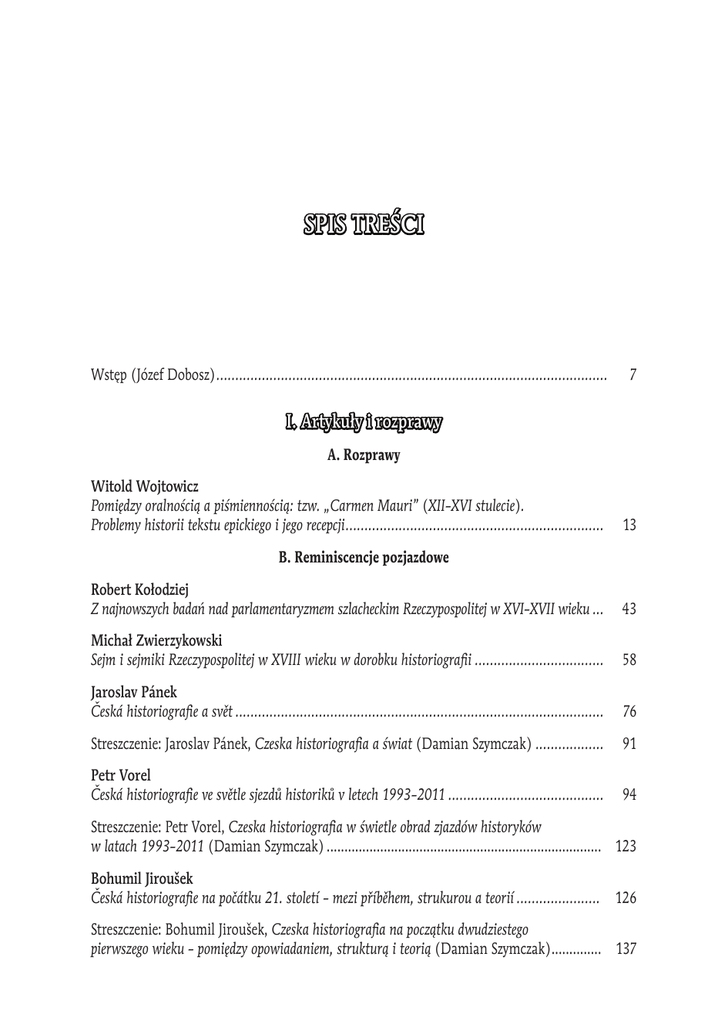 SPIS TREŚCI Wstęp (Józef Dobosz)........................................................................................................ 7 I. Artykuły i rozprawy A. Rozprawy Witold Wojtowicz Pomiędzy oralnością a piśmiennością: tzw. „Carmen Mauri” (XII–XVI stulecie). Problemy historii tekstu epickiego i jego recepcji..................................................................... 13 B. Reminiscencje pozjazdowe Robert Kołodziej Z najnowszych badań nad parlamentaryzmem szlacheckim Rzeczypospolitej w XVI–XVII wieku.... 43 Michał Zwierzykowski Sejm i sejmiki Rzeczypospolitej w XVIII wieku w dorobku historiografii................................... 58 Jaroslav Pánek Česká historiografie a svět.................................................................................................. 76 Streszczenie: Jaroslav Pánek, Czeska historiografia a świat (Damian Szymczak)................... 91 Petr Vorel Česká historiografie ve světle sjezdů historiků v letech 1993–2011.......................................... 94 Streszczenie: Petr Vorel, Czeska historiografia w świetle obrad zjazdów historyków w latach 1993–2011 (Damian Szymczak).............................................................................. 123 Bohumil Jiroušek Česká historiografie na počátku 21. století – mezi příběhem, strukurou a teorií....................... 126 Streszczenie: Bohumil Jiroušek, Czeska historiografia na początku dwudziestego pierwszego wieku – pomiędzy opowiadaniem, strukturą i teorią (Damian Szymczak)............... 137 4 Spis treści Lenka Řezníková, Miloš Řezník Hranice a identita v českém histori(ografi)ckém kontextu..................................................... 140 Streszczenie: Lenka Řezníková, Miloš Řezník, Granice i tożsamość w czeskim kontekście historycznym (historiograficznym) (Marzena Matla)............................................................. 155 II. Recenzje Piotr Cugowski Myśl polityczna Jędrzeja Giertycha, Wydawnictwo My Book, Szczecin 2012 (Anna Piesiak-Robak)............................................................................................................ 160 Andor Mészáros, A cseh elem a magyar polgárosodásban, Pázmány Péter Katolikus Egyetem Bölcsészettudományi Kar, Szent István Társulat, Budapest – Piliscsaba – Esztergom 2011 (Szabolcs Németh).................................................................................... 165 III. Sprawozdania Międzynarodowa konferencja naukowa Wielkopolska, Galicja i Królestwo Polskie. Jedna czy trzy historie? (Damian Szymczak)...................................................................... 172 Międzynarodowa konferencja naukowa Wzajemny obraz sąsiada w polskich i czeskich podręcznikach szkolnych, Ostrawa, 24–25 maja 2013 roku (Danuta Konieczka-Śliwińska)........................................................................................ 179 Wykaz skrótów....................................................................................................................... 182 Informacje dla autorów.......................................................................................................... 183 Informace pro autory............................................................................................................. 186 OBSAH Úvod (Józef Dobosz)......................................................................................................... 9 I. Články a studie A. Studie Witold Wojtowicz Mezi mluveným a psaným: tzv. „Carmen Mauri” (12.–16. století). Problémy dějin epického textu a jeho recepce .............................................................................. 13 B. Reminiscence po sjezdech polských a českých historiků Robert Kołodziej Z nejnovějších bádání šlechtického parlamentarismu v Polsku v 16.–17. století......................... 43 Michał Zwierzykowski Sněm a krajské sněmy v Polsku 18. století v historiografii ..................................................... 58 Jaroslav Pánek Česká historiografie a svět.................................................................................................. 76 Resumé: Jaroslav Pánek, Czeska historiografia a świat (Damian Szymczak)........................... 91 Petr Vorel Česká historiografie ve světle sjezdů historiků v letech 1993–2011.......................................... 94 Resumé: Petr Vorel, Czeska historiografia w świetle obrad zjazdów historyków w latach 1993–2011 (Damian Szymczak).............................................................................. 123 Bohumil Jiroušek Česká historiografie na počátku 21. století – mezi příběhem, strukturou a teorií...................... 126 Resumé: Bohumil Jiroušek, Czeska historiografia na początku dwudziestego pierwszego wieku – pomiędzy opowiadaniem, strukturą i teorią (Damian Szymczak).......................................... 137 6 Obsah Lenka Řezníková, Miloš Řezník Hranice a identita v českém histori(ografi)ckém kontextu..................................................... 140 Resumé: Lenka Řezníková, Miloš Řezník, Granice i tożsamość w czeskim kontekście historycznym (historiograficznym) (Marzena Matla).............................................................. 155 II. Recenze Piotr Cugowski, Myśl polityczna Jędrzeja Giertycha, Wydawnictwo My Book, Szczecin 2012 (Anna Piesiak-Robak)..................................................................................................... 160 Andor Mészáros, A cseh elem a magyar polgárosodásban, Pázmány Péter Katolikus Egyetem Bölcsészettudományi Kar, Szent István Társulat, Budapest – Piliscsaba – Esztergom 2011 (Szabolcs Németh).......................................................................................................... 165 III. Zprávy Mezinárodní vědecká konference Wielkop