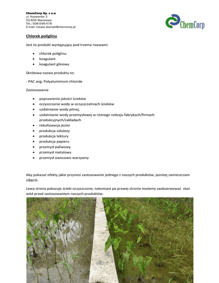 ChemCorp Sp. z o.o ul. Ksawerów 3 02-656 Warszawa Tel.: 508-549-478 E-mail: [email protected] Chlorek poliglinu Jest to produkt występujący pod trzema nazwami: chlorek poliglinu koagulant koagulant glinowy Skrótowa nazwa produktu to: - PAC ang. Polyaluminium chloride Zastosowanie poprawienie jakości ścieków oczyszczanie wody w oczyszczalniach ścieków uzdatnianie wody pitnej, uzdatnianie wody przemysłowej w różnego rodzaju fabrykach/firmach produkcyjnych/zakładach rekultywacja jezior produkcja celulozy produkcja tektury produkcja papieru przemysł paliwowy przemysł metalowy przemysł owocowo-warzywny Aby pokazać efekty jakie przynosi zastosowanie jednego z naszych produktów, poniżej zamieszczam zdjęcie. Lewa strona pokazuje ścieki oczyszczone, natomiast po prawej stronie możemy zaobserwować stan wód przed zastosowaniem naszych produktów.