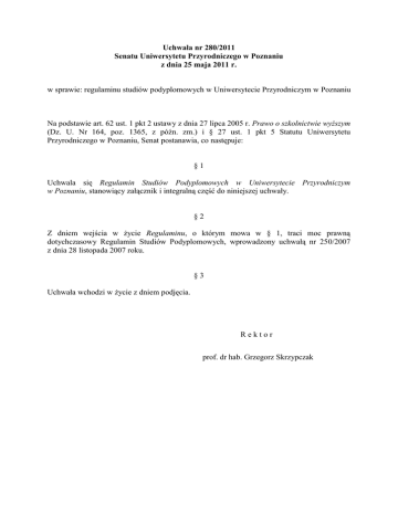 Uchwała nr 280/2011 Senatu Uniwersytetu Przyrodniczego w Poznaniu z dnia 25 maja 2011 r. w sprawie: regulaminu studiów podyplomowych w Uniwersytecie Przyrodniczym w Poznaniu Na podstawie art. 62 ust. 1 pkt 2 ustawy z dnia 27 lipca 2005 r. Prawo o szkolnictwie wyższym (Dz. U. Nr 164, poz. 1365, z późn. zm.) i § 27 ust. 1 pkt 5 Statutu Uniwersytetu Przyrodniczego w Poznaniu, Senat postanawia, co następuje: §1 Uchwala się Regulamin Studiów Podyplomowych w Uniwersytecie Przyrodniczym w Poznaniu, stanowiący załącznik i integralną część do niniejszej uchwały. §2 Z dniem wejścia w życie Regulaminu, o którym mowa w § 1, traci moc prawną dotychczasowy Regulamin Studiów Podyplomowych, wprowadzony uchwałą nr 250/2007 z dnia 28 listopada 2007 roku. §3 Uchwała wchodzi w życie z dniem podjęcia. Rektor prof. dr hab. Grzegorz Skrzypczak Załącznik do uchwały nr 280/2011 Senatu UP REGULAMIN Studiów Podyplomowych w Uniwersytecie Przyrodniczym w Poznaniu Opracowany na podstawie art. 8 ust. 1 i art. 62 ust. 1 pkt 2 ustawy z dnia 27 lipca 2005 roku – Prawo o szkolnictwie wyższym (Dz. U. Nr 164, poz. 1365, z późniejszymi zmianami) I. POSTANOWIENIA OGÓLNE §1 Regulamin Studiów Podyplomowych w Uniwersytecie Przyrodniczym w Poznaniu, zwany dalej regulaminem, określa ogólne zasady tworzenia i prowadzenia studiów podyplomowych, zasady odpłatności oraz prawa i obowiązki słuchaczy tych studiów. §2 1. Studia podyplomowe, zwane dalej studiami, prowadzi wydział lub instytut/katedra albo ogólnouczelniana jednostka dydaktyczna. 2. Studia mogą być także prowadzone przez jednostki, o których mowa w ust. 1, we współpracy z innymi jednostkami uczelni i instytucjami naukowymi spoza uczelni, na podstawie porozumienia. 3. Zawarcie porozumienia, o którym mowa w ust. 2, wymaga zgody Rektora. §3 1. Utworzenie lub zniesienie studiów a także zmiana nazwy następuje na podstawie zarządzenia Rektora wydanego na wniosek dziekana lub przewodniczącego Rady ds. Ogólnouczelnianych Jednostek Dydaktycznych, zaopiniowany przez radę wydziału lub Radę ds. Ogólnouczelnianych Jednostek Dydaktycznych. 2. Nadzór nad realizacją studiów sprawuje dziekan lub przewodniczący Rady ds. Ogólnouczelnianych Jednostek Dydaktycznych. 3. Jednostką koordynującą studia w ramach Uniwersytetu Przyrodniczego w Poznaniu, zwanego dalej Uczelnią, jest Centrum Kształcenia Ustawicznego (CKU). §4 1. Studia są prowadzone w języku polskim lub obcym. 2. Zajęcia dydaktyczne mogą być prowadzone z wykorzystaniem metod kształcenia na odległość. 3. Studia odbywają się według planu i programu uchwalonego przez radę wydziału lub Radę ds. Ogólnouczelnianych Jednostek Dydaktycznych oraz zgodnie z niniejszym regulaminem. §5 1. Studia są odpłatne. Warunki odpłatności określa pisemna umowa zawarta między Uczelnią a słuchaczem. 2. Podstawą ustalania odpłatności jest kalkulacja, obejmująca wszystkie koszty bezpośrednie i pośrednie. 3. Kalkulację, o której mowa w ust. 2, sporządza się dla każdej edycji studiów. Zatwierdzenie kalkulacji stanowi podstawę do uruchomienia edycji. 4. Studia podyplomowe mogą być finansowane lub dofinansowane przez instytucje zewnętrzne, w tym ze środków pomocowych Unii Europejskiej. W takim przypadku wysokość opłat ustala się z uwzględnieniem zasad finansowania lub dofinansowania tych studiów. 5. W przypadku organizowania studiów na zamówienie jednostki pozauczelnianej, kwotę obejmującą całkowity koszt prowadzenia wpłaca jednostka zamawiająca, nawet gdy liczba osób skierowanych na studia jest mniejsza od przyjętej w kalkulacji. 6. Warunkiem rozpoczęcia zajęć na studiach finansowanych zgodnie z ust. 4 i 5 jest uzyskanie opłaty od instytucji zewnętrznej lub od jednostki zlecającej prowadzenie studiów. II. UTWORZENIE I WZNOWIENIE STUDIÓW §6 1. Wniosek o utworzenie lub wznowienie studiów składa Rektorowi dziekan lub przewodniczący Rady ds. Ogólnouczelnianych Jednostek Dydaktycznych. 2. Wniosek o utworzenie studiów należy złożyć do Rektora nie później niż dwa miesiące przed planowanym terminem rozpoczęcia, a o wznowienie nie później niż miesiąc przed terminem rozpoczęcia. §7 1. Wniosek o utworzenie studiów zawiera: 1) uchwałę rady w sprawie utworzenia studiów, 2) informację zawierającą nazwę studiów, cel, tryb, zakres programowy i czas trwania, 3) propozycję kandydata na kierownika, 4) imienny wykaz wykładowców i pracownika obsługi, 5) plan i program studiów, 6) przewidywaną liczbę słuchaczy, 7) szczegółowe warunki i tryb rekrutacji, 8) zakres wymagań stawianych kandydatom, 9) przewidywany termin rozpoczęcia i zakończenia zajęć, 10) kalkulację sporządzoną dla minimalnej liczby słuchaczy warunkującej pokrycie kosztów, 11) warunki uzyskania świadectwa ukończenia studiów. 2. W przypadku organizowania studiów na zamówienie jednostki pozauczelnianej, poza dokumentami, o których mowa w ust. 2, należy dołączyć dokument potwierdzający uzgodnienie programu oraz zobowiązanie do pokrycia kosztów realizacji. §8 Wniosek o wznowienie studiów zawiera: 1) plan i program studiów, 2) propozycję kandydata na kierownika, 3) imienny wykaz wykładowców i pracownika obsługi, 4) uchwałę rady dotyczącą spraw, o których mowa w pkt. 1 i 2, 5) kalkulację sporządzoną dla minimalnej liczby słuchaczy warunkującej pokrycie kosztów. III. KIEROWNIK STUDIÓW §9 1. Kierownikiem studiów jest nauczyciel akademicki zatrudniony w Uniwersytecie Przyrodniczym w Poznaniu. 2. W wyjątkowych przypadkach kierownikiem może być specjalista spoza Uczelni, posiadający co najmniej stopień naukowy doktora. 3. Kierownika powołuje Rektor na wniosek dziekana lub przewodniczącego Rady ds. Ogólnouczelnianych Jednostek Dydaktycznych, za zgodą rady tej jednostki. 4. Zasady wynagradzania kierownika regulują odrębne przepisy. § 10 Do obowiązków kierownika studiów należy: 1) opracowanie 