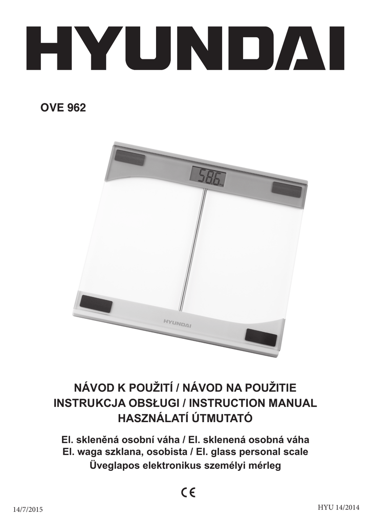 OVE 962 NÁVOD K POUŽITÍ / NÁVOD NA POUŽITIE INSTRUKCJA OBSŁUGI / INSTRUCTION MANUAL HASZNÁLATÍ ÚTMUTATÓ El. skleněná osobní váha / El. sklenená osobná váha El. waga szklana, osobista / El. glass personal scale Üveglapos elektronikus személyi mérleg 14/7/2015 HYU 14/2014 Vážený zákazníku, děkujeme Vám za zakoupení našeho produktu. Před uvedením tohoto přístroje do provozu si velmi pozorně přečtěte návod k obsluze a tento návod spolu se záručním listem, pokladním dokladem a podle možností i s obalem a vnitřním obsahem obalu dobře uschovejte. Všeobecné bezpečnostní pokyny • P řed prvním uvedením do provozu si pečlivě přečtěte návod k obsluze, prohlédněte vyobrazení a návod si uschovejte pro budoucí použití. Instrukce v návodu považujte za součást spotřebiče a postupte je jakémukoliv dalšímu uživateli spotřebiče. • Spotřebič je určen pouze pro použití v domácnosti a podobné účely! Není určen pro použití v lékařských zařízeních a komerční použití! • Děti a osoby se sníženými fyzickými, smyslovými či mentálními schopnostmi mohou váhu obsluhovat, pokud jsou pod dozorem. • D oporučujeme nestoupat na váhu s mokrými chodidly nebo na vlhký povrch váhy, jinak hrozí nebezpečí uklouznutí! • Váhu nikdy neponořujte do vody (ani částečně)! • Pokud byla váha skladována při nižších teplotách, nejprve ji aklimatizujte. • Váhu používejte pouze ve vodorovné poloze na místech, kde nehrozí její převrhnutí, v dostatečné vzdálenosti od tepelných zdrojů (např. kamna, krb, tepelné zářiče), zdrojů zvýšené vzdušné vlhkosti (např. sauna, koupelna, bazén) a zařízení se silným elektromagnetickým polem (např. MV trouba, rádio, mobilní telefon). • Osobní váhu chraňte proti prachu, chemikáliím, nadměrné vlhkosti, toaletním potřebám, tekutým kosmetickým přípravkům, velkým změnám teplot a nevystavujte ji přímému slunečnímu záření. • Váhu neumísťujte na nerovný povrch nebo povrch pokrytý kobercem. Nestabilní nebo měkká podložka pod váhou může negativně ovlivnit přesnost vážení. • Při manipulaci s váhou postupujte tak, aby nedošlo k poranění osob nebo poškození spotřebiče. • S váhou manipulujte opatrně. Neházejte s ní ani na ni neskákejte. Váha je odolná, ale nesprávné zacházení může zničit její elektronické snímače. • Váhu nerozebírejte a nevyjímejte z ní žádné součástky. • Neumísťujte žádné předměty na povrch váhy při skladování, mohlo by dojít k jejímu poškození. • Pokud váhu nebudete dlouhodobě používat, vyjměte z ní baterii. • Pokud baterie teče, okamžitě ji vyměňte, v opačném případě může poškodit váhu. • Vybitou baterii zlikvidujte vhodným způsobem (viz odst. EKOLOGIE). • Spotřebič nikdy nepoužívejte pro žádný jiný účel, než pro který je určen a popsán v tomto návodu! • Nepřetěžujte spotřebič větší váhou, než je maximální kapacita váhy! Zabráníte tím poškození přístroje • Výrobce neodpovídá za škody způsobené nesprávným používáním spotřebiče (např. poškození povrchu desky apod.) a není odpovědný ze záruky za spotřebič v případě nedodržení výše uvedených bezpečnostních upozornění. PŘÍPRAVA K POUŽITÍ Odstraňte veškerý obalový materiál a vyjměte váhu. Z váhy odstraňte všechny případné adhezní fólie, samolepky nebo papír. Vaše váha je jemné elektronické zařízení. Jednou z věcí, které se nejsložitěji váží, je lidské tělo, protože je stále v pohybu. Pokud chcete dosáhnout spolehlivých výsledků, vždy se snažte stoupnout celými chodidly na stejné místo na váze a stůjte nepohnutě. Přitom se nenaklánějte a váhu použivejte pokud možno na stejném místě (podložce). Pokud je to možné, važte se během dne ve stejný čas (nejlépe ráno), aby bylo dosaženo srovnatelných výsledků. Pamatujte, že nadbytečné oblečení může zvýšit vaši hmotnost, rovněž jako jídlo a pití před vážením. Krátkodobé kolísání hmotnosti je všeobecně přisuzováno úbytku (ztrátě) tekutin. 2 / 26 CZ Popis ovládacích prvků P1. Jednotka váhy P2. Displej P3. Skleněná plocha P2 P1 P3 Pokyny k použití Baterie Součástí balení je 1 ks baterie CR2032. Před prvním použitím otevřete kryt baterie umístěn na spodní straně váhy a odstraňte vytažením izolační proužek v prostoru pod baterií. Výměna baterie Vložení: 1) Otevřete kryt baterie umístěn na zadní straně váhy. 2) Vložte bateri CR 2032 do prostoru pro baterie zatlačte ji až zapadne mezi kontakty. Poté uzavřete krytem baterií. Vyjmutí: 1) Otevřete kryt baterie umístěn na zadní straně váhy. 2) Zatlačte na černý výstupek na okraji prostoru baterie. Baterie se uvolní. Pro vyjmuti použijte tenký úzký předmět. Při výměně dodržte správnou polaritu baterie. Použití Položte váhu na rovnou tvrdou plochu (vyvarujte se koberců nebo jiných měkkých povrchů). 3 / 26 Postavte sa na váhu, tím se váha automaticky zapne. Nehýbejte sa a počkejte na zvážení. Potom sa na displeji zobrazí naměřená hmotnost a zůstane chvíli zobrazená. Poznámka • Váhu doporučujeme používat od cca 4 kg hmotnosti váženého předmětu. Automatické vypnutí Po sestoupení z váhy se bude zobrazovat naměřená hodnota hmotnosti a poté se váha vypne. Pokud se při zobrazování „0.0“ na displeji nepostavíte na váhu, váha se po 8 sekundách automaticky vypne. Poznámka: Při přemístění váhy na jiné místo se může při prvním zapnutí projevit chyba při nulování. Ponechte váhu v klidu pro její vypnutí a poté zapněte nášlapem. Přepínání jednotek vážení Na spodní straně jednotky váhy je přepínač jednotek vážení. Pohybem přepínače vpravo nebo vle