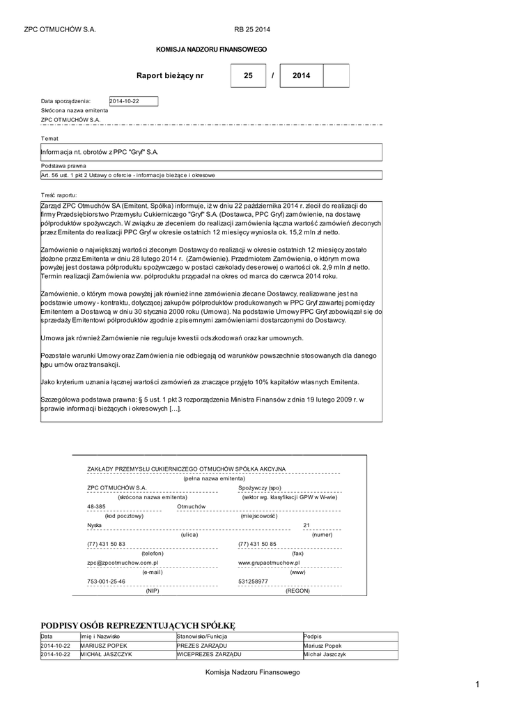 ZPC OTMUCHÓW S.A. RB 25 2014 KOMISJA NADZORU FINANSOWEGO Raport bieżący nr 25 / 2014 2014-10-22 Data sporządzenia: Skróc ona nazwa emitenta ZPC OTMUCHÓW S.A. Temat Informacja nt. obrotów z PPC "Gryf" S.A. Podstawa prawna Art. 56 ust. 1 pkt 2 Ustawy o oferc ie - informac je bieżąc e i okresowe Treść raportu: Zarząd ZPC Otmuchów SA (Emitent, Spółka) informuje, iż w dniu 22 października 2014 r. zlecił do realizacji do firmy Przedsiębiorstwo Przemysłu Cukierniczego "Gryf" S.A. (Dostawca, PPC Gryf) zamówienie, na dostawę półproduktów spożywczych. W związku ze zleceniem do realizacji zamówienia łączna wartość zamówień zleconych przez Emitenta do realizacji PPC Gryf w okresie ostatnich 12 miesięcy wyniosła ok. 15,2 mln zł netto. Zamówienie o największej wartości zleconym Dostawcy do realizacji w okresie ostatnich 12 miesięcy zostało złożone przez Emitenta w dniu 28 lutego 2014 r. (Zamówienie). Przedmiotem Zamówienia, o którym mowa powyżej jest dostawa półproduktu spożywczego w postaci czekolady deserowej o wartości ok. 2,9 mln zł netto. Termin realizacji Zamówienia ww. półproduktu przypadał na okres od marca do czerwca 2014 roku. Zamówienie, o którym mowa powyżej jak również inne zamówienia zlecane Dostawcy, realizowane jest na podstawie umowy - kontraktu, dotyczącej zakupów półproduktów produkowanych w PPC Gryf zawartej pomiędzy Emitentem a Dostawcą w dniu 30 stycznia 2000 roku (Umowa). Na podstawie Umowy PPC Gryf zobowiązał się do sprzedaży Emitentowi półproduktów zgodnie z pisemnymi zamówieniami dostarczonymi do Dostawcy. Umowa jak również Zamówienie nie reguluje kwestii odszkodowań oraz kar umownych. Pozostałe warunki Umowy oraz Zamówienia nie odbiegają od warunków powszechnie stosowanych dla danego typu umów oraz transakcji. Jako kryterium uznania łącznej wartości zamówień za znaczące przyjęto 10% kapitałów własnych Emitenta. Szczegółowa podstawa prawna: § 5 ust. 1 pkt 3 rozporządzenia Ministra Finansów z dnia 19 lutego 2009 r. w sprawie informacji bieżących i okresowych [J]. ZAKŁADY PRZEMYSŁU CUKIERNICZEGO OTMUCHÓW SPÓŁKA AKCYJNA (pełna nazwa emitenta) ZPC OTMUCHÓW S.A. Spożywc zy (spo) (skróc ona nazwa emitenta) 48-385 (sektor wg. klasyfikac ji GPW w W-wie) Otmuc hów (kod poc ztowy) (miejscowość) Nyska 21 (ulica) (numer) (77) 431 50 83 (77) 431 50 85 (telefon) (fax) zpc@zpcotmuc how.c om.pl www.grupaotmuc how.pl (e-mail) (www) 753-001-25-46 531258977 (NIP) (REGON) PODPISY OSÓB REPREZENTUJĄCYCH SPÓŁKĘ Data Imię i Nazwisko Stanowisko/Funkc ja Podpis 2014-10-22 MARIUSZ POPEK PREZES ZARZĄDU Mariusz Popek 2014-10-22 MICHAŁ JASZCZYK WICEPREZES ZARZĄDU Mic hał Jaszc zyk Komisja Nadzoru Finansowego 1 ZPC OTMUCHÓW S.A. RB 25 2014 Komisja Nadzoru Finansowego 2