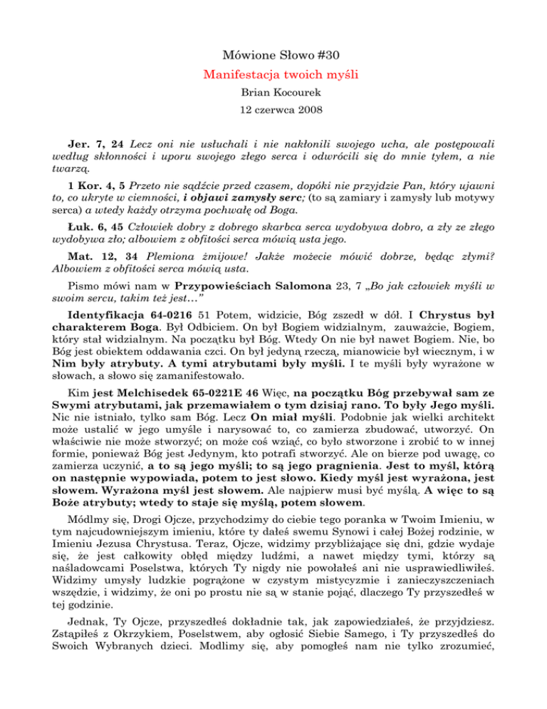 Mówione Słowo #30 Manifestacja twoich myśli Brian Kocourek 12 czerwca 2008 Jer. 7, 24 Lecz oni nie usłuchali i nie nakłonili swojego ucha, ale postępowali według skłonności i uporu swojego złego serca i odwrócili się do mnie tyłem, a nie twarzą. 1 Kor. 4, 5 Przeto nie sądźcie przed czasem, dopóki nie przyjdzie Pan, który ujawni to, co ukryte w ciemności, i objawi zamysły serc; (to są zamiary i zamysły lub motywy serca) a wtedy każdy otrzyma pochwałę od Boga. Łuk. 6, 45 Człowiek dobry z dobrego skarbca serca wydobywa dobro, a zły ze złego wydobywa zło; albowiem z obfitości serca mówią usta jego. Mat. 12, 34 Plemiona żmijowe! Jakże możecie mówić dobrze, będąc złymi? Albowiem z obfitości serca mówią usta. Pismo mówi nam w Przypowieściach Salomona 23, 7 „Bo jak człowiek myśli w swoim sercu, takim też jest…” Identyfikacja 64-0216 51 Potem, widzicie, Bóg zszedł w dół. I Chrystus był charakterem Boga. Był Odbiciem. On był Bogiem widzialnym, zauważcie, Bogiem, który stał widzialnym. Na początku był Bóg. Wtedy On nie był nawet Bogiem. Nie, bo Bóg jest obiektem oddawania czci. On był jedyną rzeczą, mianowicie był wiecznym, i w Nim były atrybuty. A tymi atrybutami były myśli. I te myśli były wyrażone w słowach, a słowo się zamanifestowało. Kim jest Melchisedek 65-0221E 46 Więc, na początku Bóg przebywał sam ze Swymi atrybutami, jak przemawiałem o tym dzisiaj rano. To były Jego myśli. Nic nie istniało, tylko sam Bóg. Lecz On miał myśli. Podobnie jak wielki architekt może ustalić w jego umyśle i narysować to, co zamierza zbudować, utworzyć. On właściwie nie może stworzyć; on może coś wziąć, co było stworzone i zrobić to w innej formie, ponieważ Bóg jest Jedynym, kto potrafi stworzyć. Ale on bierze pod uwagę, co zamierza uczynić, a to są jego myśli; to są jego pragnienia. Jest to myśl, którą on następnie wypowiada, potem to jest słowo. Kiedy myśl jest wyrażona, jest słowem. Wyrażona myśl jest słowem. Ale najpierw musi być myślą. A więc to są Boże atrybuty; wtedy to staje się myślą, potem słowem. Módlmy się, Drogi Ojcze, przychodzimy do ciebie tego poranka w Twoim Imieniu, w tym najcudowniejszym imieniu, które ty dałeś swemu Synowi i całej Bożej rodzinie, w Imieniu Jezusa Chrystusa. Teraz, Ojcze, widzimy przybliżające się dni, gdzie wydaje się, że jest całkowity obłęd między ludźmi, a nawet między tymi, którzy są naśladowcami Poselstwa, których Ty nigdy nie powołałeś ani nie usprawiedliwiłeś. Widzimy umysły ludzkie pogrążone w czystym mistycyzmie i zanieczyszczeniach wszędzie, i widzimy, że oni po prostu nie są w stanie pojąć, dlaczego Ty przyszedłeś w tej godzinie. Jednak, Ty Ojcze, przyszedłeś dokładnie tak, jak zapowiedziałeś, że przyjdziesz. Zstąpiłeś z Okrzykiem, Poselstwem, aby ogłosić Siebie Samego, i Ty przyszedłeś do Swoich Wybranych dzieci. Modlimy się, aby pomogłeś nam nie tylko zrozumieć, dlaczego Ty jesteś tutaj, lecz pomóż nam zrozumieć Ciebie i Twoje drogi, Ojcze. My jesteśmy Twoim Nasieniem, Twoimi Dziećmi, które Ty wybrałeś w Tobie jeszcze przed powstaniem pyłku prochu kosmicznego przez Twoje Potężne Słowo. Tak, Ojcze, wierzymy też Twemu Słowu, które oświadcza, że jesteśmy częścią Ciebie, i jako część Ciebie mamy również Twój umysł, bo Ty powiedziałeś „Niechaj ten Zmysł, który był w Chrystusie, będzie w Was”, a my otrzymaliśmy Twoje Wspaniałe Doxa w tej godzinie, Twoją Wspaniałą Chwałę, która jest Twą absolutną opinią, wartościami, i wyrokami, a my mówimy Amen i Amen na nie, o miłujący Ojcze. Pomóż nam, Ojcze, teraz, kiedy kontynuujemy studium Twojego Słowa i tego Wspaniałego Kazania Brata Branhama nazwanego „Mówione Słowo jest Oryginalnym Nasieniem”. Dlatego prosimy o to w imieniu Jezusa Chrystusa. Amen! Możecie usiąść… Zatem, dzisiaj do południa będziemy kontynuować nasze studium kazania brata Branhama „Mówione Słowo jest Oryginalnym Nasieniem, i będziemy znowu czytać od akapitu 23, gdzie brat Branham powiedział: Boże Słowo nieustannie idzie naprzód. Powiedziałem, że gdybyśmy wzięli urządzenie, które mogłoby to wyłapać, że ludzki głos, mój głos, którym mówię dzisiaj, za dziesięć tysięcy lat od dziś mógłby być jeszcze zarejestrowany w powietrzu. Jest to jak rzucanie kamyka w środek stawu. Malusieńkie, niewielkie fale zanikają stopniowo, że nawet nie można je dostrzec okiem, lecz one idą dalej, aż dotrą do brzegu. Tak samo te fale dźwiękowe w powietrzu nieustannie poruszają się wokół i wokół świata; zatem nasz głos – to co wypowiadamy, będzie naszym wyrokiem. Nasze świadectwo stanie przeciwko nam. Nasze własne głosy będą echem w naszych uszach przy Bożym trybunale sądowym, kiedy Jego wielkie urządzenie złapie każdy wypowiedziany głos – każde wymamrotane słowo. 24 A więc, istnieje jedyny sposób, jak zatrzymać zły głos – przez pokutę. Jedynie Sam Bóg może go zatrzymać. Jeżeli nie, to idzie ciągle dalej i spotka się z tobą we wieczności. Dlatego Bóg, będąc doskonałym i Jego Głos wiecznym, Jego własny Głos będzie musiał go przerwać. W związku z tym On musi być doskonały w podejmowaniu każdej decyzji. Albowiem, kiedy On raz coś powie, to musi przebyć całą drogę i wrócić z powrotem na sąd. Otóż, jak wiecie, patrzeliśmy na słowa, które wypowiadamy i jeszcze zanim je powiemy, one już przybrały postać własnego życia w naszych myślach lub raczej naszych sercach. A cokolwiek było wszczepione jako nasienie w nasze umysły i serca, było już w tym życie, lecz to wymaga światła i wody, aby zamanifestować wszystkie nasienia. To jest prawo reprodukcji. 1. Mojżeszowa 1, 11 „każde nasienie zrodzi według swego rodzaju”. Właśnie ustaliliśmy dla was, że słowa są nasionami. Boże Słowo jest Nasieniem i rodzi p