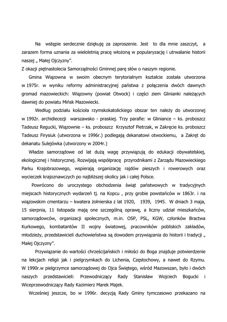 Na wstępie serdecznie dziękuję za zaproszenie. Jest to dla mnie zaszczyt, a zarazem forma uznania za wieloletnią pracę włożoną w popularyzację i utrwalanie historii naszej „ Małej Ojczyzny”. Z okazji piętnastolecia Samorządności Gminnej parę słów o naszym regionie. Gmina Wiązowna w swoim obecnym terytorialnym kształcie została utworzona w 1975r. w wyniku reformy administracyjnej państwa z połączenia dwóch dawnych gromad mazowieckich: Wiązowny (powiat Otwock) i części ziem Glinianki należących dawniej do powiatu Mińsk Mazowiecki. Według podziału kościoła rzymskokatolickiego obszar ten należy do utworzonej w 1992r. archidiecezji warszawsko - praskiej. Trzy parafie: w Gliniance – ks. proboszcz Tadeusz Regucki, Wiązownie – ks. proboszcz Krzysztof Pietrzak, w Zakręcie ks. proboszcz Tadeusz Firysiuk (utworzona w 1996r.) podlegają dekanatowi otwockiemu, a Zakręt do dekanatu Sulejówka (utworzony w 2004r.) Władze samorządowe od lat dużą wagę przywiązują do edukacji obywatelskiej, ekologicznej i historycznej. Rozwijają współpracę przyrodnikami z Zarządu Mazowieckiego Parku Krajobrazowego, wspierają organizację rajdów pieszych i rowerowych oraz wycieczek krajoznawczych po najbliższej okolicy jak i całej Polsce. Powrócono do uroczystego obchodzenia świąt państwowych w tradycyjnych miejscach historycznych wydarzeń tj. na Kopcu , przy grobie powstańców w 1863r. i na wiązowskim cmentarzu – kwatera żołnierska z lat 1920, 1939, 1945. W dniach 3 maja, 15 sierpnia, 11 listopada mają one szczególną oprawę, a liczny udział mieszkańców, samorządowców, organizacji społecznych, m.in. OSP, PSL, KGW, członków Bractwa Kurkowego, kombatantów II wojny światowej, pracowników pobliskich zakładów, młodzieży, przedstawicieli duchowieństwa są dowodem przywiązania do historii i tradycji „ Małej Ojczyzny”. Przywiązanie do wartości chrześcijańskich i miłości do Boga znajduje potwierdzenie na lekcjach religii jak i pielgrzymkach do Lichenia, Częstochowy, a nawet do Rzymu. W 1990r.w pielgrzymce samorządowej do Ojca Świętego, wśród Mazowszan, było i dwóch naszych przedstawicieli: Przewodniczący Rady Stanisław Wojciech Bogucki i Wiceprzewodniczący Rady Kazimierz Marek Majek. Wcześniej jeszcze, bo w 1996r. decyzją Rady Gminy tymczasowo przekazano na potrzeby duszpasterskie jeden z pawilonów użytkowanych przez szkołę w Zakręcie. Wkrótce też stał się on ośrodkiem nowej parafii. Harmonijna współpraca z Kościołem zaowocowała cyklem uroczystości mających na celu przypomnienie, spopularyzowanie i upamiętnienie czterowiekowej historii parafii pod wezwaniem św. Wojciecha w Wiązownie oraz w 400 -lecie erygowania tu parafii i 200-lecie wzniesienia obecnej świątyni. W tym dniu teren wokół kościoła i Dom Katolicki wypełniły się pocztami sztandarowymi, zaproszonymi gośćmi oraz parafianami. Wszyscy brali udział w uroczystej mszy świętej koncelebrowanej przez ks. bp. Kazimierza Romaniuka – ordynariusza diecezji warszawskopraskiej, akademii historycznej, koncercie i przy odsłonięciu okolicznościowej tablicy. Tablicę tę ufundowano ze składek parafian, a nadwyżkę przekazano ofiarom powodzi z Dolnego Śląska. W październiku 1990r. W Wiązownie odbyła się sesja naukowa poświęcona działalności nestorki pielęgniarstwa polskiego bł. Hannie Chrzanowskiej – wiązowskiej dziedziczce. Udział w sesji wzięło ponad 200 osób z całej Polski, wyższe duchowieństwo katolickie z Krakowa, Łodzi, Warszawy, Poznania; przedstawiciele Duszpasterstwa Służby Zdrowia, delegacje szkół medyczno – pielęgniarskich, członkowie rodu Szlenkierów i Chrzanowskich z Anglii, USA, Warszawy, Krakowa, Radachówki. Sesja naukowa zakończyła się uroczystą mszą świętą w miejscowym kościele, podczas której m. in. odczytano okolicznościowy list otrzymany od prymasa Polski, w 2004r. nakręcono i ostoją film pt.”Świadectwo”. Przypomnieć należy, że parafia wiązowska była jest tradycji niepodleglościowych. Świadczą o tym zadbane mogiły żołnierskie i pamięć o stoczonych tu bitwach w latach 1809, 1831, 1863,1920,1939 – 1945. W Gminie Wiązowna natkniemy się na liczne miejsca pamięci utrwalone przez lokalną społeczność. Na przestrzeni ostatniej dekady korzystając ze swobód demokratycznych miejsca tragicznych wydarzeń, w szczególności z lat ostatniej wojny, a dotyczące Armii Krajowej uhonorowano kamiennymi tablicami memoratywnymi: w kościele w Wiązownie w 1984r., na historycznym kopcu w 1989r. w Wiązownie Gminnej, na kapliczce w Pęclinie w 1996r., w szkole w Malcanowie w 1995r., na cmentarzu przykościelnym w Gliniance, przy dworku w Olszynach – Majdanie w 1994r., a nawet w Emowie Lesie wystawiono pomnik lotnikom RAF–u, którzy zginęli w 1944r. niosąc pomoc walczącej Warszawie-w Malcanowie w 2003r. „Cichociemnych na Pierzynie”. Trafną ze wszech miar okazała się inwentaryzacja i dokumentacja fotograficzna miejsc pamięci, wykonana przez por. Czesława Konowrockiego, mgr. Krzysztofa Oktabińskiego przy współpracy Przewodniczącej GKPWiM Sekretarz Gminy Anny Markielis, wydana w formie folderu, a później opublikowana przez SZŻAK w broszurze”Obroży” IV Rejon Fromczyn Oddział Otwock w 2000r. W latach 1989 – 2000 rozwinięto różne formy współpracy ze środowiskami kombatanckimi zwłaszcza z ŚZŻAK działającym na tym terenie. Wszystkie tu wspomniane działania społeczno-kulturalne zawdzięczamy poprawnej współpracy samorządu gminnego z członkami różnego typu organizacji politycznych, stowarzyszeń i zrzeszeń: PSL, OSP, Forum Przedsiębiorczości, oraz rad sołeckich i osiedlowych, Koła Gospodyń Wiejskich w Gliniance i Wiązownie, nauczycieli oraz członków Bractwa Strzelców Kurkowych „Lechici” powiat Otwock „Klubu Miłośników Historii”. Lata 1990-2005 były w historii Polski i naszej Gminy okresem wielu zmian i re