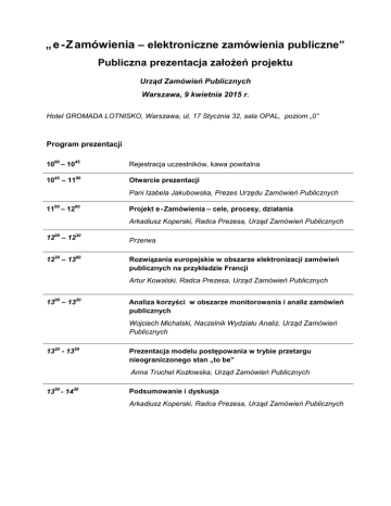 „ e - Z amówienia – elektroniczne zamówienia publiczne” Publiczna prezentacja założeń projektu Urząd Zamówień Publicznych Warszawa, 9 kwietnia 2015 r. Hotel GROMADA LOTNISKO, Warszawa, ul. 17 Stycznia 32, sala OPAL, poziom „0” Program prezentacji 1000 – 1045 Rejestracja uczestników, kawa powitalna 1045 – 1100 Otwarcie prezentacji Pani Izabela Jakubowska, Prezes Urzędu Zamówień Publicznych 1100 – 1200 Projekt e - Zamówienia – cele, procesy, działania Arkadiusz Koperski, Radca Prezesa, Urząd Zamówień Publicznych 1200 – 1230 1230 – 1300 Przerwa Rozwiązania europejskie w obszarze elektronizacji zamówień publicznych na przykładzie Francji Artur Kowalski, Radca Prezesa, Urząd Zamówień Publicznych 1300 – 1320 Analiza korzyści w obszarze monitorowania i analiz zamówień publicznych Wojciech Michalski, Naczelnik Wydziału Analiz, Urząd Zamówień Publicznych 1320 - 1350 Prezentacja modelu postępowania w trybie przetargu nieograniczonego stan „to be” Anna Truchel Kozłowska, Urząd Zamówień Publicznych 1350 - 1430 Podsumowanie i dyskusja Arkadiusz Koperski, Radca Prezesa, Urząd Zamówień Publicznych