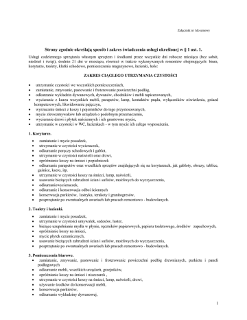 Załącznik nr 1do umowy Strony zgodnie określają sposób i zakres świadczenia usługi określonej w § 1 ust. 1. Usługi codziennego sprzątania własnym sprzętem i środkami przez wszystkie dni robocze miesiąca (bez sobót, niedziel i świąt), średnio 21 dni w miesiącu, również w trakcie wykonywanych remontów obejmujących: biura, korytarze, toalety, klatki schodowe, pomieszczenia magazynowe, łazienki, hole: ZAKRES CIĄGŁEGO UTRZYMANIA CZYSTOŚCI utrzymanie czystości we wszystkich pomieszczeniach, zamiatanie, zmywanie, pastowanie i froterowanie powierzchni podłóg, odkurzanie wykładzin dywanowych, dywanów, chodników i mebli tapicerowanych, wycieranie z kurzu wszystkich mebli, parapetów, lamp, kontaktów prądu, wyłączników oświetlenia, gniazd komputerowych, likwidowanie pajęczyn, wyrzucanie śmieci z koszy i pojemników do tego przystosowanych, mycie zlewozmywaków lub urządzeń o podobnym przeznaczeniu, wycieranie drzwi i płytek naściennych i ich gruntowne mycie, utrzymanie w czystości w WC, łazienkach - w tym mycie ich całego wyposażenia. 1. Korytarze. zamiatanie i mycie posadzek, utrzymanie w czystości wycieraczek, odkurzanie poręczy schodowych i gablot, utrzymanie w czystości naświetli oraz drzwi, opróżnianie koszy na śmieci i popielniczek odkurzanie parapetów oraz wszelkich sprzętów znajdujących się na korytarzach, jak gabloty, obrazy, tablice, gaśnice, ksero, itp. utrzymanie w czystości koszy na śmieci, lamp, naświetli, usuwanie bieżących zabrudzeń ścian i sufitów, możliwych do wyczyszczenia, odkurzaniewycieraczek, odkurzanie i konserwacja odboi ściennych konserwacja parkietów, lastryka, terakoty i granitogresów, posprzątanie po ewentualnych awariach lub pracach remontowo - budowlanych. 2. Toalety i łazienki. zamiatanie i mycie posadzek, utrzymanie w czystości umywalek, sedesów, luster, bieżące uzupełnianie mydła w płynie, ręczników papierowych, papieru toaletowego, środków zapachowych, opróżnianie koszy na śmieci, mycie płytek ceramicznych, usuwanie bieżących zabrudzeń ścian i sufitów, możliwych do wyczyszczenia, posprzątanie po ewentualnych awariach lub pracach remontowo - budowlanych. 3. Pomieszczenia biurowe. zamiatanie, zmywanie, pastowanie i froterowanie powierzchni podłóg drewnianych, parkietu i paneli podłogowych odkurzanie mebli, wszelkich urządzeń, grzejników, opróżnianie koszy na śmieci i niszczarek , utrzymanie w czystości koszy na śmieci, lamp, naświetli, drzwi, używanie środków do konserwacji mebli, konserwacja parkietów, odkurzanie wykładziny dywanowej, 1 odkurzanie mebli tapicerowanych, mycie parapetów, gablot i szaf przeszklonych, mycie i dezynfekcja aparatów telefonicznych, usuwanie bieżących zabrudzeń ścian i sufitów, możliwych do wyczyszczenia, posprzątanie po ewentualnych awariach lub pracach remontowo - budowlanych. 4. Ponadto wymaga się: Bieżące wykładanie i uzupełnianie własnymi środkami higienicznymi wkładów do urządzeń (mydła w płynie, ręczników papierowych, papieru toaletowego, środków zapachowych). Harmonogram podstawowych czynności Wykonawcy Lp. Częstotliwość OPIS PODSTAWOWYCH CZYNNOŚCI WYKONAWCY W TYGODNIU W MIESIĄCU W ROKU 1 Wycieranie mebli i lamp biurowych 5 x x 2 Opróżnianie pojemników na śmieci i wymiana worków plastikowych, wynoszenie śmieci we wskazane miejsce 5 x x 3 Odkurzanie / zamiatanie powierzchni podłóg w tym pokrytych wykładziną dywanową. 5 x x 4 Wycieranie poręczy i „odboi” drewnianych na ścianach 1 x x 5 Mycie posadzek kamiennych 5 x x 6 Mycie, czyszczenie i dezynfekcja wszystkich urządzeń sanitarnych 5 x x 7 Mycie terakoty 5 x x 8 Mycie schodów 5 x x 9 Wymiana papieru toaletowego, ręczników papierowych, napełnianie pojemników mydłem, wymiana środków zapachowych /materiały wykonawcy/ 5 x x 10 Neutralizacja zapachów w pomieszczeniach sanitarnych 5 x x 11 Przetarcie drzwi i framug 1 (wtorek) x x 2 12 Mycie glazury 1 (poniedziałek) x x 13 Mycie luster 1 (poniedziałek) x x 14 Mycie parapetów okiennych 1 (środa) x x 15 Czyszczenie części metalowych przy poręczach X 1 (od 5 do 8 każdego mca) x 16 Czyszczenie mebli płynem do konserwacji mebli X 1 (od 5 do 8 każdego mca) x 17 Pokrywanie powłoką do konserwacji posadzek kamiennych X 1 (od 5 do 8 każdego mca) x 18 Czyszczenie aparatów telefonicznych X 1 (od 5 do 8 każdego mca) x X x X x X x 19 20 21 Sprzątanie piwnic i archiwum Wycieranie plafonier i wiszących lamp biurowych w pokojach i na korytarzach Mycie okien i drzwi 22 Mycie powierzchni szklanych wraz z ramami (np. drzwi) X x 23 Mycie lamperii na klatkach schodowych X x 24 Mycie opraw wentylacyjnych (kratek) X X 25 Mycie powierzchni grzejników X X 26 Czyszczenie żaluzji poziomych X X 4 (od 15 do 20 III, VI, IX i XII) 4 do 20 2 (od 15 III, VI, IX i XII) do 25 (od 15 IV i X ) do 25 (od 15 IV i X ) do 25 (od 15 IV i X ) do 25 (od 15 IV i X ) do 25 (od 15 IV i X ) do 25 (od 15 IV i X ) 2 2 2 2 2 3 27 28 29 30 Pranie wykładziny Pranie - czyszczenie krzeseł i foteli tapicerowanych Czyszczenie żaluzji pionowych Sprzątanie po robotach remontowych X X X X 1 (15-20 VII) 1 (15-20 VII) dodatkowe zlecenia wg potrzeb dodatkowe zlecenia wg potrzeb Nadto Wykonawca zobowiązuje się stosować wysokiej jakości środki czystości, konserwacji i środki dezynfekujące dopuszczone do powszechnego użytku zgodnie z obowiązującymi przepisami, opatrzone świadectwem Polskiego Zakładu Higieny o nieniszczącym działaniu na czyszczone elementy pomieszczeń i ich wystrój. Wykonawca musi zapewnić przynajmniej po 1 pracowniku do sprzątania podczas obecności pracowników od godz. 14.00 w pomieszczeniach objętych szczególną ochroną np. w kancelariach tajnych, archiwach i serwerowniach . Zamawiający wymaga, aby skład personelu zatrudnionego przez wykonawcę był stały i niezmienny podczas trwania umowy. Ewentualne zmiany składu mogą następować wyłącznie w uzasadnionych pr