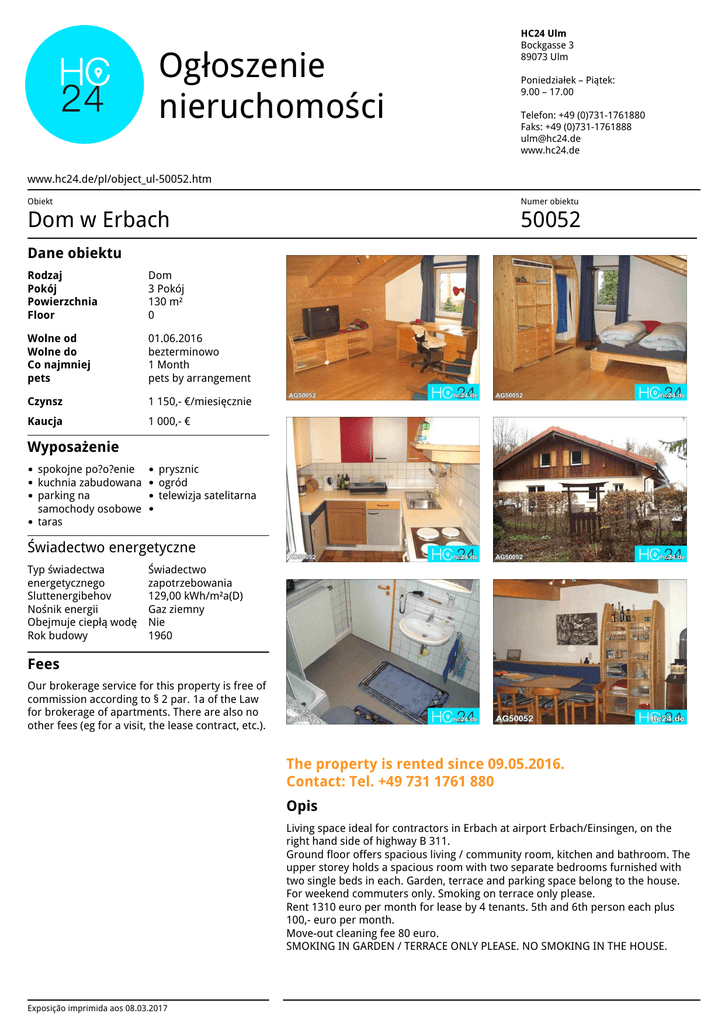 Ogłoszenie nieruchomości HC24 Ulm Bockgasse 3 89073 Ulm Poniedziałek – Piątek: 9.00 – 17.00 Telefon: +49 (0)731-1761880 Faks: +49 (0)731-1761888 [email protected] www.hc24.de www.hc24.de/pl/object_ul-50052.htm Obiekt Numer obiektu Dom w Erbach 50052 Dane obiektu Rodzaj Pokój Powierzchnia Floor Dom 3 Pokój 130 m² 0 Wolne od Wolne do Co najmniej pets 01.06.2016 bezterminowo 1 Month pets by arrangement Czynsz 1 150,- €/miesięcznie Kaucja 1 000,- € Wyposażenie spokojne po?o?enie kuchnia zabudowana parking na samochody osobowe taras prysznic ogród telewizja satelitarna Świadectwo energetyczne Typ świadectwa energetycznego Sluttenergibehov Nośnik energii Obejmuje ciepłą wodę Rok budowy Świadectwo zapotrzebowania 129,00 kWh/m²a(D) Gaz ziemny Nie 1960 Fees Our brokerage service for this property is free of commission according to § 2 par. 1a of the Law for brokerage of apartments. There are also no other fees (eg for a visit, the lease contract, etc.). The property is rented since 09.05.2016. Contact: Tel. +49 731 1761 880 Opis Living space ideal for contractors in Erbach at airport Erbach/Einsingen, on the right hand side of highway B 311. Ground floor offers spacious living / community room, kitchen and bathroom. The upper storey holds a spacious room with two separate bedrooms furnished with two single beds in each. Garden, terrace and parking space belong to the house. For weekend commuters only. Smoking on terrace only please. Rent 1310 euro per month for lease by 4 tenants. 5th and 6th person each plus 100,- euro per month. Move-out cleaning fee 80 euro. SMOKING IN GARDEN / TERRACE ONLY PLEASE. NO SMOKING IN THE HOUSE. Exposição imprimida aos 08.03.2017 Powered by TCPDF (www.tcpdf.org)