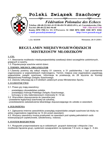 Polski Związek Szachowy Fédération Polonaise des Echecs Telefon: (00-48-22) 841-41-92 00-454 WARSZAWA, ul. Czerniakowska 126a Fax/tel: (00-48-22) 841-94-60 NIP : 526-16-67-148 Konto: BPH PBK SA XX O/Warszawa 34 1060 0076 0000 3200 0071 8184 e-mail: [email protected] http://www.pzszach.org.pl ***************************************************************** REGULAMIN MIĘDZYWOJEWÓDZKICH MISTRZOSTW MŁODZIKÓW 1. CEL 1.1. Stworzenie moŜliwości miedzywojewódzkiej rywalizacji dzieci szczególnie uzdolnionych, grających w szachy. 1.3. Popularyzacja szachów wśród dzieci. 2. TERMIN, MIEJSCE, ORGANIZATOR 2.1.Zawody powinny się odbyć między 01 czerwca, a 31 października, i być przemiennie organizowane w województwach makroregionu. Termin, miejsce oraz organizatora uzgadniają wojewódzkie związki szachowe. Informacje te przekazują do 28 stycznia do Komisji MłodzieŜowej Polskiego Związku Szachowego. 2.2. Zawody odbywają się w 8 strefach ustalonych przez Ministerstwo Sportu. 3. UCZESTNICTWO 3.1. Prawo gry mają zawodnicy: - posiadający obywatelstwo polskie, - posiadający licencję Polskiego Związku Szachowego, - kończący w roku kalendarzowym mistrzostw 9 i 10 lat. 3.2. Warunkiem dopuszczenia do zawodów jest: - posiadanie legitymacji szachowej lub szkolnej, - przedstawienie zaświadczenia lekarskiego dopuszczającego do udziału w zawodach. 4. ZGŁOSZENIA 4.1. Zgłoszenia imienne zawodników przesyłają wojewódzkie związki szachowe lub kluby na adres organizatora najpóźniej na 14 dni przed zawodami. 4.2. Wszyscy zawodnicy muszą przebywać na zawodach pod opieką pełnoletnich osób towarzyszących (opiekunowie, szkoleniowcy, rodzice). 5. SYSTEM ROZGRYWEK 5.1. Rozgrywki przeprowadzane są w oddzielnych grupach dziewcząt i chłopców ( bez moŜliwości łączenia grup), systemem szwajcarskim na dystansie 7-9 rund, w ciągu 3 - 5 dni. 5.2. W przypadku udziału w grupie do 10 uczestników turniej rozgrywany jest systemem rundowym (kaŜdy z kaŜdym), odpowiednio do ilości zawodników. 6. TEMPO GRY 6.1. Minimalne tempo gry to 1 godzina na zawodnika na partię. 7. OCENA WYNIKÓW 7.1. O kolejności miejsc w turnieju decyduje ilość punktów zdobytych przez zawodnika. 7.2. W przypadku równej liczby punktów zdobytych przez dwóch lub więcej zawodników decydują kolejno następujące kryteria oceny: - w turnieju szwajcarskim: Buchholz średni, Buchholz pełny, ilość zwycięstw, progress, wynik bezpośredniego spotkania, wynik rankingowy, - w turnieju kołowym: metoda Sonneborna-Bergera, liczba zwycięstw, wynik bezpośredniego spotkania. 7.3. W przypadku wyczerpania powyŜszych kryteriów, w celu ustalenia mistrza makroregionu sędzia zarządza dogrywkę. 8. FINANSOWANIE 8.1.Koszty organizacyjne rozgrywek pokrywa wojewódzkie interdyscyplinarne stowarzyszenie sportowe województwa organizatora. 8.2. Koszty udziału w zawodach pokrywają wojewódzkie związki szachowe, kluby delegujące zawodników, względnie ich rodzice lub sponsorzy. 9. NAGRODY I WYRÓśNIENIA 9.1. Medale, dyplomy i puchary dla zwycięzców funduje wojewódzkie interdyscyplinarne stowarzyszenie sportowe województwa organizatora. 9.2. Nagrody i upominki i dla zwycięzców zawodów funduje organizator zawodów w miarę posiadanych moŜliwości. 9.3. Zgodnie z regulaminem współzawodnictwa sportowego młodzieŜy szczególnie uzdolnionej prowadzona jest klasyfikacja centralna dla województw i klubów. Dla dyscypliny SZACHY w mistrzostwach międzywojewódzkich młodzików ustalono na rok 2008 następujące siatki punktowe: MŁODZICY: K/M - 9 i 10 lat Lok. 1 2-3 4-12 Suma Pkt. 3 2 1 16 10. SĘDZIOWANIE 10.1. W mistrzostwach obowiązują aktualne przepisy Kodeksu Szachowego, które powinien mieć do wglądu sędzia główny zawodów. 10.2. Zawody prowadzi sędzia główny posiadający co najmniej centralną klasę sędziowską, przy pomocy sędziów asystentów. Wszyscy sędziowie muszą posiadać aktualne licencje sędziowskie. 10.3. Do interpretacji przepisów gry uprawniony jest wyłącznie sędzia główny mistrzostw, którego decyzje w czasie zawodów są ostateczne. 10.4. Od decyzji sędziego głównego zawodów przysługuje zawodnikowi prawo odwołania w ciągu 3 dni do Kolegium Sędziów PZSzach. 10.5. Sędzia główny zawodów ma obowiązek złoŜyć w ciągu 10 dni od zakończenia zawodów sprawozdania do: a) Wiceprezesa ds. MłodzieŜy i Szkolenia PZSzach, b) Przewodniczącego Komisji MłodzieŜowej PZSzach, c) zarządów obu wojewódzkich związków szachowych, d) Przewodniczącego Komisji Ewidencji, Klasyfikacji i Rankingu PZSzach. Adresy – p. załącznik nr 1 10.6. Sprawozdanie winno zawierać pełne tabele turniejowe z ustalonymi miejscami w zawodach wszystkich zawodników, wnioski o nadanie zdobytych kategorii szachowych oraz wykaz punktów klasyfikacji centralnej zdobytych przez zawodników, kluby i województwa. 11. SPRAWY WYCHOWAWCZE 11.1. Opiekę wychowawczą podczas zawodów sprawują szkoleniowcy, opiekunowie z wojewódzkich związków szachowych, klubów oraz rodzice, we współpracy z organizatorem. 11.2. Zaleca się ograniczenie wychodzenia zawodników podczas gry z sali turniejowej oraz zakaz rozmów między zawodnikami w czasie gry. 11.3. W trakcie partii zawodnicy nie mogą kontaktować się z trenerami czy opiekunami. 11.4. Obowiązuje całkowity zakaz wnoszenia na salę gry telefonów komórkowych oraz innych urządzeń elektronicznych pod rygorem: -dla zawodników –przegrania partii -dla innych osób-zakazu wstępu na salę gry do końca turnieju 12. POSTANOWIENIA KOŃCOWE 12.1. Komplet ustaleń technicznych i organizacyjnych organizator ogłosi w Komunikacie Organizacyjnym zawodów, wydanym nie później jak na 30 dni przed terminem zawodów. 12.2. Za ubezpieczenie odpowiedzialny jest WZSzach. względnie klub delegujący zawodnika. 12.3. Niniejszy regulamin jest opublikowany na stronie internetowej PZSzach www.pzszach.org.pl Wiceprezes ds. MłodzieŜy i Szkolenia Pi