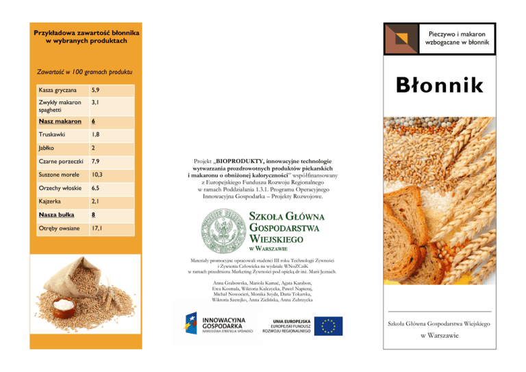 Przykładowa zawartość błonnika w wybranych produktach Pieczywo i makaron wzbogacane w błonnik Zawartość w 100 gramach produktu Kasza gryczana 5,9 Zwykły makaron spaghetti 3,1 Nasz makaron 6 Truskawki 1,8 Jabłko 2 Czarne porzeczki 7,9 Suszone morele 10,3 Orzechy włoskie 6,5 Kajzerka 2,1 Nasza bułka 8 Otręby owsiane 17,1 Błonnik Projekt „BIOPRODUKTY, innowacyjne technologie wytwarzania prozdrowotnych produktów piekarskich i makaronu o obniżonej kaloryczności” współfinansowany z Europejskiego Funduszu Rozwoju Regionalnego w ramach Poddziałania 1.3.1. Programu Operacyjnego Innowacyjna Gospodarka – Projekty Rozwojowe. Materiały promocyjne opracowali studenci III roku Technologii Żywności i Żywienia Człowieka na wydziale WNoŻCziK w ramach przedmiotu Marketing Żywności pod opieką dr inż. Marii Jeznach. Anna Grabowska, Mariola Kamać, Agata Karabon, Ewa Kosmala, Wiktoria Kulczycka, Paweł Napieraj, Michał Nowocień, Monika Szyda, Daria Tokarska, Wiktoria Szerejko, Anna Zielińska, Anna Zubrzycka Szkoła Główna Gospodarstwa Wiejskiego w Warszawie Co zawdzięczamy błonnikowi? Czym się różnią nasze makarony i bułki od innych? Do produkcji makaronu użyliśmy semoliny, oleju, soli, wody oraz błonnika owsianego. Dzięki temu udało nam się obniżyć kaloryczność produktu. Makaron ten wymaga również krótszego czasu gotowania , co pozwala zmniejszyć straty składników odżywczych. Nasze bułki Do głównych zalet błonnika owsianego (głównie dzięki obecności β-glukanów) zawartego w naszych produktach należy zaliczyć: zdolność obniżania poziomu cholesterolu możliwość wykorzystania w zapobieganiu otyłości i cukrzycy wspomaganie leczenia chorób układu pokarmowego (nieżyty śluzówki, żołądka czy biegunki) łagodzenie skutków choroby wrzodowej ograniczenie zachorowań na choroby nowotworowe m.in. okrężnicy, żołądka, przełyku, krtani wzrost odporności immunologicznej łagodzenie stanów zapalnych skóry zawierają co najmniej cztery razy większą zawartość błonnika niż zwykłe tj. 4,8 g w jednej bułce (60 g) - co stanowi aż 24% dziennego zapotrzebowania. Dwie nasze bułki to połowa zalecanej przez WHO dziennej porcji błonnika. Nasz makaron Porcja (120 g) dostarcza aż 7,2 g błonnika, co stanowi 28,8 % dziennego zapotrzebowania. Czy wiesz, że….? Światowa Organizacja Zdrowia (WHO) zaleca spożycie 20-40 g błonnika dziennie. W Polsce spożycie błonnika kształtuje się na poziomie 15g dziennie. Dla porównania - w społeczeństwach nieuprzemysłowionych, spożycie błonnika wynosi około 60 g dziennie. Efektem tego jest bardzo niska zachorowalność na choroby nowotworowe m.in. jelita grubego. Wydział Nauk o Żywieniu Człowieka i Konsumpcji
