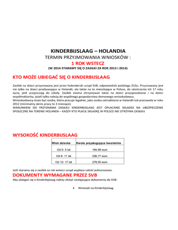KINDERBIJSLAAG – HOLANDIA TERMIN PRZYJMOWANIA WNIOSKÓW : 1 ROK WSTECZ (W 2014 STARAMY SIĘ O ZASIŁKI ZA ROK 2013 i 2014) KTO MOŻE UBIEGAD SIĘ O KINDERBIJSLAAG Zasiłek na dzieci przyznawany jest przez holenderski urząd SVB, odpowiednik polskiego ZUSu. Przyznawany jest nie tylko na dzieci przebywające w Holandii, ale także na te mieszkające w Polsce, do ukooczenia ich 17 roku życia, jeśli uczęszczają do szkoły. Zasiłek można otrzymywad także na dzieci przysposobione i na dzieci współmałżonka, jeżeli tylko należą do wspólnego gospodarstwa domowego wnioskodawcy. Wnioskodawcą może byd osoba, która pracuje legalnie, jako osoba zatrudniona w Holandii lub pracowała w roku 2012 (minimalny okres pracy to 3 miesiące). WARUNKIEM DO PRZYZNANIA ZASIŁKU KINDERBIJSLAAG JEST OPŁACANIE SKŁADEK NA UBEZPIECZENIE SPOŁECZNE NA TERENIE HOLANDII – KAŻDY KTO PŁACIŁ SKŁADKĘ W POLSCE NIE OTRZYMA ZASIŁKU WYSOKOŚD KINDERBIJSLAAG Kwota przysługująca kwartalnie Wiek dziecka Od 0- 5 lat 194,99 euro Od 6- 11 lat 236,77 euro Od 12- 17 lat 278,55 euro Jeśli staramy się o zasiłek za rok wstecz urząd wypłaca całośd jednorazowo. DOKUMENTY WYMAGANE PRZEZ SVB Aby ubiegad się o Kinderbijslaag należy złożyd następujące dokumenty do SVB: Wniosek na Kinderbijslaag. Kopia unijnego aktu urodzenia dziecka. Kopia unijnego aktu małżeostwa (jeśli posiadasz). Kopia meldunku dziecka i opiekuna (nie musi byd tłumaczony, zrobimy to za ciebie bez dodatkowych kosztów). Kopie przyznania bądź odmowy przyznania zasiłku na dziecko w Polsce. Jarograaf bądź salaris od holenderskiego pracodawcy. Kopia dowodów osobistych bądź paszportów wnioskodawcy i opiekuna. DOKUMENTY WYMAGANE PRZEZ ROPS (REGIONALNY OŚRODEK POLITYKI SPOŁECZNEJ) ROPS lub MOPS będą wymagad następujących dokumentów: Kopia dowodu opiekuna potwierdzona „za zgodnośd z oryginałem”. Dokumenty potwierdzające sytuację zawodową opiekuna w Polsce. Potwierdzenie wspólnego zameldowania opiekuna z dziedmi. Odpis aktu urodzenia dziecka (oryginał). Akt małżeostwa (oryginał) lub w przypadku innego stanu cywilnego dokument potwierdzający. Wiele z wymienionych powyżej dokumentów może załatwid w urzędach żona/partnerka, więc jeśli klient nadal przebywa w Holandii, to ubieganie się o zasiłek wciąż jest możliwe i wygodne. ROPS może prosid również o inne informacje i zaświadczenia - w zależności od indywidualnej sytuacji. JAKIE INFORMACJE POTRZEBNE SĄ DO UBIEGANIA SIĘ O KINDERBIJSLAAG? Aby ubiegad się o Kinderbijslaag, należy dokładnie odpowiedzied na wszystkie pytania zawarte na naszym formularzu zgłoszeniowym. DLACZEGO WYSYŁAMY DOKUMENTY OSOBNO DO SVB I DO ROPS? O zasiłek ubiegamy się zawsze w SVB. Tam składamy wniosek o zasiłek. Holenderski urząd, zanim wyda decyzję o zasiłku, prosi polski ROPS o potwierdzenie okoliczności życiowych osoby starającej się o zasiłek. ROPS gromadzi dokumenty, aby przesład je później do SVB i w ten sposób potwierdzid słusznośd prawa do zasiłku. JAK DŁUGO CZEKA SIĘ NA ZASIŁEK? Czas oczekiwania na zasiłek zależny jest od kilku czynników, m. in. od kompletności dokumentacji, sprawności komunikacji pomiędzy SVB i ROPSem oraz szybkości reakcji na prośby przesyłane przez te urzędy klientowi. Średnio proces trwa kilka miesięcy.