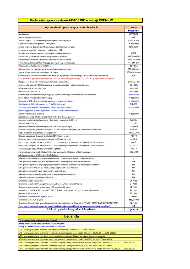 Karta katalogowa zestawu ACADEMIC w wersji PREMIUM WyposaŜenie i parametry aparatu Academic wersja Premium ZP3FDA2 typ zbiornika 30 L zbiornik - pojemność w litrach zbiornik: na gaz / z grzalką (elektryczną) / z płaszczem (olejowym) z płaszczem w zestawie ogrzewanie w zestawie: gazowe / elektryczne funkcje zbiornika: destylacyjny / fermentacyjno-destylacyjny (ferm-dest) ferm-dest - termometr w zbiorniku - analogowy / elektroniczny LCD zespół sterowania ogrzewaniem zbiornika (szczegoły w legendzie) ASR2 rozdielczość grzania i maksymalna mocy grzewcza w watach 30W / 3000W układ zasilania zbiornika z zaworami - średnica zaworów w calach 3/4 w zestawie otwór główny zbiornika 2" lub 4" (z redukcją kolumnową) w milimetrach 4" / 114 mm do 70 kg Masa zestawu dla zbiorników 15/30/50 L. kolumna frakcyjna - wymiary w milimetrach (wysokosć x średnica) 650 x 60 mm 1380/1420 mm Wysokość zestawu w mm (zaleŜnie od zbiornika) wypełnienie ze stali kwasoodpornej, ilość HETP dla wypełnienia standardowego z KO ( w zestawie) / z filtrem FK OPCJONALNE wypełnienie pryzmatyczne - ilość HETP dla opcji pakietowego ( P ) - ilość w kg - opcja dodatkowo płatna Wydajność w litrach na 1 h : minnimum / średnia / maksymalna 6,8 0,8 / 1,0 / 1,2 stęŜenie rektyfikatu C2H5OH (destylatu) w procentach standard / maksymalne chwilowe 90 / 95% reflux wewnętrzny: ultra mini / ultra ultra mini mQ steel chłodnica: mQ steel 1,25 m termometr elektroniczny kolumny frakcyjnej / automatyka sterujaca kolumną i układem chłodzenia automatyka zawór odpowietrzający kolumnę frakcyjną w zestawie filtr wstępny CRS mPro (węglowy) z wymiennym wkładem węglowym w zestawie filtr katalityczny FK20 lub wewnętrzny FKW20 (miedziany) manualna głowica odbioru wstępnego do odbioru 4 frakcji destylatu głowica myjąca do płukania wypełnienia kolumny i układu odbioru destylatu FKW20 w zestawie w zestawie manometr ciśnieniowy zbiornika rozbudowany uklad chłodzenia, destylacja tradycyjna, destylacja wody aksesoria montaŜowe i połączeniowe + Instrukcja + gwarancja do 36 m-cy* komplet połysk standard wykończenia rektyfikacja alkoholu, olejków eterycznych, substancji zapachowych destylacja tradycyjna, destylacja wody OPCJA - na zamowiene za dopłatą lub STANDARD - w zestawie standard OPCJA woda/230V Media niezbedne do destylacji : woda/gaz/230V Czas do rozpoczęcia destylacji (średni) dla 12/27 litrów - w min. - / 30-40 Czas destylacji od startu do zakończenia dla 12/27 litrów - w godz. - / 3,5-4 średni uzysk destylatu np. alkoholu 95% / L przy optymalnym napełnienieu zbiornika dla 12/27 litrów wsadu - / 4,3 średni uzysk destylatu np. alkoholu 40% / L przy optymalnym napełnienieu zbiornika dla 12/27 litrów wsadu - / 10,2 40 L / h Średnie zuŜycie wody chłodzącej w litrach na godzinę maksymalna przepływność układu chłodzenia z automatyką chłodzenia w litrach na godzinę 420 L / H - zalecane ogrzewanie: (P) Promiennik, (T) Taboret zabezpieczenie zbiornika przed wzrostem ciśnienia - podstawowe (zaleŜnie od pojemności - / -) - zabezpieczenie zbiornika przed wzrostem ciśnienia - automatyczny zawór bezpieczeństwa tak zabezpieczenie plaszcza olejowego przed wzrostem ciśnienia - automatyczny zawór bezpieczeństwa tak zabezpieczenie destylowanego wsadu przed przegrzaniem - automatyczne tak zabezpieczenie grzałek przed przegrzaniem - automatyczne tak zabezpieczenie medium olejowego przed przegrzaniem - automatyczne tak tak zabezpieczenie przed wybuchem zbiornika Gwarancja na całe urządzenie 36 mies Gwarancja na automatykę, zespoły sterujace, sterowniki, komputer destylacyjny 24 mies Gwarancja na termometry elektroniczne LCD, grzalki elektryczne, 12 mies Gwarancja WYMIEŃ STARY NA NOWY BEZ STRATY - jednorazowo w cięgu 24 mies. od daty zakupu 24 mies 60 mies Gwarancja na perforację Gwarancja kompatybilności, system VSOP, 120 mies. Gwarancja na medium olejowe doŜywotnia Gwarancja dla podmiotów gospodarczych itp. na cale urządzenie z wykluczeniem WYMIEŃ STARY NA NOWY BEZ STRATY Pełny zakres gwarancji moŜna sprawdzić i pobrać pod adresem http://www.vsop.com.pl/pliki/gwarancje.pdf Linki do galerii z fotografiami Academic 12 mies link galeria Legenda Tło w kolorze szarym - brak linku do fotografi Nazwy modeli urządzeń są linkowane do ich fotografii napisy w kolorze niebieskim są linkowane do fotografii AG1 - automatyka grzania zbiornika z przełącznikiem mocy 1500/3000 wat, 0 - 1500W - 3000W AR2 - automatyka grzania zbiornika z regulatorem płynnej regulacią mocy (rozdz. 30 wat), 0 - 30, 60, 90 ….. 2970, 3000W) AR3 - automatyka grzania zbiornika z płynną regulacją mocy (rozdz. 30W) + sterowanie układem chłodzenia AT1 - automatyka grzania zbiornika z płaszczem olejowym i przełącznikiem mocy 1500/3000 wat, 0 - 1500W - 3000W ATR2 - automatyka grzania zbiornika z płaszczem olejowym z regulatorem płynnej regulacji mocy (rozdz. 30 wat), 0 - 30, 60, 90 ….. 2970, 3000W) AS1 - automatyka grzania zbiornika z płaszczem olejowym i przełącznikiem mocy 1500/3000 wat, 0 - 1500W - 3000W ASR2 - automatyka grzania zbiornika z płaszczem olejowym z regulatorem płynnej regulacji mocy (rozdz. 30 wat), 0 - 30, 60, 90 ….. 2970, 3000W)