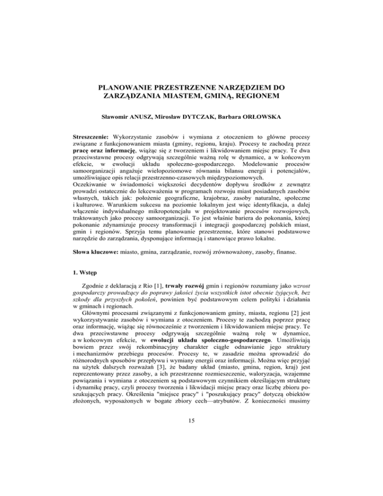 PLANOWANIE PRZESTRZENNE NARZĘDZIEM DO ZARZĄDZANIA MIASTEM, GMINĄ, REGIONEM Sławomir ANUSZ, Mirosław DYTCZAK, Barbara ORŁOWSKA Streszczenie: Wykorzystanie zasobów i wymiana z otoczeniem to główne procesy związane z funkcjonowaniem miasta (gminy, regionu, kraju). Procesy te zachodzą przez pracę oraz informację, wiążąc się z tworzeniem i likwidowaniem miejsc pracy. Te dwa przeciwstawne procesy odgrywają szczególnie ważną rolę w dynamice, a w końcowym efekcie, w ewolucji układu społeczno-gospodarczego. Modelowanie procesów samoorganizacji angażuje wielopoziomowe równania bilansu energii i potencjałów, umożliwiające opis relacji przestrzenno-czasowych międzypoziomowych. Oczekiwanie w świadomości większości decydentów dopływu środków z zewnątrz prowadzi ostatecznie do lekceważenia w programach rozwoju miast posiadanych zasobów własnych, takich jak: położenie geograficzne, krajobraz, zasoby naturalne, społeczne i kulturowe. Warunkiem sukcesu na poziomie lokalnym jest więc identyfikacja, a dalej włączenie indywidualnego mikropotencjału w projektowanie procesów rozwojowych, traktowanych jako procesy samoorganizacji. To jest właśnie bariera do pokonania, której pokonanie zdynamizuje procesy transformacji i integracji gospodarczej polskich miast, gmin i regionów. Sprzyja temu planowanie przestrzenne, które stanowi podstawowe narzędzie do zarządzania, dysponujące informacją i stanowiące prawo lokalne. Słowa kluczowe: miasto, gmina, zarządzanie, rozwój zrównoważony, zasoby, finanse. 1. Wstęp Zgodnie z deklaracją z Rio [1], trwały rozwój gmin i regionów rozumiany jako wzrost gospodarczy prowadzący do poprawy jakości życia wszystkich istot obecnie żyjących, bez szkody dla przyszłych pokoleń, powinien być podstawowym celem polityki i działania w gminach i regionach. Głównymi procesami związanymi z funkcjonowaniem gminy, miasta, regionu [2] jest wykorzystywanie zasobów i wymiana z otoczeniem. Procesy te zachodzą poprzez pracę oraz informację, wiążąc się równocześnie z tworzeniem i likwidowaniem miejsc pracy. Te dwa przeciwstawne procesy odgrywają szczególnie ważną rolę w dynamice, a w końcowym efekcie, w ewolucji układu społeczno-gospodarczego. Umożliwiają bowiem przez swój rekombinacyjny charakter ciągłe odnawianie jego struktury i mechanizmów przebiegu procesów. Procesy te, w zasadzie można sprowadzić do różnorodnych sposobów przepływu i wymiany energii oraz informacji. Można więc przyjąć na użytek dalszych rozważań [3], że badany układ (miasto, gmina, region, kraj) jest reprezentowany przez zasoby, a ich przestrzenne rozmieszczenie, waloryzacja, wzajemne powiązania i wymiana z otoczeniem są podstawowym czynnikiem określającym strukturę i dynamikę pracy, czyli procesy tworzenia i likwidacji miejsc pracy oraz liczbę zbioru poszukujących pracy. Określenia "miejsce pracy" i "poszukujący pracy" dotyczą obiektów złożonych, wyposażonych w bogate zbiory cech—atrybutów. Z konieczności musimy 15 ograniczać dalej rozległość tematu do wybranych zagadnień, będą to przede wszystkim następujące elementy: − bazy danych zasobów, ich struktura i waloryzacja, − metody analizy zawartości baz danych, ukierunkowane na mechanizmy tworzenia i likwidacji miejsc pracy, − mechanizmy wewnętrznej wymiany energii i informacji, − bilanse energii i informacji w ujęciu przestrzennym, − czynniki nierównowagowe jako elementy dynamizujące układ i uruchamiające procesy samoorganizacji, − procesy samoorganizacji, jako czynniki dążenia do nowej równowagi przez stany nierównowagi i przemiany strukturalne. Przyjmijmy za Hakonem [4] możliwość takiego sterowania układem dynamicznym otwartym, że zawsze będzie on ewoluował do jednego z całego kompletu pożądanych i możliwych do realizacji wzorów przestrzennej konfiguracji energii. Zmienne tego sterowania to na przykład: prawa naturalne—atraktorowe oddziaływanie położenia równowagi oraz prawa stanowione—państwowe i gminne przepisy podatkowe. 2. Analiza zasobów W poziomie regionalnym, źródłem informacji są głównie dane statystyczne (np. systemy GMINA i MIEJSCOWOSC), aktualizowane przy pomocy informacji własnych baz urzędów wojewódzkich, danych z monitoringu i podobnych źródeł. W poziomie lokalnym, gminy, podstawą budowy baz danych są dane źródłowe gromadzone w urzędach gminnych i rejonowych oraz dane z inwentaryzacji, uzupełniane danymi statystycznymi np. ze spisów powszechnych, rolnych i innych. Przyjęto dwie wzajemnie uzupełniające się metody analizy: − graficzną, szczególnie przydatną i nie pracochłonną w modelu całościowym dla regionów, gdy można wykorzystywać gotowe bazy danych GUS, − analityczną, bardziej przydatną do konstruowania modeli dynamicznych poszczególnych rodzajów zasobów np. energetycznych, mieszkalnych, ekspansji podmiotów gospodarczych, innowacji, zmian demograficznych, socjologii itp. Metody te wzajemnie się uzupełniają: pierwszym etapem jest zwykle metoda graficzna w postaci map komputerowych, prezentujących poszczególne warstwy informacyjne w układzie gmin i ewentualnie miejscowości. Podstawę stanowi warstwy informacyjne— źródłowe, następnie tworzone są warstwy pochodne, generujące nowe informacje— korelacje przestrzenne, gradienty gęstości, napięcia i potencjały. Ta wstępna analiza daje podstawę do formułowania hipotez roboczych, dla części analitycznej i powinna pozwolić na sformułowanie równania ewolucji. W przypadku analizy zasobów miejsc pracy i zapotrzebowania na pracę (rąk do pracy), pierwszym krokiem jest reprezentacja graficzna i uzyskanie w jej wyniku map przedstawiających następujące warstwy informacyjne: − rozkład przestrzenny istniejących, tworzonych i likwidowanych miejsc pracy, − rozkład przestrzenny liczby bezrobotnych w ujęciu strukturalnym, − korelacja zasobów miejsc prac