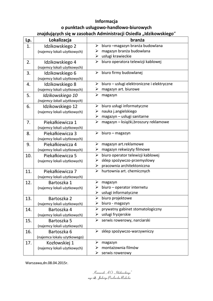 Lp. 1. Informacja o punktach usługowo-handlowo-biurowych znajdujących się w zasobach Administracji Osiedla „Idzikowskiego” Lokalizacja branża biuro –magazyn branża budowlana Idzikowskiego 2 (najemcy lokali użytkowych) 2. Idzikowskiego 4 magazyn branża budowlana usługi krawieckie biuro operatora telewizji kablowej (najemcy lokali użytkowych) 3. Idzikowskiego 6 biuro firmy budowlanej (najemcy lokali użytkowych) 4. Idzikowskiego 8 (najemcy lokali użytkowych) 5. Idzikowskiego 10 biuro – usługi elektroniczne i elektryczne magazyn art. biurowe magazyn (najemcy lokali użytkowych) 6. Idzikowskiego 12 (najemcy lokali użytkowych) 7. Piekałkiewicza 1 biuro usługi informatyczne nauka j.angielskiego magazyn – usługi sanitarne magazyn – książki,broszury reklamowe (najemcy lokali użytkowych) 8. Piekałkiewicza 3 biuro – magazyn (najemcy lokali użytkowych) 9. Piekałkiewicza 4 (najemcy lokali użytkowych) 10. Piekałkiewicza 5 (najemcy lokali użytkowych) 11. Piekałkiewicza 7 magazyn art.reklamowe magazyn rekwizyty filmowe biuro operator telewizji kablowej sklep spożywczo-przemysłowy pracownia architektoniczna hurtownia art. chemicznych magazyn biuro – operator internetu usługi informatyczne biuro projektowe biuro - magazyn prywatny gabinet stomatologiczny usługi fryzjerskie serwis rowerowy, narciarski (najemcy lokali użytkowych) 12. Bartoszka 1 (najemcy lokali użytkowych) 13. Bartoszka 2 (najemcy lokali użytkowych) 14. Bartoszka 4 (najemcy lokali użytkowych) 15. Bartoszka 5 (najemcy lokali użytkowych) 16. Bartoszka 6 sklep spożywczo-warzywniczy (najemca lokalu użytkowego) 17. Kozłowskiej 1 (najemcy lokali użytkowych) magazyn montażownia filmów serwis rowerowy Warszawa,dn.08.04.2015r. Kierownik A.O. „Idzikowskiego” mgr inż. Jadwiga Pawłowska-Radecka