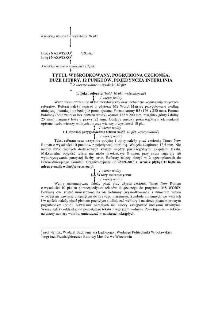 8 wierszy wolnych o wysokości 10 pkt. Imię i NAZWISKO1 Imię i NAZWISKO2 (10 pkt.) 3 wiersze wolne o wysokości 10 pkt. TYTUŁ WYŚRODKOWANY, POGRUBIONA CZCIONKA, DUŻE LITERY, 12 PUNKTÓW, POJEDYNCZA INTERLINIA 2 wiersze wolne o wysokości 10 pkt. 1. Tekst referatu (bold, 10 pkt, wyśrodkować) 1 wiersz wolny Wzór tekstu prezentuje układ merytoryczny oraz techniczne wymagania dotyczące referatów. Referat należy napisać w edytorze MS Word. Matryce przygotowane według niniejszej instrukcji nie będą już pomniejszane. Format strony B5 (176 x 250 mm). Format kolumny (pole zadruku bez numeru strony) wynosi 132 x 200 mm; margines górny i dolny 25 mm, margines lewy i prawy 22 mm. Odstępy między poszczególnym elementami opisane liczbą wierszy wolnych dotyczą wierszy o wysokości 10 pkt. 1 wiersz wolny 1.1. Sposób przygotowania tekstu (bold, 10 pkt, wyśrodkować) 1 wiersz wolny Tekst referatu oraz wszystkie podpisy i opisy należy pisać czcionką Times New Roman o wysokości 10 punktów z pojedynczą interlinią. Wcięcie akapitowe 12,5 mm. Nie należy robić żadnych dodatkowych świateł między poszczególnymi akapitami tekstu. Maksymalna objętość tekstu nie może przekroczyć 8 stron, przy czym sugeruje się wykorzystywanie parzystej liczby stron. Referaty należy złożyć w 2 egzemplarzach do Przewodniczącego Komitetu Organizacyjnego do 28.09.2013 r. wraz z płytą CD bądź na adres e-mail: [email protected] 1 wiersz wolny 1.2. Wzory matematyczne 1 wiersz wolny Wzory matematyczne należy pisać przy użyciu czcionki Times New Roman o wysokości 10 pkt za pomocą edytora tekstów dołączonego do programu MS WORD. Powinny one zostać umieszczone na osi kolumny (wyśrodkowane), z numerem wzoru w okrągłym nawiasie dosuniętym do prawego marginesu. Symbole zmiennych we wzorach i w tekście należy pisać pismem pochyłym (italic), zaś wektory i macierze pismem prostym pogrubionym (bold). Nawiasów okrągłych nie należy zastępować kreskami ukośnymi. Wzory należy oddzielać od pozostałego tekstu 1 wierszem wolnym. Powołując się w tekście na wzory numery wzorów umieszczać w nawiasach okrągłych. 1 2 prof. dr inż., Wydział Budownictwa Lądowego i Wodnego Politechniki Wrocławskiej mgr inż. Przedsiębiorstwo Budowy Mostów we Wrocławiu 1 wiersz wolny a t cos t v = , u1 10u2 (1) 1 wiersz wolny gdzie v - wektor, a , t , u1 , u 2 - zmienne. 1 wiersz wolny 2. Rysunki, wykresy, fotografie i tablice 1 wiersz wolny Rysunki, wykresy i fotografie (w przypadku fotografii proszę dołączyć pliki źródłowe w formacie *.tif, *.jpg lub *.gif) oraz tablice powinny być umieszczone na osi kolumny (wyśrodkowane) możliwie blisko tekstu, do którego się odnoszą i oddzielone od pozostałego tekstu 1 wierszem wolnym. Podpisy należy, umieszczać wyśrodkowane pod rysunkami, wykresami i fotografiami poprzedzone słowem „Rys.", zaś tytuły tablic nad tablicami poprzedzone słowem „Tablica". 1 wiersz wolny Tablica 1. Tytuł tablicy (8 pkt., do lewej) Rysunek, wykres, fotografia lub tablica Rysunek 1. Objaśnienie rysunku (8 pkt., do lewej) 1 wiersz wolny Rysunki winny być wykonane techniką komputerową i umieszczone we właściwym miejscu tekstu. Powołując się w tekście na rysunki lub tablice, numery rysunków lub tablic poprzedzone odpowiednim słowem umieszczać w nawiasach okrągłych, np. (rys. 1), (tab. 1). Spis literatury wyłącznie cytowanej w tekście poprzedzony słowem „Literatura” zamieścić przed streszczeniem w języku angielskim. Pozycje literatury, zestawić w kolejności cytowania i poprzedzić kolejnymi numerami w nawiasach kwadratowych. Opis pozycji literatury jest zależny od tego czy jest to proceedings [1], czasopismo [2], czy książka [3]. Powołania w tekście na literaturę umieszczać w nawiasach kwadratowych [ ]. 1 wiersz wolny Literatura (bold 10 pkt, wyśrodkować) 1 wiersz wolny [1] BORZEMSKI L., An algorithm for a certain reliability problem. Proc. 7th Int. Conf. on Systems Engineering. Las Vegas, University of Nevada, 1990; s. 242-250. [2] EIMER C., Plasticity of polycrystal. Archives of Mechanics. 1977, Vol. 29, No. 5, s.687-704. [3] NOWACKI W., Theory of elasticity. Warszawa, PWN, 1970. 2 wiersze wolne TYTUŁ PRACY W JĘZYKU ANGIELSKIM (bold 12 pkt.) 1 wiersz wolny o wysokości 10 pkt. Summary (bold, 10 pkt, wyśrodkować) 1 wiersz wolny Streszczenie w języku angielskim (około 10 wierszy) pisane czcionką Times New Roman o wysokości 10 pkt. należy zamieścić na końcu referatu. Poprzedzić je tytułem w języku angielskim (duże litery) i słowem Summary.