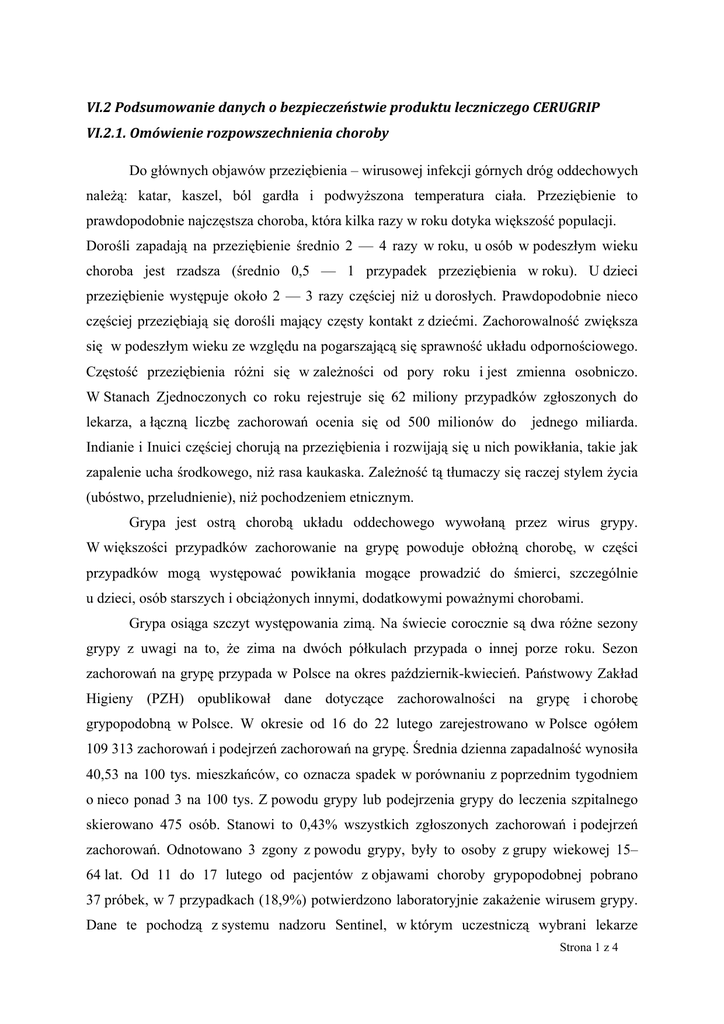 VI.2 Podsumowanie danych o bezpieczeństwie produktu leczniczego CERUGRIP VI.2.1. Omówienie rozpowszechnienia choroby Do głównych objawów przeziębienia – wirusowej infekcji górnych dróg oddechowych należą: katar, kaszel, ból gardła i podwyższona temperatura ciała. Przeziębienie to prawdopodobnie najczęstsza choroba, która kilka razy w roku dotyka większość populacji. Dorośli zapadają na przeziębienie średnio 2 — 4 razy w roku, u osób w podeszłym wieku choroba jest rzadsza (średnio 0,5 — 1 przypadek przeziębienia w roku). U dzieci przeziębienie występuje około 2 — 3 razy częściej niż u dorosłych. Prawdopodobnie nieco częściej przeziębiają się dorośli mający częsty kontakt z dziećmi. Zachorowalność zwiększa się w podeszłym wieku ze względu na pogarszającą się sprawność układu odpornościowego. Częstość przeziębienia różni się w zależności od pory roku i jest zmienna osobniczo. W Stanach Zjednoczonych co roku rejestruje się 62 miliony przypadków zgłoszonych do lekarza, a łączną liczbę zachorowań ocenia się od 500 milionów do jednego miliarda. Indianie i Inuici częściej chorują na przeziębienia i rozwijają się u nich powikłania, takie jak zapalenie ucha środkowego, niż rasa kaukaska. Zależność tą tłumaczy się raczej stylem życia (ubóstwo, przeludnienie), niż pochodzeniem etnicznym. Grypa jest ostrą chorobą układu oddechowego wywołaną przez wirus grypy. W większości przypadków zachorowanie na grypę powoduje obłożną chorobę, w części przypadków mogą występować powikłania mogące prowadzić do śmierci, szczególnie u dzieci, osób starszych i obciążonych innymi, dodatkowymi poważnymi chorobami. Grypa osiąga szczyt występowania zimą. Na świecie corocznie są dwa różne sezony grypy z uwagi na to, że zima na dwóch półkulach przypada o innej porze roku. Sezon zachorowań na grypę przypada w Polsce na okres październik-kwiecień. Państwowy Zakład Higieny (PZH) opublikował dane dotyczące zachorowalności na grypę i chorobę grypopodobną w Polsce. W okresie od 16 do 22 lutego zarejestrowano w Polsce ogółem 109 313 zachorowań i podejrzeń zachorowań na grypę. Średnia dzienna zapadalność wynosiła 40,53 na 100 tys. mieszkańców, co oznacza spadek w porównaniu z poprzednim tygodniem o nieco ponad 3 na 100 tys. Z powodu grypy lub podejrzenia grypy do leczenia szpitalnego skierowano 475 osób. Stanowi to 0,43% wszystkich zgłoszonych zachorowań i podejrzeń zachorowań. Odnotowano 3 zgony z powodu grypy, były to osoby z grupy wiekowej 15– 64 lat. Od 11 do 17 lutego od pacjentów z objawami choroby grypopodobnej pobrano 37 próbek, w 7 przypadkach (18,9%) potwierdzono laboratoryjnie zakażenie wirusem grypy. Dane te pochodzą z systemu nadzoru Sentinel, w którym uczestniczą wybrani lekarze Strona 1 z 4 podstawowej opieki zdrowotnej, stacje sanitarno-epidemiologiczne oraz Krajowy Ośrodek ds. Grypy NIZP-PZH. Zapalenie zatok przynosowych można podzielić na ostre, nawracające i przewlekłe. Chorobie zwykle towarzyszą objawy zapalenia błony śluzowej nosa, gorączka (w przypadkach ostrego zapalenia) oraz ból o zmiennej lokalizacji: czoła (zwłaszcza przy ucisku) w przypadku zapalenia zatok czołowych, szczęki, górnych zębów lub policzka w przypadku zapalenia zatoki szczękowej, okolicy nasady nosa w przypadku zapalenia zatok sitowych (dodatkowo zwykle towarzyszy temu obrzęk powiek), szczytu głowy lub ucha w przypadku zapalenia zatoki klinowej. W większości przypadków są spowodowane zakażeniem wirusowym, a objawy ustepują w ciągu 10 dni. Jest to częste schorzenie, w Stanach Zjednoczonych odnotowuje się ponad 24 mln przypadków rocznie. Szacuje się, że chroniczne zapalenie zatok przynosowych dosięga około 12,5% populacji ludzi. VI.2.2.Omówienie korzyści wynikających z leczenia Ocenę skuteczności klinicznej paracetamolu w zakresie działania przeciwgorączkowego przeprowadzono głównie u dzieci w wieku od 28 miesięcy do 18 lat z gorączką na tle ostrych zakażeń, a przeciwbólowego u dzieci oraz u dorosłych z napięciowymi bólami głowy oraz bólami na różnym tle. Wśród badanych populacji dominowały osoby rasy kaukaskiej. Badania przeprowadzono na pacjentach obu płci, przy czym w większości badanych populacji przeważała płeć męska. Ocenę skuteczności przeciwkaszlowej dekstrometorfanu przeprowadzono u pacjentów z zakażeniami układu oddechowego, zarówno u dorosłych w wieku od 18 do 60 lat, z czego od 35 do 70% stanowiły kobiety, jak i u dzieci w wieku od 2 do 18 lat, z których dziewczynki stanowiły 42-47%. W badanych populacjach dominowały osoby rasy kaukaskiej. Ocenę skuteczności klinicznej pseudoefedryny z zakresie łagodzenia objawów nieżytu górnych dróg oddechowych na różnym tle, a zwłaszcza przekrwienia błony śluzowej nosa, przeprowadzono na populacjach dorosłych pacjentów w wieku od 18 do 65 lat . Do badań zakwalifikowano pacjentów z objawami tzw. przeziębienia lub zaostrzonym sezonowym alergicznym nieżytem nosa. Badania przeprowadzono na grupach wielorasowych, w których zdecydowanie dominowały osoby rasy kaukaskiej. W większości badanych grup przeważały kobiety, które stanowiły od 35% do 69% liczebności grup. Stwierdzono istotną statystycznie zależność pomiędzy wielkością dawki paracetamolu a efektem przeciwgorączkowym i przeciwbólowym. Nie oceniano zależności pomiędzy Strona 2 z 4 wielkością stosowanej dawki leku a skutecznością przeciwkaszlową dekstrometorfanu. W analizowanych wyżej badaniach klinicznych nie oceniano zależności pomiędzy wielkością stosowanej dawki, rodzajem preparatu pseudoefedryny (szybkie uwalnianie i przedłużone uwalnianie), sposobem dawkowania a skutecznością kliniczną. VI.2.3. Brakujące dane odnoszące się do korzyści wynikających z leczenia Produkty zawierające takie połączenie substancji czynnych stosowane s