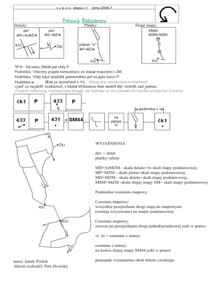 v v a o s - etapa e3 Detaily: zima 2006-7 Trhovýý Š Štěpánov p Plánky: Slepé mapy: WYJAŚNIENIA det: = detal planky=plany MD=3xMZM - skala detalu=3x skali mapy podstawowej, MP=MZM - skala planu=skali mapy podstawowej, MD=MZM - skala detalu=skali mapy podstawowej, MSM=MZM -skala ślepej mapy SM= skali mapy podstawowej Podminka=constans mapowy Constans mapowy: wszystkie przejechane drogi stają sie mapowymi (zostają wrysowane) na mapie podstawowej Constans mapowy: zawsze po przejechaniu drogi jednokierunkowej jedż w prawo vl. iti.= constans z natury constans z natury: na końcu slepej mapy SM44 jedź w prawo autor: Janek Prošek hlavní rozhodčí: Petr Dvorský pozostałe wyjaśnienia obok tekstu czeskiego