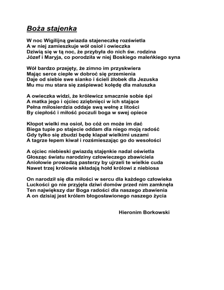 Boża stajenka W noc Wigilijną gwiazda stajeneczkę rozświetla A w niej zamieszkuje wół osioł i owieczka Dziwią się w tą noc, że przybyła do nich św. rodzina Józef i Maryja, co porodziła w niej Boskiego maleńkiego syna Wół bardzo przejęty, że zimno im przyskwiera Mając serce ciepłe w dobroć się przemienia Daje od siebie swe sianko i ścieli żłobek dla Jezuska Mu mu mu stara się zaśpiewać kolędę dla maluszka A owieczka widzi, że królewicz smacznie sobie śpi A matka jego i ojciec zziębnięci w ich stające Pełna miłosierdzia oddaje swą wełnę z litości By ciepłość i miłość poczuli boga w swej opiece Kłopot wielki ma osioł, bo cóż on może im dać Biega tupie po stajecie oddam dla niego moją radość Gdy tylko się zbudzi będę klapał wielkimi uszami A tagrze łepem kiwał i rozśmieszając go do wesołości A ojciec niebieski gwiazdą stajęnkie nadal oświetla Głosząc światu narodziny człowieczego zbawiciela Aniołowie prowadzą pasterzy by ujrzeli te wielkie cuda Nawet trzej królowie składają hołd królowi z niebiosa On narodził się dla miłości w sercu dla każdego człowieka Luckości go nie przyjęła dziwi domów przed nim zamknęła Ten największy dar Boga radości dla naszego zbawienia A on dzisiaj jest królem błogosławionego naszego życia Hieronim Borkowski