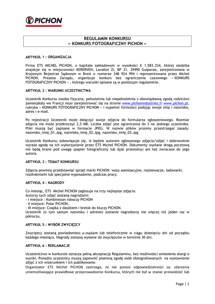 REGUL LAMIN KON NKURSU « KONKURS FO OTOGRAFIC CZNY PICH HON » UŁ 1 : ORGAN NIZACJA ARTYKU ETS MICHEL PICHON, o kapitale zaakładowym w wysokośc ci € 1.583.3334, której siedziba Firma E znajduje e się w mie ejscowości KERERVEN, K LLavallot ZI, BP 21, 294 490 Guipavass, zarejestro owana w Krajowym Rejestrze e Sądowym w Brest o numerze 34 48 924 994 i reprezenttowana prze ez Michel b ogranic czenia czaasowego « KONKURS PICHON, Prezesa Zarządu, organizuje konkurs bez RAFICZNY PIC CHON » , którego warunkki opisane są ą w poniższym m regulaminiie. FOTOGR UŁ 2 : WARUNKI UCZESTNICTWA ARTYKU czna, pełnole etnia lub nie epełnoletnia z obowiązkoową zgodą rodziców) r Uczestniik Konkursu (osoba fizyc zamieszkkały we Fran ncji musi zarejestrować się na stron nie www.pic chonindustriees.fr www.p pichon.pl, rubryka « KONKURS FOTOGRAFIC CZNY PICHON N » i wypełn nić formularz z podając sw woje imię i nazwisko, n e-mail. adres i e estnik może dołączyć sswoje zdjęcia do formu ularza zgłosszeniowego. Rozmiar Po rejesstracji Ucze zdjęcia nie może prrzekroczyć 2,5 2 MB. Liczzba zdjęć jest ograniczo ona do 3 na jednego uc czestnika. uszą być za apisane w formacie JP PEG. W nazzwie plików w prosimy pprzestrzegać zasady: Pliki mu nazwisko o_imię_01.Jp pg, nazwisko o_imię_02.Jp pg, nazwisko o_imię_03.Jp pg ędzie autorem zgłoszone ego zdjęcia//zdjęć i dob browolnie Uczestniik Konkursu zobowiązuje się, iż bę wyraża zzgodę na ich h wykorzysta anie przez EETS Michel PICHON. Doku umenty wysłłane drogą pocztową p nie będą ą brane pod d uwagę (pa apier fotograaficzny lub dysk przeno ośny) ani teeż zwracane do jego autora. UŁ 3 : TEMAT T KONKURSU U ARTYKU przęt marki PICHON: wozzy asenizacy yjne, rozsiew wacze, ładow warki, Zdjęcia powinny przedstawiać sp niarki lub spe ecjalne wypo osażenie, poodczas pracy y. rozdrabn UŁ 4 : NAGRO ODY ARTYKU psze zdjęcia. Co miesiiąc, ETS Micchel PICHON zagłosuje naa trzy najlep Autorzy tych zdjęć zostaną z nagro odzeni: - I miejsce : Kombinezon roboczy PICHON - II miejssce: Polar PICHON, - III miejjsce: Czapka a z daszkiem i brelok do kluczy PICHO ON. Uczestniik (o tym samym s nazw wisku i adre esie) zostaniie nagrodzon ny nie więccej niż jede en raz w półroczu u. UŁ 5 : WYBÓR ZWYCIĘZC CY ARTYKU m lub telefonicznie w ciągu dziesięęciu dni od początku Zwycięzccy zostaną powiadomieni e-mailem każdego miesiąca. Nagrody N zosta aną wysłane do zwycięzc ców w terminie 30 dni. ARTYKU UŁ 6 : REKLA AMACJE kursie oznac cza pełną akcceptację Reg gulaminu, be ez możliwoścci wniesienia a skargi o Uczestniictwo w konk wyniki. P Ponadto uczzestnicy muszą zapewnićć pisemną zg godę osób sfotografowannych na wysstawienie zdjęć z iich wizerunk kiem i ich publikowanie. Organizaator ETS Michel M PICHON zastrzeega, że nie e ponosi odpowiedzialnności za: zdarzenia z uniemożżliwiające prrawidłowe przeprowadzeenie Konkurssu, których nie był w sttanie przewidzieć lub Page | 1 którym nie mógł zapobiec, w szczególności w przypadku zaistnienia zdarzeń losowych w tym siły wyższej. ARTYKUŁ 10 : KORZYSTANIE Z DANYCH OSOBOWYCH Dane osobowe przekazane Organizatorowi przez uczestników będą przez niego przetwarzane w celu realizacji Konkursu. Podanie danych osobowych jest dobrowolne, jednakże warunkiem otrzymania nagrody w Konkursie jest zgoda na ich przetwarzanie. Każdy uczestnik posiada prawo dostępu do swoich danych osobowych, do ich poprawiania oraz usuwania, zgłoszenia można kierować na adres: ETS MICHEL PICHON, CONCOURS PHOTOS, ZI de Lavallot, BP 21, 29490 GUIPAVAS – FRANCE. Dane osobowe będą przetwarzane zgodnie z przepisami ustawy z dnia 6 stycznia 1978r. „Informatyka i Wolność”. ARTYKUŁ 11 : ODPOWIEDZIALNOŚĆ ETS Michel PICHON nie może ponosić żadnej odpowiedzialności, jeżeli w przypadku siły wyższej lub zdarzeń pozostających poza jego kontrolą, zmienił warunki uczestnictwa (zmiana sposobu dostępu na początku konkursu lub podczas jego trwania ...) i procedury Konkursu. ETS Michel PICHON nie ponosi odpowiedzialności za problemy w funkcjonowaniu systemu, jeżeli nastąpiły one na skutek przyczyn niezawinionych przez Organizatora, w szczególności w przypadku zakażenia wirusem bądź ingerencji osób trzecich. ETS Michel PICHON nie może być pociągnięty do odpowiedzialności za jakiekolwiek awarie Internetu, uniemożliwiające prawidłowy przebieg Konkursu i informacje uczestników. ETS Michel PICHON nie ponosi odpowiedzialności za wszelkie szkody wyrządzone uczestnikom, ich urządzeniom oraz przechowywanym danym, jak i za możliwe konsekwencje w działalności osobistej i zawodowej. ETS Michel PICHON nie ponosi odpowiedzialności w przypadku problemów z połączeniem się z witryną przez jednego lub więcej uczestników ze względu na problemy lub usterki techniczne związane z serwerem lub hostingiem. Page | 2