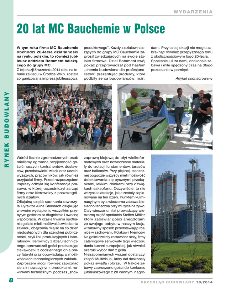 WYDA RZEN I A R YNE K BUDOWLANY 20 lat MC Bauchemie w Polsce 8 W tym roku firma MC Bauchemie obchodzi 20-lecie działalności na rynku polskim, to również jubileusz oddziału Botament należącego do grupy MC. Z tej okazji 5 września 2014 roku na terenie zakładu w Środzie Wlkp. została zorganizowana impreza jubileuszowa. produktowego”. Każdy z działów należących do grupy MC Bauchemie zaprosił zwiedzających na swoje stoisko firmowe. Dział Botament swój pokaz przeprowadzał pod hasłem „chemia budowlana dla profesjonalistów” prezentując produkty, które podbiły serca budowlańców: m.in. Wśród licznie zgromadzonych osób mieliśmy ogromną przyjemność gościć naszych kontrahentów, dostawców, przedstawicieli władz oraz uczelni wyższych, pracowników, jak również przyjaciół firmy. Przed rozpoczęciem imprezy odbyła się konferencja prasowa, w której uczestniczył zarząd firmy oraz kierownicy z poszczególnych działów. Oficjalną część spotkania otworzyła Dyrektor Alina Stelmach dziękując w swoim wystąpieniu wszystkim przybyłym gościom za długoletnią i owocną współpracę. W czasie trwania spotkania goście mieli możliwość zwiedzenia zakładu, obejrzenia miejsc na co dzień niedostępnych dla szerokiej publiczności, czyli linii produkcyjnych i laboratoriów. Kierownicy z działu technicznego oprowadzali gości przekazując ciekawostki z codziennego dnia pracy fabryki oraz opowiadając o możliwościach technologicznych zakładu. Zaproszeni mogli również zapoznać się z innowacyjnymi produktami, nowinkami technicznymi podczas „show zaprawę klejową do płyt wielkoformatowych oraz nowoczesne materiały do izolacji fundamentów, tarasów oraz balkonów. Przy pięknej, słonecznej pogodzie wszyscy mieli możliwość delektowania się pysznymi przekąskami, lekkimi drinkami przy dźwiękach saksofonu. Oczywiście, to nie wszystkie atrakcje, jakie zostały zaplanowane na ten dzień. Punktem kulminacyjnym była wieczorna zabawa biesiadno-taneczna przy muzyce na żywo. Cały wieczór umilał prowadzący wieczorną część spotkania Steffen Möller, który zabawiał gości anegdotami ze swojego pobytu w naszym kraju, w zabawny sposób przedstawiając różnice w zachowaniu Polaków i Niemców. Na gości czekały zastawione stoły, firmy cateringowe serwowały tego wieczoru dania kuchni europejskiej, jak również szeroki wybór dań z grilla. Niezapomnianych wrażeń dostarczył zespół MultiVisual, który dał doskonały pokaz światła i obrazu. W trakcie zabawy zaproszono gości do konkursu jubileuszowego z 20 cennymi nagro- dami. Przy takiej okazji nie mogło zabraknąć również przepysznego tortu z okolicznościowym logo 20-lecia. Spotkanie już za nami, doskonała zabawa i mile spędzony czas na długo pozostanie w pamięci. Artykuł sponsorowany PRzeg l Ąd bu d owl any 10/2014