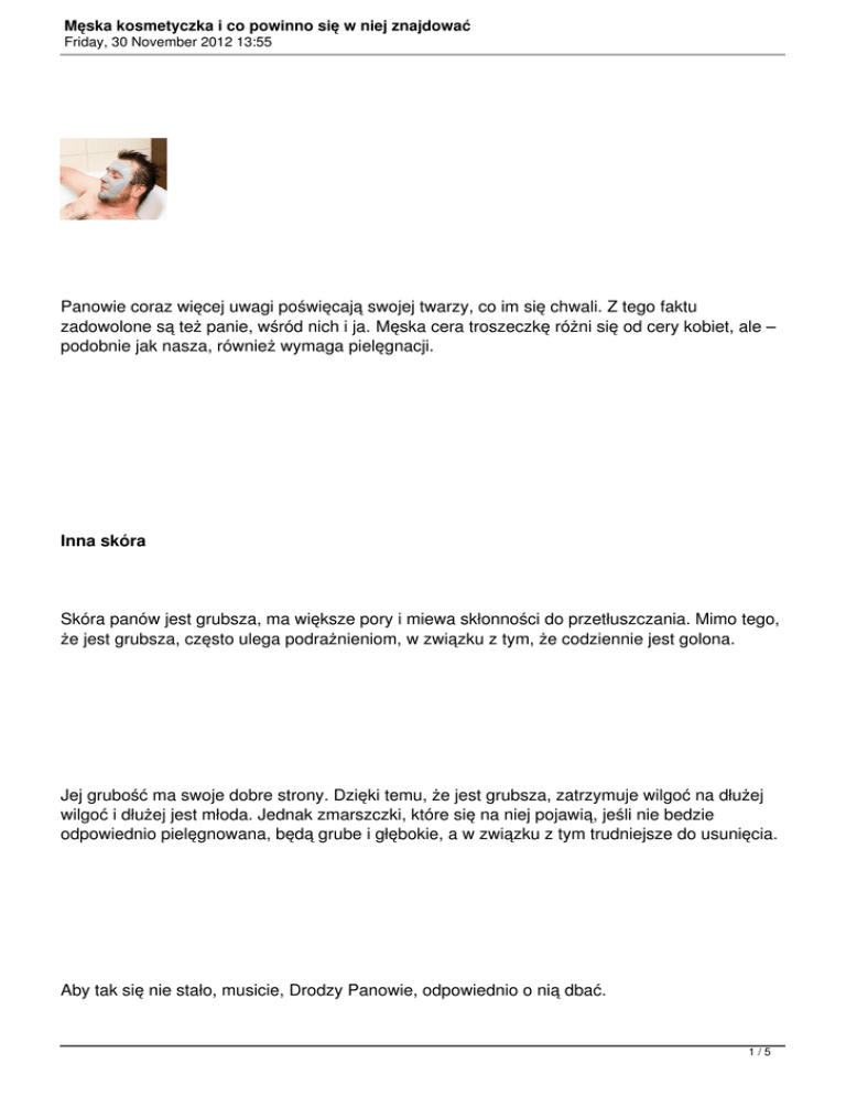Męska kosmetyczka i co powinno się w niej znajdować Friday, 30 November 2012 13:55 Panowie coraz więcej uwagi poświęcają swojej twarzy, co im się chwali. Z tego faktu zadowolone są też panie, wśród nich i ja. Męska cera troszeczkę różni się od cery kobiet, ale – podobnie jak nasza, również wymaga pielęgnacji. Inna skóra Skóra panów jest grubsza, ma większe pory i miewa skłonności do przetłuszczania. Mimo tego, że jest grubsza, często ulega podrażnieniom, w związku z tym, że codziennie jest golona. Jej grubość ma swoje dobre strony. Dzięki temu, że jest grubsza, zatrzymuje wilgoć na dłużej wilgoć i dłużej jest młoda. Jednak zmarszczki, które się na niej pojawią, jeśli nie bedzie odpowiednio pielęgnowana, będą grube i głębokie, a w związku z tym trudniejsze do usunięcia. Aby tak się nie stało, musicie, Drodzy Panowie, odpowiednio o nią dbać. 1/5 Męska kosmetyczka i co powinno się w niej znajdować Friday, 30 November 2012 13:55 Mężczyzna, tak samo jak i kobieta, powinien mieć własne kosmetyki pielęgnacyjne i najlepiej takie stworzone właśnie z myślą o mężczyźnie. Wiele firm kosmetycznych ma w swojej ofercie linie kosmetyczne tylko dla mężczyzn. Warto więc skorzystać z ich oferty. Co więc powinien mieć każdy mężczyzna w swojej domowej kosmetyczce? Po pierwsze – kosmetyki oczyszczajace Specjalnie skomponowane składniki pozwolą oczyścić Waszą twarz z zanieczyszczeń nagromadzonych w ciągu całego dnia. Najlepiej w formie żelowej, łatwej do rozprowadzenia na twarzy i zmycia, bo – jak wiadomo, Panowie, unikacie skomplikowanej pielęgnacji. Po drugie – tonik Warto zaopatrzyć sie również w tonik. Pozwoli on wrócić Waszej skórze do prawidłowego ph. To tylko minutka, żeby zaaplikować, a odczujecie wielką różnicę na skórze. 2/5 Męska kosmetyczka i co powinno się w niej znajdować Friday, 30 November 2012 13:55 Po trzecie – krem Jeśli jesteście młodzi, wystarczy Wam krem dobrze nawilżający, ale jeśli zbliżacie się do trzydziestki, warto sięgnać po coś przeciwzmarszczkowego. Krem będzie chronił skórę przed podrażnieniami. Jak wiecie, skóra golona odsłania naskórek i przez to staje się podatna na podrażnienie i przesuszenie. Nawilżona cera będzie się czuła komfortowo, nie będziecie czuć napięcia na powierzchni skóry, ochroni również przed starzeniem. Oczywiście, jeśli Wasza skóra jest problemowa, warto zainwestować w krem dotykający problemu, w taki, który pomoże Wam się problemu pozbyć. Najczęściej panowie zmagają się z przetluszczaniem, wypryskami i trądzikiem, które pojawiają się u młodych mężczyzn. Nie bójcie się więc kosmetyków – pomogą one zwalczyć problem, a Wy – z zadbaną cerą – napewno poczujecie się pewniej. Po czwarte – peeling i maseczka, najlepiej nawilżająca Peeling powinniście robić nie częściej niż raz w miesiącu, najlepiej delikatny – żelowy, którym wykonujemy masaż całej twarzy. Maseczkę z kolei należy stosować w zależności od potrzeb skóry i wolnego czasu, idealnie – raz w tygodniu bądź raz na dwa tygodnie. 3/5 Męska kosmetyczka i co powinno się w niej znajdować Friday, 30 November 2012 13:55 To takie naprawdę niezbędne minimum. Nie wspominam oczywiście o piance do golenia, balsamie po goleniu łagodzącym podrażnienia, kremie pod oczy czy dezodorancie. Zimą warto uzupełnić Wasza kosmetyczkę o dobry krem chroniący przed zimnem i ochronny balsam do ust. Jeśli któryś Pan ma jakieś pytania dotyczące pielęgnacji skóry, chętnie służę poradą. Panie zapraszam na zakupy przedświąteczne dla Waszych Panów i również służę radą. Pozdrawiam serdecznie 4/5 Męska kosmetyczka i co powinno się w niej znajdować Friday, 30 November 2012 13:55 Anna Drożdż dyplomowana kosmetyczka i wizażystka przedstawiciel tianDe w UK [email protected] kom. 07897966558 5/5