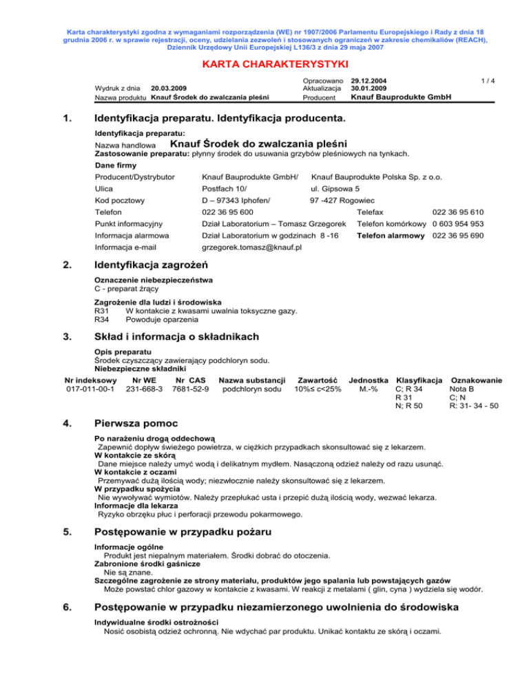 Karta charakterystyki zgodna z wymaganiami rozporządzenia (WE) nr 1907/2006 Parlamentu Europejskiego i Rady z dnia 18 grudnia 2006 r. w sprawie rejestracji, oceny, udzielania zezwoleń i stosowanych ograniczeń w zakresie chemikaliów (REACH), Dziennik Urzędowy Unii Europejskiej L136/3 z dnia 29 maja 2007 KARTA CHARAKTERYSTYKI Opracowano Aktualizacja Producent 20.03.2009 Wydruk z dnia Nazwa produktu Knauf Środek do zwalczania pleśni 1. 29.12.2004 30.01.2009 1/4 Knauf Bauprodukte GmbH Identyfikacja preparatu. Identyfikacja producenta. Identyfikacja preparatu: Knauf Środek do zwalczania pleśni Nazwa handlowa Zastosowanie preparatu: płynny środek do usuwania grzybów pleśniowych na tynkach. Dane firmy 2. Producent/Dystrybutor Knauf Bauprodukte GmbH/ Knauf Bauprodukte Polska Sp. z o.o. Ulica Postfach 10/ ul. Gipsowa 5 Kod pocztowy D – 97343 Iphofen/ 97 -427 Rogowiec Telefon 022 36 95 600 Telefax Punkt informacyjny Dział Laboratorium – Tomasz Grzegorek Telefon komórkowy 0 603 954 953 022 36 95 610 Informacja alarmowa Dział Laboratorium w godzinach 8 -16 Telefon alarmowy 022 36 95 690 Informacja e-mail [email protected] Identyfikacja zagroŜeń Oznaczenie niebezpieczeństwa C - preparat Ŝrący ZagroŜenie dla ludzi i środowiska R31 W kontakcie z kwasami uwalnia toksyczne gazy. R34 Powoduje oparzenia 3. Skład i informacja o składnikach Opis preparatu Środek czyszczący zawierający podchloryn sodu. Niebezpieczne składniki Nr indeksowy 017-011-00-1 4. Nr WE 231-668-3 Nr CAS 7681-52-9 Nazwa substancji podchloryn sodu Zawartość Jednostka Klasyfikacja Oznakowanie 10%≤ c<25% M.-% C; R 34 Nota B R 31 C; N N; R 50 R: 31- 34 - 50 Pierwsza pomoc Po naraŜeniu drogą oddechową Zapewnić dopływ świeŜego powietrza, w cięŜkich przypadkach skonsultować się z lekarzem. W kontakcie ze skórą Dane miejsce naleŜy umyć wodą i delikatnym mydłem. Nasączoną odzieŜ naleŜy od razu usunąć. W kontakcie z oczami Przemywać duŜą ilością wody; niezwłocznie naleŜy skonsultować się z lekarzem. W przypadku spoŜycia Nie wywoływać wymiotów. NaleŜy przepłukać usta i przepić duŜą ilością wody, wezwać lekarza. Informacje dla lekarza Ryzyko obrzęku płuc i perforacji przewodu pokarmowego. 5. Postępowanie w przypadku poŜaru Informacje ogólne Produkt jest niepalnym materiałem. Środki dobrać do otoczenia. Zabronione środki gaśnicze Nie są znane. Szczególne zagroŜenie ze strony materiału, produktów jego spalania lub powstających gazów MoŜe powstać chlor gazowy w kontakcie z kwasami. W reakcji z metalami ( glin, cyna ) wydziela się wodór. 6. Postępowanie w przypadku niezamierzonego uwolnienia do środowiska Indywidualne środki ostroŜności Nosić osobistą odzieŜ ochronną. Nie wdychać par produktu. Unikać kontaktu ze skórą i oczami. Karta charakterystyki zgodna z wymaganiami rozporządzenia (WE) nr 1907/2006 Parlamentu Europejskiego i Rady z dnia 18 grudnia 2006 r. w sprawie rejestracji, oceny, udzielania zezwoleń i stosowanych ograniczeń w zakresie chemikaliów (REACH), Dziennik Urzędowy Unii Europejskiej L136/3 z dnia 29 maja 2007 KARTA CHARAKTERYSTYKI 20.03.2009 Wydruk z dnia Nazwa produktu Knauf Środek do zwalczania pleśni Opracowano Aktualizacja Producent 29.12.2004 30.01.2009 2/4 Knauf Bauprodukte GmbH Niezbędne środki w zakresie ochrony środowiska Produkt nie powinien dostać się do zbiorników wodnych, wód gruntowych lub kanalizacji. Metody oczyszczania i wchłaniania Małe ilości usuwać przy pomocy materiałów chłonnych ( np.: piasek, ziemia okrzemkowa, łącznik kwasowy, łącznik uniwersalny). 7. Postępowanie z preparatem i jego magazynowanie Środki ostroŜności podczas obchodzenia się z substancją Podczas pracy z materiałem nie naleŜy jeść i pić. Unikać kontaktu ze skórą i oczami, nie wdychać par. Wymagania w zakresie przechowywania i opakowań Przechowywać tylko w oryginalnych, szczelnych opakowaniach, w pomieszczeniach dobrze wentylowanych. Nie dopuścić do kontaktu z kwasami. Zalecana temperatura przechowywania pomiędzy 5 °C a 30 °C. 8. Kontrola naraŜenia i środki ochrony indywidualnej Parametry kontroli niebezpiecznych składników w miejscu pracy NDS, NDSCh. Nr CAS Czynnik szkodliwy NDS NDSCh Jednostka 3 7782-50-5 chlor 1,5 9 mg/m Podstawa prawna Normatywy higieniczne dla środowiska pracy wg. Rozporządzenia MPiPS z dn.29 listopada 2002 r. w sprawie najwyŜszych dopuszczalnych stęŜeń i natęŜeń czynników szkodliwych dla zdrowia w środowisku pracy ( Dz.U. Nr 217 poz.1833 z 2002 r. z późniejszymi zmianami). Ogólne środki ostroŜności i zasady higieny Nie wdychać oparów. Ochrona dróg oddechowych Małe zapylenie: naleŜy zadbać o dobrą wentylację. DuŜe zapylenie: uŜyć filtr przeciwgazowy, filtr typu B. Ochrona oczu Nosić specjalne szczelne ochronne okulary. Ochrona rąk i ciała Nosić odpowiednie rękawice ochronne ( kauczuk, neopren, PCW) odporne na działanie alkaliów. Nosić ochronne ubranie robocze. 9. Właściwości fizyczne i chemiczne stan skupienia: barwa: zapach: temperatura wrzenia: temperatura zapłonu: temperatura samozapłonu: granice wybuchowości gęstość przy 20°C: zdolność do mieszanie się z wodą: wartość pH przy 20°C: właściwości utleniające 10. ciecz lekko Ŝółta, klarowny płyn zapach chloru 90°C nie dotyczy produkt nie jest samozapalny nie dotyczy 3 1,1 kg/ dm bardzo dobrze się miesza >12 działa utleniająco Stabilność i reaktywność Stabilność Substancja nietrwała, wzrost temperatury przyspiesza rozkład. Substancje, których naleŜy unikać Kwasy powodują wydzielanie toksycznego chloru. Metale cięŜkie przyspieszają rozkład z wydzieleniem wodoru. 11. Informacje toksykologiczne Toksyczność preparatu Produkt ma działanie utleniające na skórę, oczy i błony śluzowe. Układ trawienny - Połknięcie powoduje oparzenia przewodu pokarmowego, nudności, wymioty, w powaŜnych przypadkach krwotok wewnętrzny, perforacje śc