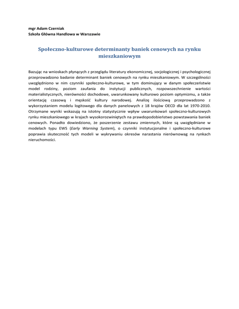 mgr Adam Czerniak Szkoła Główna Handlowa w Warszawie Społeczno-kulturowe determinanty baniek cenowych na rynku mieszkaniowym Bazując na wnioskach płynących z przeglądu literatury ekonomicznej, socjologicznej i psychologicznej przeprowadzono badanie determinant baniek cenowych na rynku mieszkaniowym. W szczególności uwzględniono w nim czynniki społeczno-kulturowe, w tym dominujący w danym społeczeństwie model rodziny, poziom zaufania do instytucji publicznych, rozpowszechnienie wartości materialistycznych, nierówności dochodowe, uwarunkowany kulturowo poziom optymizmu, a także orientację czasową i męskość kultury narodowej. Analizę ilościową przeprowadzono z wykorzystaniem modelu logitowego dla danych panelowych z 18 krajów OECD dla lat 1970-2010. Otrzymane wyniki wskazują na istotny statystycznie wpływ uwarunkowań społeczno-kulturowych rynku mieszkaniowego w krajach wysokorozwiniętych na prawdopodobieństwo powstawania baniek cenowych. Ponadto dowiedziono, że poszerzenie zestawu zmiennych, które są uwzględniane w modelach typu EWS (Early Warning System), o czynniki instytucjonalne i społeczno-kulturowe poprawia skuteczność tych modeli w wykrywaniu okresów narastania nierównowag na rynkach nieruchomości.