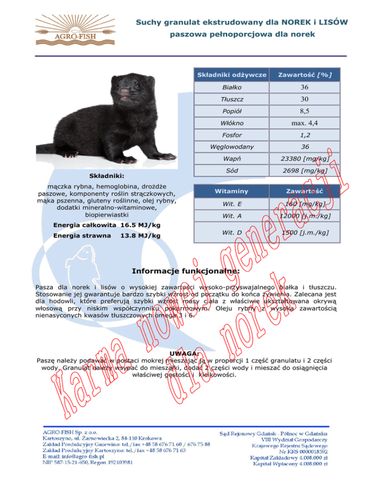 Suchy granulat ekstrudowany dla NOREK i LISÓW paszowa pełnoporcjowa dla norek Składniki: mączka rybna, hemoglobina, drożdże paszowe, komponenty roślin strączkowych, mąka pszenna, gluteny roślinne, olej rybny, dodatki mineralno-witaminowe, biopierwiastki Składniki odżywcze Zawartość [%] Białko 36 Tłuszcz 30 Popiół 8,5 Włókno max. 4,4 Fosfor 1,2 Węglowodany 36 Wapń 23380 [mg/kg] Sód 2698 [mg/kg] Witaminy Zawartość Wit. E 160 [mg/kg] Wit. A 12000 [j.m./kg] Wit. D 1500 [j.m./kg] Energia całkowita 16.5 MJ/kg Energia strawna 13.8 MJ/kg Informacje funkcjonalne: Pasza dla norek i lisów o wysokiej zawartości wysoko-przyswajalnego białka i tłuszczu. Stosowanie jej gwarantuje bardzo szybki wzrost od początku do końca żywienia. Zalecana jest dla hodowli, które preferują szybki wzrost masy ciała z właściwie ukształtowana okrywą włosową przy niskim współczynniku pokarmowym. Oleju rybny z wysoka zawartością nienasyconych kwasów tłuszczowych omega 3 i 6. UWAGA: Paszę należy podawać w postaci mokrej mieszając ją w proporcji 1 część granulatu i 2 części wody. Granulat należy wsypać do mieszałki, dodać 2 części wody i mieszać do osiągnięcia właściwej gęstości i kleikowości.