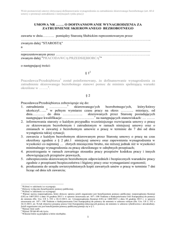 Wzór postanowień umowy dotyczącej dofinansowania wynagrodzenia za zatrudnienie skierowanego bezrobotnego (art. 60 d ustawy o promocji zatrudnienia i instytucjach rynku pracy) UMOWA NR ……. O DOFINANSOWANIE WYNAGRODZENIA ZA ZATRUDNIENIE SKIEROWANEGO BEZROBOTNEGO zawarta w dniu………. pomiędzy Starostą Słubickim reprezentowanym przez ……………………………………………………………………………………………….. zwanym dalej "STAROSTĄ" a .................................................................................................................................................. reprezentowanym przez …………………………………………………………………….. zwanym dalej "PRACODAWCĄ/PRZEDSIĘBIORCĄ1" o następującej treści: § 12 Pracodawca/Przedsiębiorca3 został poinformowany, że dofinansowanie wynagrodzenia za zatrudnienie skierowanego bezrobotnego stanowi pomoc de minimis spełniającą warunki określone w ……..4. §2 Pracodawca/Przedsiębiorca zobowiązuje się do: 1. zatrudnienia ……………5 skierowanego/ych bezrobotnego/ych, który/którzy 6 ukończył….... w pełnym wymiarze czasu pracy na okres ……….. miesięcy, od dnia……….. do dnia …………….. skierowanych przez Starostę posiadających następujące kwalifikacje:………………………7 na następujących stanowiskach: … ……. 2. informowania starosty o każdym przypadku wcześniejszego rozwiązania umowy o pracę ze skierowanym bezrobotnym i zatrudnionym w ramach niniejszej umowy oraz o zmianach w zawartej z bezrobotnym umowie o pracę w terminie do 7 dni od dnia wystąpienia takiej sytuacji; 3. zawarcia z każdym bezrobotnym skierowanym przez Starostę umowy o pracę na czas określony zgodnie z § 2 pkt.1 niniejszej umowy oraz zapewnienia wynagrodzenia w wysokości co najmniej … złotych miesięcznie brutto, nie niższej jednak niż w wysokości minimalnego wynagrodzenia za pracę określonego w odrębnych przepisach; 4. przestrzegania w ramach zawartego stosunku pracy przepisów kodeksu pracy i innych obowiązujących przepisów prawnych, 5. zabezpieczenia skierowanym bezrobotnym odpowiednich i bezpiecznych warunków pracy zgodnie z przepisami bezpieczeństwa i higieny pracy oraz wymaganiami ergonomii; 6. przekazania do urzędu uwierzytelnionych kopii zawartych umów o pracę w terminie 7 dni licząc od dnia ich zawarcia; 1 Wybrać w zależności co występuje. Dotyczy wyłącznie beneficjentów pomocy publicznej. 3 Wybrać w zależności co występuje 4 Wpisać nazwę rozporządzenia, które dotyczy sprawa jeżeli organizator jest beneficjentem pomocy publicznej: rozporządzenia Komisji (UE) nr 1407/2013 z dnia 18 grudnia 2013 r. w sprawie stosowania art. 107 i 108 Traktatu o funkcjonowaniu Unii Europejskiej do pomocy de minimis (Dz. Urz. UE L 352 z 24.12.2013, str. 1)/rozporządzenia Komisji (UE) nr 1408/2013 z dnia 18 grudnia 2013 r. w sprawie stosowania art. 107 i 108 Traktatu o funkcjonowaniu Unii Europejskiej do pomocy de minimis w sektorze rolnym (Dz. Urz. UE L 352 z 24.12.2013, str. 9) lub właściwe przepisy prawa Unii Europejskiej dotyczących pomocy de minimis w sektorze rybołówstwa i akwakultury. Jeżeli organizator nie jest beneficjentem pomocy publicznej pomija się w § 1. 5 Wpisać ilość osób 6 Wpisać 50 lub 60 rok życia. 7 Wskazać które są pożądane a które niezbędne. 2 1 Wzór postanowień umowy dotyczącej dofinansowania wynagrodzenia za zatrudnienie skierowanego bezrobotnego (art. 60 d ustawy o promocji zatrudnienia i instytucjach rynku pracy) 7. przekazania do urzędu uwierzytelnionej kopii świadectw pracy skierowanych bezrobotnych i zatrudnionych w ramach niniejszej umowy w terminie 7 dni, licząc od dnia ustania lub wygaśnięcia stosunku pracy; 8. zatrudnienia skierowanego przez Starostę na zwolnionym stanowisku pracy innego bezrobotnego, który ukończył …….. lat w przypadku rozwiązania umowy o pracę przez skierowanego bezrobotnego, rozwiązania z nim umowy o pracę na podstawie art. 52 ustawy z dnia 26 czerwca 1974 r. – Kodeks pracy lub wygaśnięcia stosunku pracy skierowanego bezrobotnego w trakcie okresu objętego dofinansowaniem albo przed upływem okresu….. miesięcy po zakończeniu dofinansowania; 9. przedkładania w urzędzie wniosku o dofinansowanie wynagrodzenia w ramach niniejszej umowy stanowiącego załącznik do niniejszej umowy wraz z następującymi dowodami za okres, którego dotyczy dofinansowanie: a. uwierzytelnioną kopią list płac wraz z pokwitowaniem odbioru wynagrodzenia przez pracowników, b. uwierzytelnioną listą obecności, c. uwierzytelnioną kserokopią zwolnień lekarskich pracowników, których dotyczy refundacja, d. dowodem odprowadzenia składki na ubezpieczenia społeczne za zatrudnionych pracowników w ramach umowy, e. deklaracjami DRA i imiennymi informacjami dla osoby ubezpieczonej do 20 dnia każdego miesiąca, następującego po miesiącu, którego dofinansowanie dotyczy; 10. dalszego zatrudniania skierowanego bezrobotnego, po upływie okresu przysługiwania dofinansowania wynagrodzenia przez okres …… miesięcy i udokumentowania dotrzymania tego warunku w formie pisemnej w terminie do 2 miesięcy po upłynięciu terminu dalszego zatrudnienia skierowanego bezrobotnego po upływie okresu przysługiwania dofinansowania; 11. udostępniania dokumentów, udzielania właściwych i rzetelnych informacji oraz wyjaśnień na temat sposobu wykorzystania dofinansowania oraz przebiegu zatrudnienia skierowanych osób, a także innych żądanych informacji przez Starostę związanych z realizacją niniejszej umowy; 12. umożliwienia przeprowadzenia przez upoważnionych pracowników powiatowego urzędu pracy i inne uprawnione podmioty wizytacji miejsca wykonywania pracy przez pracowników objętych dofinansowaniem oraz oceny prawidłowości wykonania umowy; 13. udostępniania dokumentacji związanej z udzieleniem przedmiotowej pomocy;