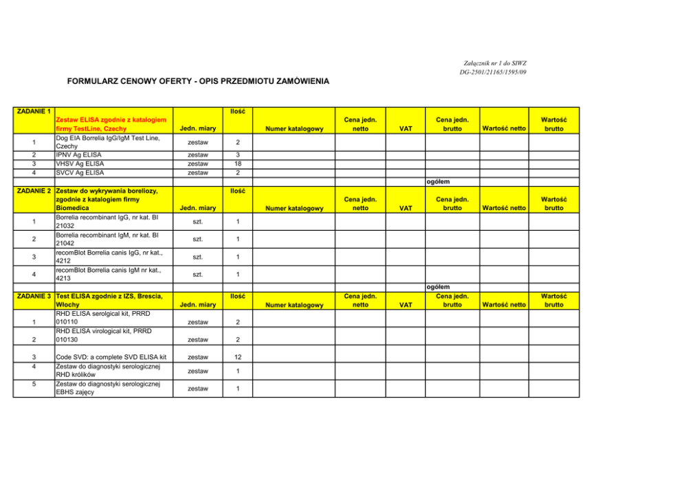 Załącznik nr 1 do SIWZ DG-2501/21165/1595/09 FORMULARZ CENOWY OFERTY - OPIS PRZEDMIOTU ZAMÓWIENIA Ilość ZADANIE 1 1 2 3 4 Zestaw ELISA zgodnie z katalogiem firmy TestLine, Czechy Dog EIA Borrelia IgG/IgM Test Line, Czechy IPNV Ag ELISA VHSV Ag ELISA SVCV Ag ELISA Numer katalogowy Jedn. miary zestaw 2 zestaw zestaw zestaw 3 18 2 Cena jedn. netto VAT Cena jedn. brutto Wartość netto Wartość brutto ogółem ZADANIE 2 Zestaw do wykrywania boreliozy, zgodnie z katalogiem firmy Biomedica Borrelia recombinant IgG, nr kat. BI 1 21032 Borrelia recombinant IgM, nr kat. BI 2 21042 recomBlot Borrelia canis IgG, nr kat., 3 4212 recomBlot Borrelia canis IgM nr kat., 4 4213 ZADANIE 3 Test ELISA zgodnie z IZS, Brescia, Włochy RHD ELISA serolgical kit, PRRD 010110 1 RHD ELISA virological kit, PRRD 010130 2 3 4 5 Code SVD: a complete SVD ELISA kit Zestaw do diagnostyki serologicznej RHD królików Zestaw do diagnostyki serologicznej EBHS zajęcy Ilość Jedn. miary szt. 1 szt. 1 szt. 1 szt. 1 Numer katalogowy Cena jedn. netto Numer katalogowy Cena jedn. netto Ilość Jedn. miary zestaw 2 zestaw 2 zestaw 12 zestaw 1 zestaw 1 VAT Cena jedn. brutto Wartość netto Wartość brutto VAT ogółem Cena jedn. brutto Wartość netto Wartość brutto 6 Zestaw do diagnostyki wirusologicznej RHD królików i EBHS zajęcy zestaw 1 Koszt transportu 3 zestawów ZADANIE 4 Zestaw EIA zgodnie z katalogiem firmy OXOID 1 IDEIA ™Norovirus, nr kat K604411 ProSpecT ROTAVIRUS TEST nr. Kat. 2 R240396 Accessory Reagents for PMT Serology 3 nr kat. K003811-9 OXOID - Mycoplasma 4 hypopneumoniae, 1-płytkowy, nr kat K004311 OXOID - ROTAWIRUSY, 15 płytkowy, nr kat. K602011 Test ELISA Pasterella multocida PMT 6 ELIS nr kat. K000911-9 ZADANIE 5 Test ELISA zgodnie z katalogiem firmy Assay Design Zestaw immunoenzymatyczny do ozn.: Prostaglandyna F2alfa, 1 płytka, nr kat. 900-069, Prospecta 1 Numer katalogowy Cena jedn. netto Numer katalogowy Cena jedn. netto Numer katalogowy Cena jedn. netto Ilość Jedn. miary szt 1 szt 3 zestaw 45 op 55 op 2 zestaw 47 Ilość Jedn. miary zest. 3 zest. 3 zest. 3 zest. 3 VAT ogółem Cena jedn. brutto Wartość netto Wartość brutto VAT ogółem Cena jedn. brutto Wartość netto Wartość brutto VAT ogółem Cena jedn. brutto Wartość netto Wartość brutto Zestaw immunoenzymatyczny do ozn.: Tromboxan B2, 1 płytka, nr kat. 900002, Prospecta 2 3 4 Zestaw immunoenzymatyczny do ozn. PGE, 1 płytka, nr kat. 900-001, Prospecta Zestaw immunoenzymatyczny do ozn.: Leukotrien B4, 1 płytka, nr kat. 900-068, Prospecta ZADANIE 6 Test ELISA zgodnie z katalogiem firmy Pourquier Ilość Jedn. miary 1 2 3 4 5 6 Zestaw ELISA IBR gB scrinning Zestaw IBR ELISA IBR Serum / Milk Zestaw ELISA IBR verif. ELISA BVD-MD-BD P80 Antibodies; P00645 ELISA Bluetongue Serum; kat. P004505 Zestaw ELISA do BLV skryning PO 2110 Zestaw ELISA do BLV potwierdzenia do POURQUIER PO 2120 op. op. op. 10 1 2 op. 2 op. 1 szt. 3 szt 1 szt. 2 szt. 8 szt. 8 zestaw 3 zestaw 2 zestaw zestaw 1 5 Test ELISA w kier M.avium supsp. paratuberculosis Laboratoire Pourquier szt. 8 ELISA brucellosis individual and pool serum screening, 10 płytkowy, P04130 szt. 2 ELISA bovine brucellosis milk screening, 10 płytkowy, P04210 szt. 1 7 8 Test Elisa Kit Chlamydia Abortus Serum Verification, 230 Reactions; nr kat. P00700 Zestaw do oznaczania CBPP Elisa-Test (Screening-800 Tests), nr kat. P05410 9 10 11 12 13 14 15 16 17 Zestaw do oznaczania M. agalactiae Elisa-Test (Verification-400 Tests), nr kat. P00400 ELISA Bovine Leucosis Blocking 10 płytek nr PO2140 ELISA Bovine Leucosis Serum Verification 10 płytek nr PO2120 ELISA Bovine Leucosis Serum Sreening 10 pytek nr PO2110 ELISA MVV/CAEV Verification ZADANIE 7 Test ELISA zgodnie z katalogiem firmy Bio-X Mycoplasma bovis Elisa Test BIO K162, Biolab 1 Ilość Numer katalogowy Jedn. miary szt. 18 Cena jedn. netto VAT ogółem Cena jedn. brutto Wartość netto Wartość brutto 2 Pulmotest Mycoplasma bovis BIO K121, Biolab szt. 18 3 zestawy ELISA do wykrywania toksyny Alfa C.perfringens, prod Bio X nr kat. BIO K 084 zestaw 3 4 zestawy ELISA do wykrywania toksyny Beta C.perfringens, prod Bio X nr kat. BIO K 094 zestaw 3 ZADANIE 8 Test ELISA zgodnie z katalogiem firmy Cirad Kit CFT PPCB 1000 serums + plaque, nr kat. 02230085, Cirad 1 ZADANIE 9 Test ELISA zgodnie z katalogiem firmy Tridelta Zestaw do oznaczania Haptoglobuliny u bydła, nr kat. TP801, Tridelta 1 Zestaw do oznaczania surowiczego Amyloidu A, nr kat. TP802, Tridelta 2 ZADANIE 10 Test ELISA zgodnie z katalogiem firmy Synbiotics 1 Test do BVD-MD Ag Zestaw SERELISA BLV BI INDIRECT SYNBIOTICS 2 Zestaw Leucose Bovine AGID do BLV SYMBIOTICS 3 Serelisa TM BLV AB Mino Blocking 4 płytki 4 Numer katalogowy Cena jedn. netto Numer katalogowy Cena jedn. netto Numer katalogowy Cena jedn. netto Ilość Jedn. miary szt. VAT ogółem Cena jedn. brutto Wartość netto Wartość brutto VAT ogółem Cena jedn. brutto Wartość netto Wartość brutto VAT ogółem Cena jedn. brutto Wartość netto Wartość brutto 8 Ilość Jedn. miary szt. 4 szt. 4 Ilość Jedn. miary op. 2 szt 2 szt 3 zestaw 1 5 Serelisa BLV Mono Bi indirect 4 płytki zestaw 1 szt. 1 6 Test ELISA AI dla kur Synbiotics, nr kat. AUCAIV+450, 5 płytek, termin ważności ok. 12 miesięcy szt. 1 7 Test ELISA ND dla kur Synbiotics, nr kat. AUCNDV+450, 5 płytek, Centrowet Bydgoszcz, termin ważności ok. 12 miesięcy 8 9 10 11 12 Test ELISA MG dla kur Synbiotics, 5 płytek, nr kat. AUCMG900, Centrowet Bydgoszcz, termin ważności ok. 12 miesięcy szt. 1 Test ELISA MG dla indyków Synbiotics, 5 płytek, nr kat.AUTMG900 , Centrowet Bydgoszcz, termin wazności ok. 12 miesięcy szt. 1 Test ELISA MM dla indyków Synbiotics, 5 płytek, nr kat.AUTMM900, termin ważności ok. 12 miesięcy szt. 1 Test ELISA MS dla kur Synbiotics, 5 płytek, nr kat.AUCMS900, termin wazności ok. 12 miesięcy szt. 1 Test ELISA MS dla indyków Synbiotics, 5 płytek, nr kat.AUTMS900, termin wazności ok. 12 miesięcy szt. 1 ZADANIE 11 T
